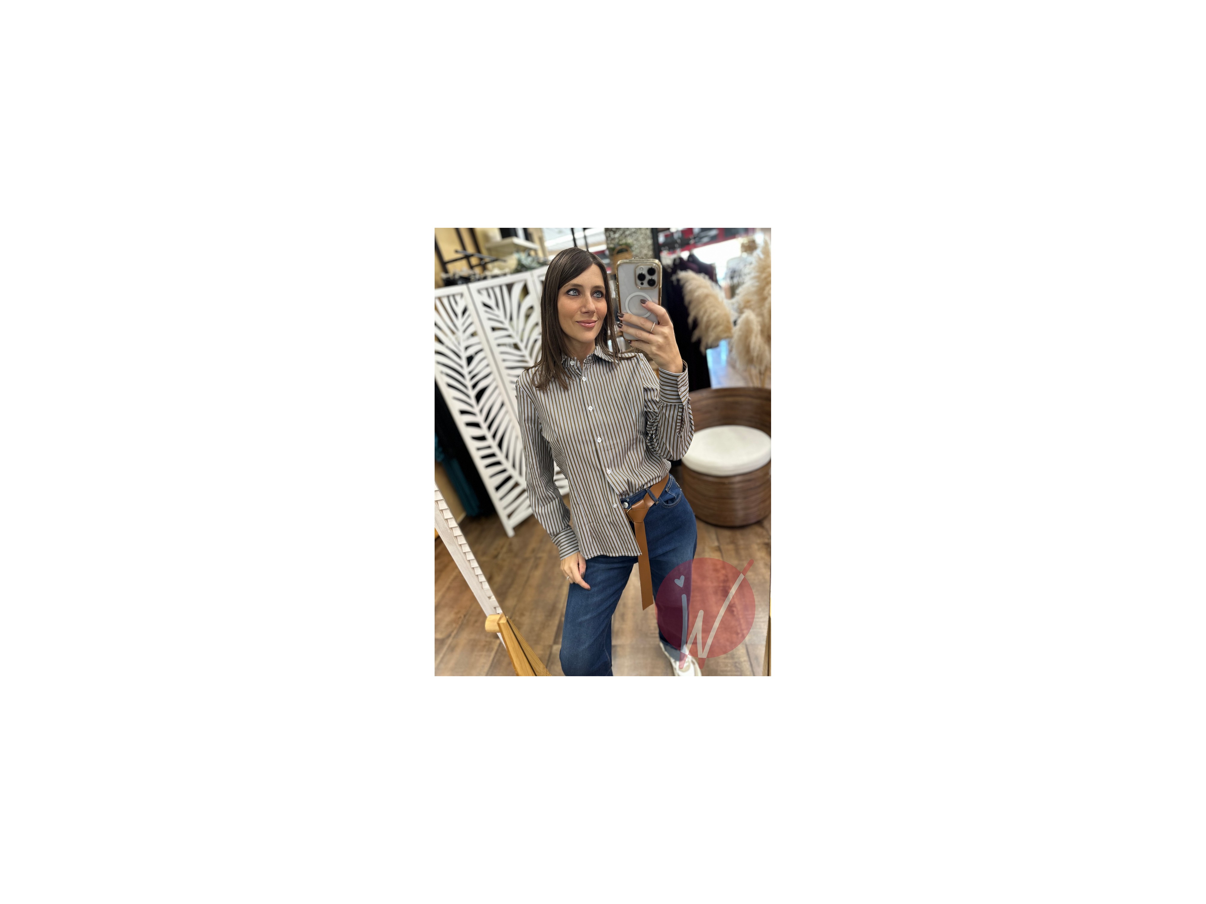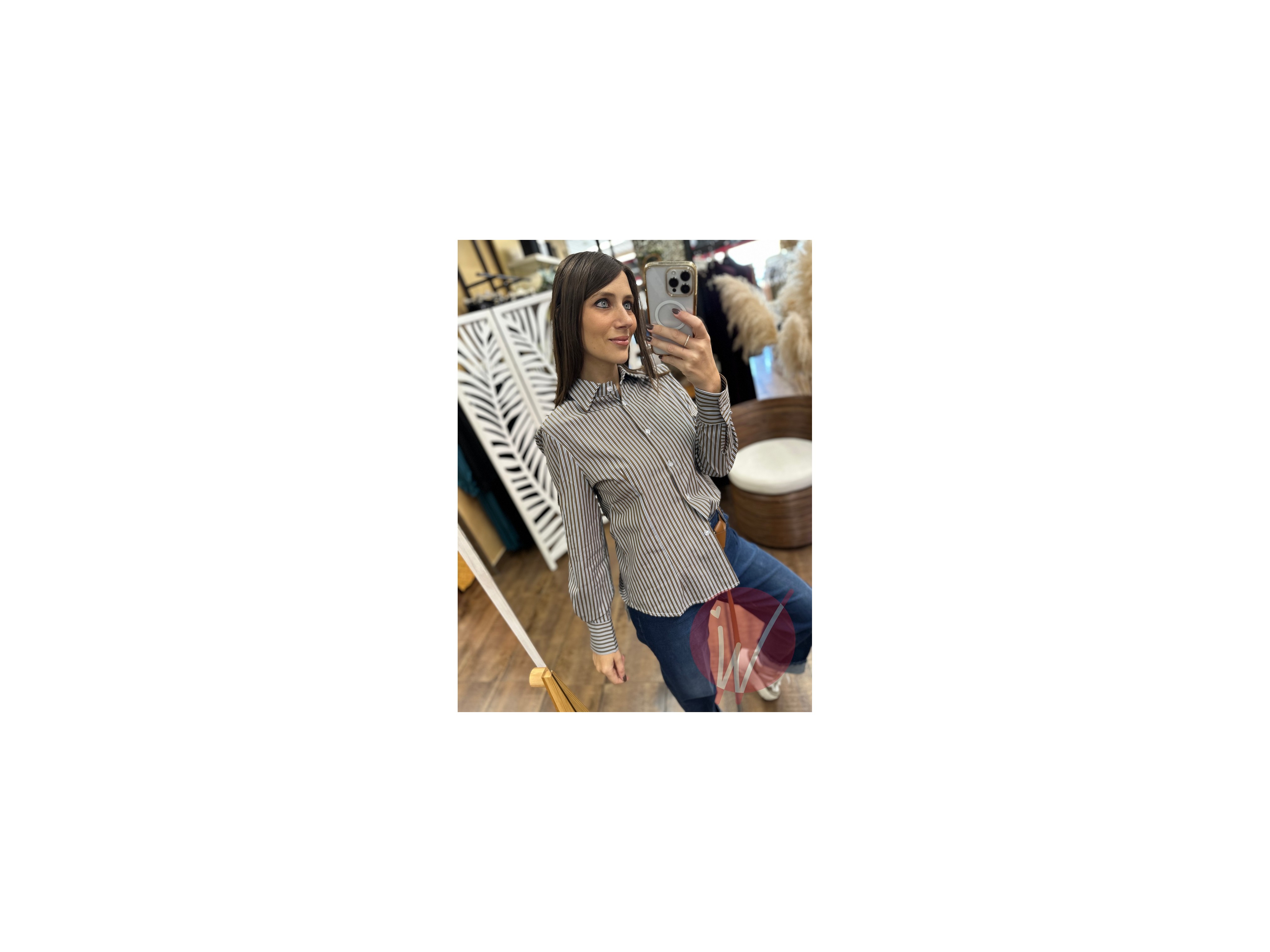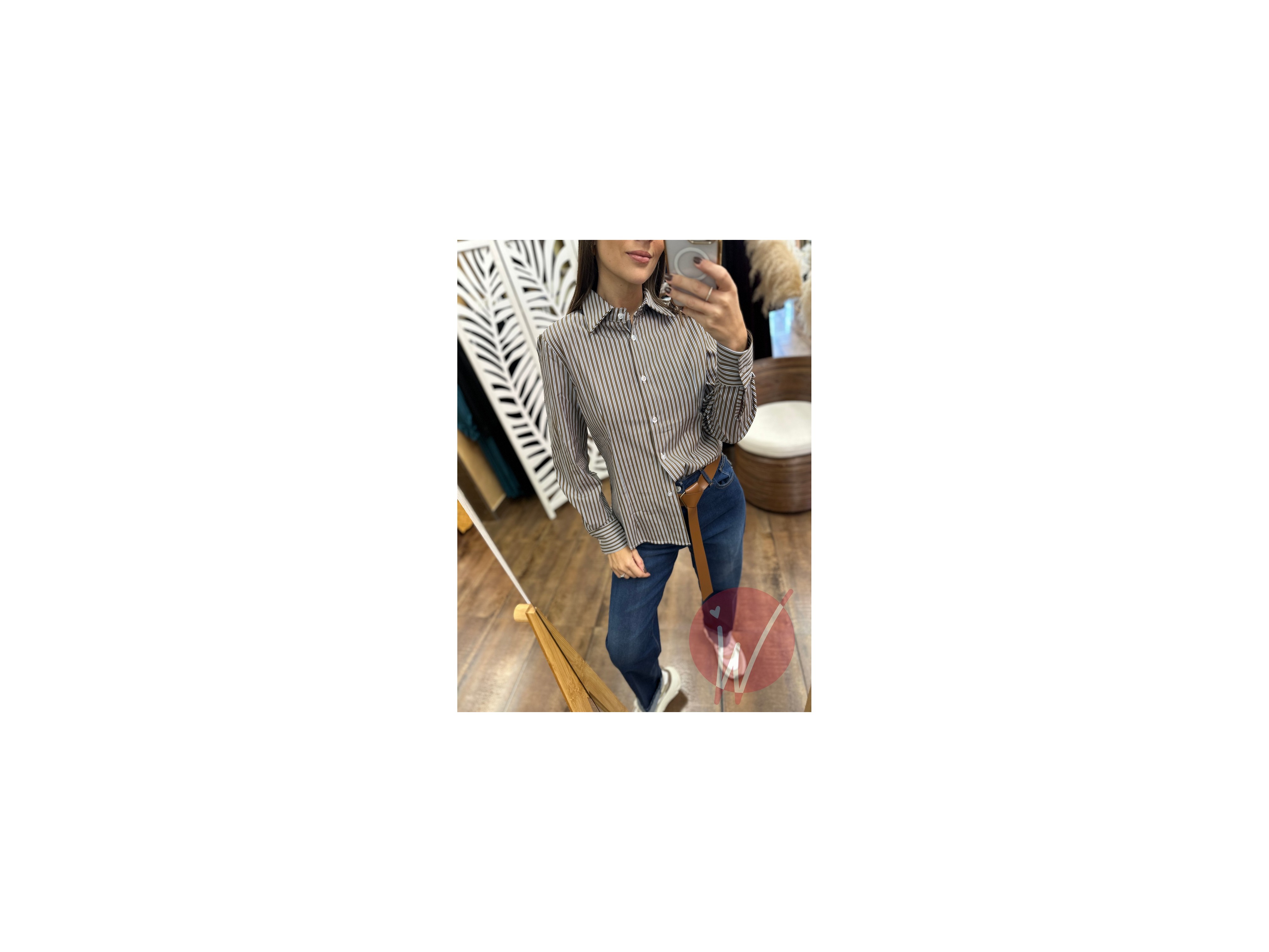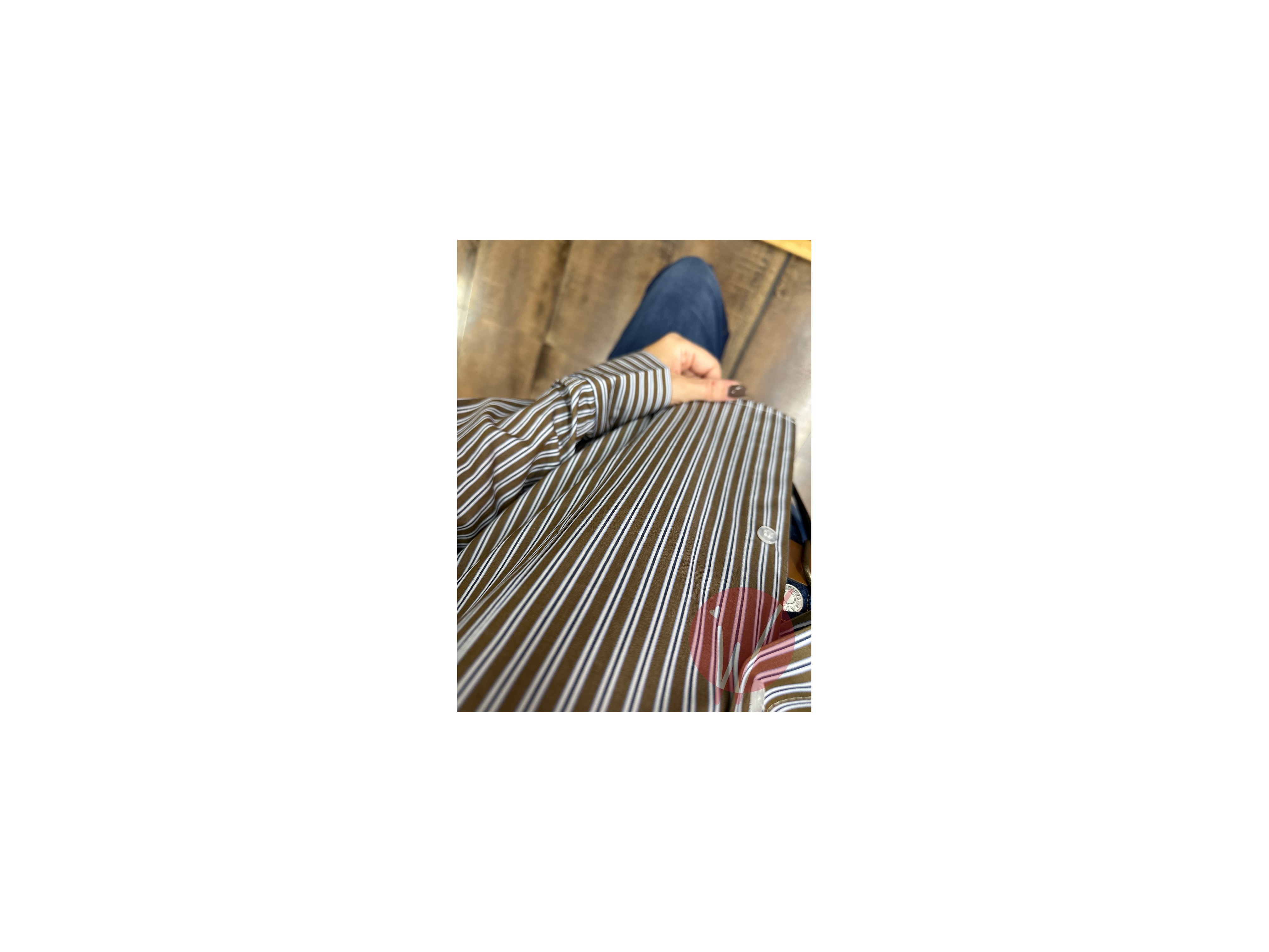 Camicia a righine tricolore su fondo moro, in cotone morbido, taglio leggermente sfiancato, con collo classico e pinces sui polsini.