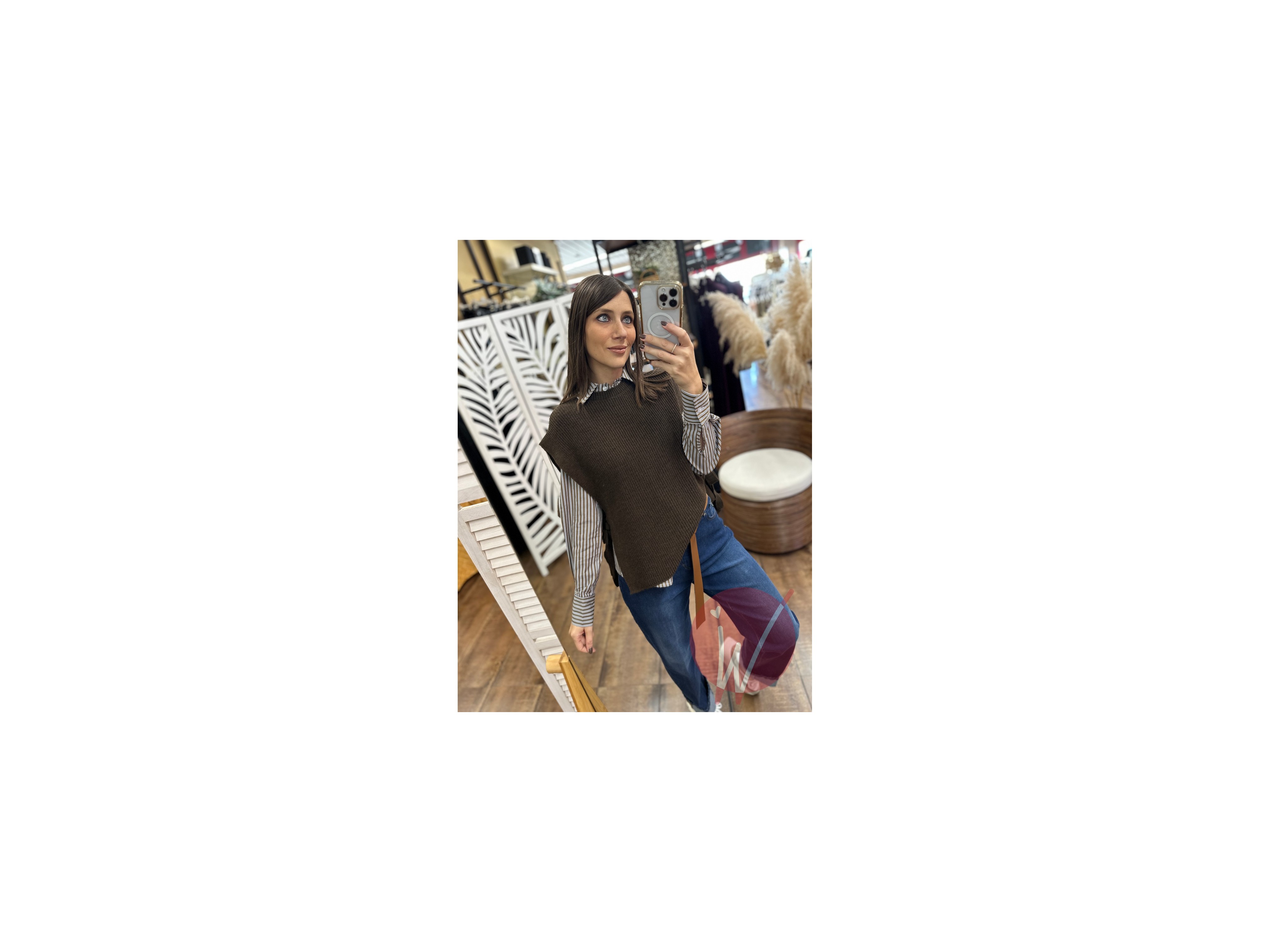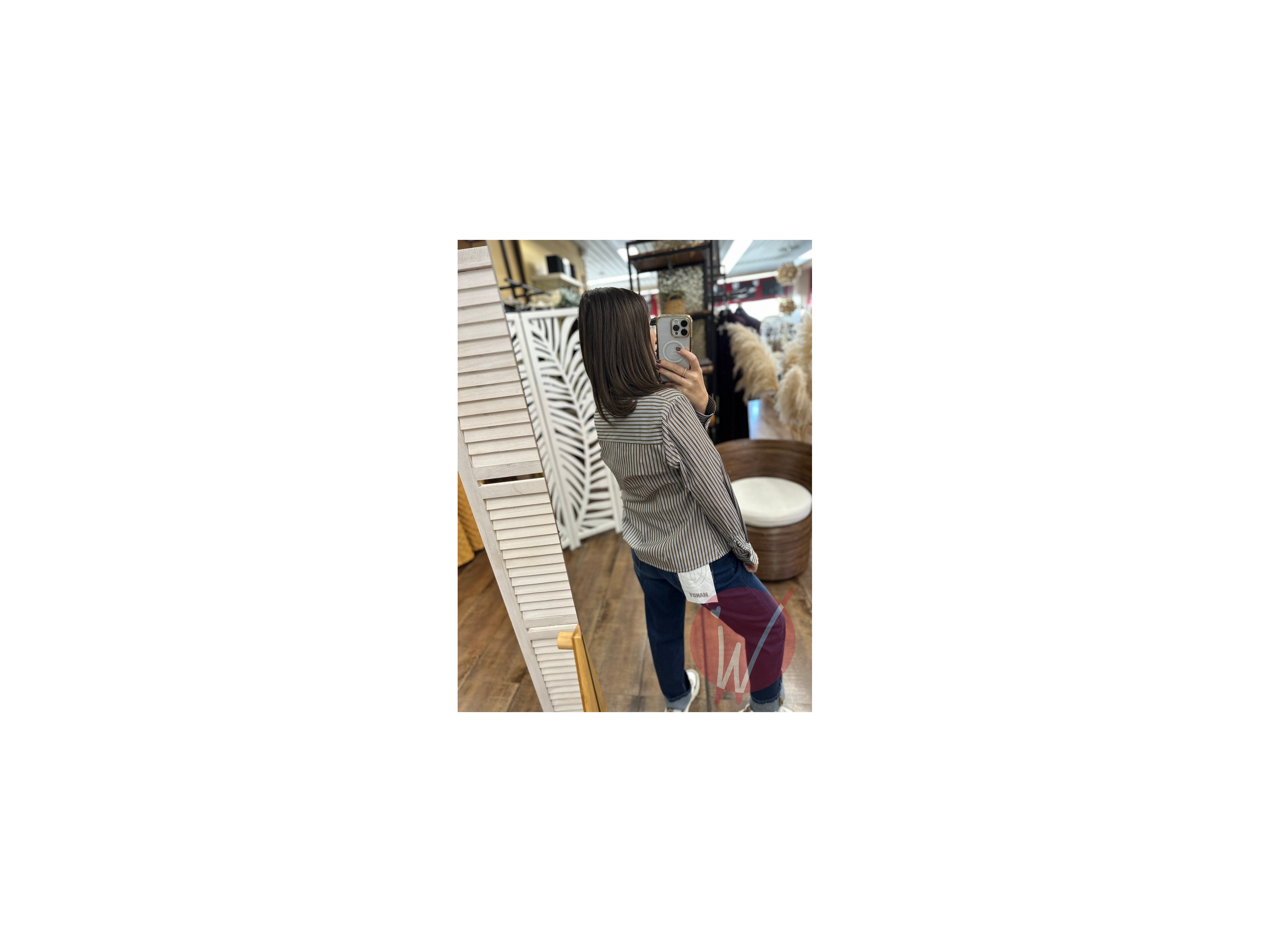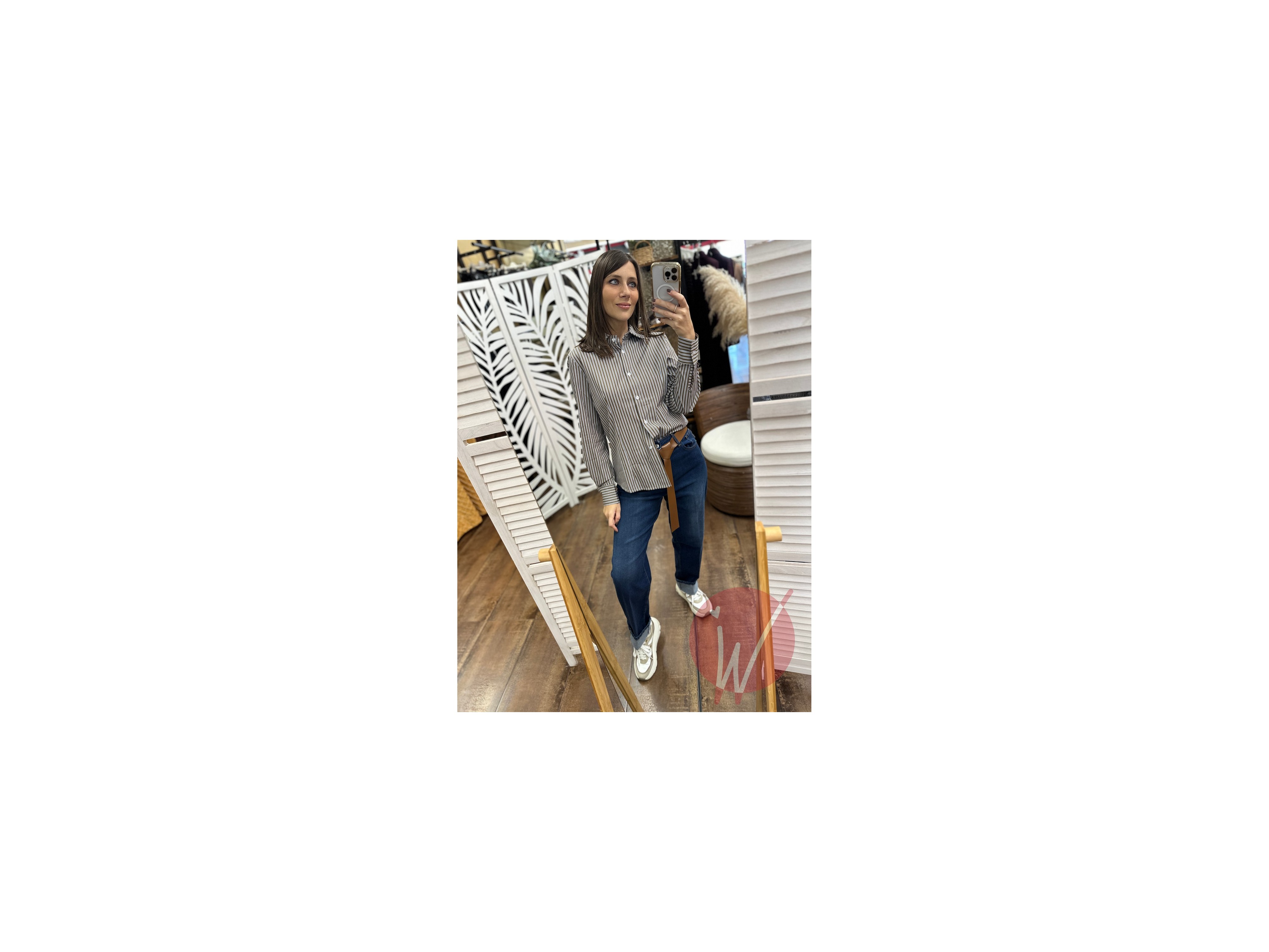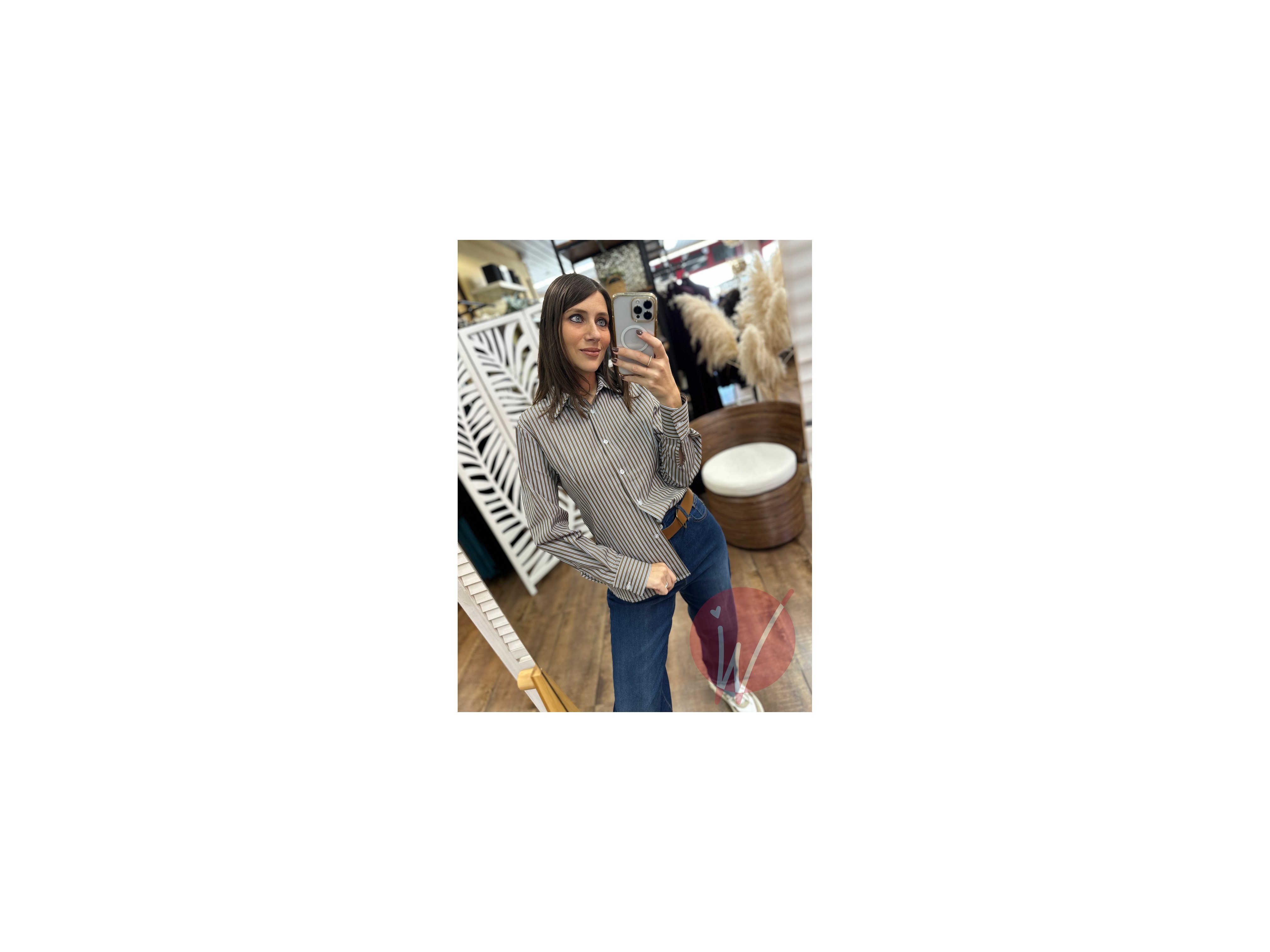 Camicia a righine tricolore su fondo moro, in cotone morbido, taglio leggermente sfiancato, con collo classico e pinces sui polsini.