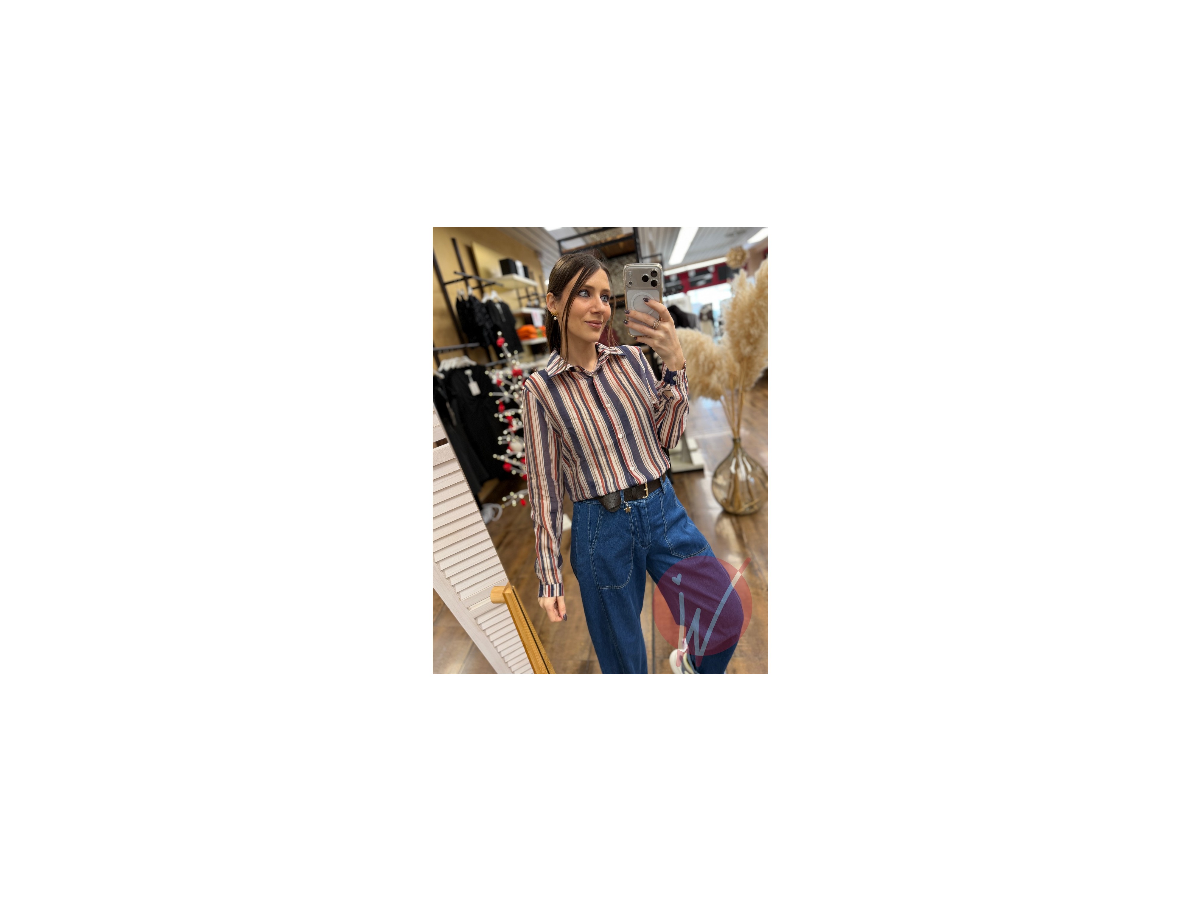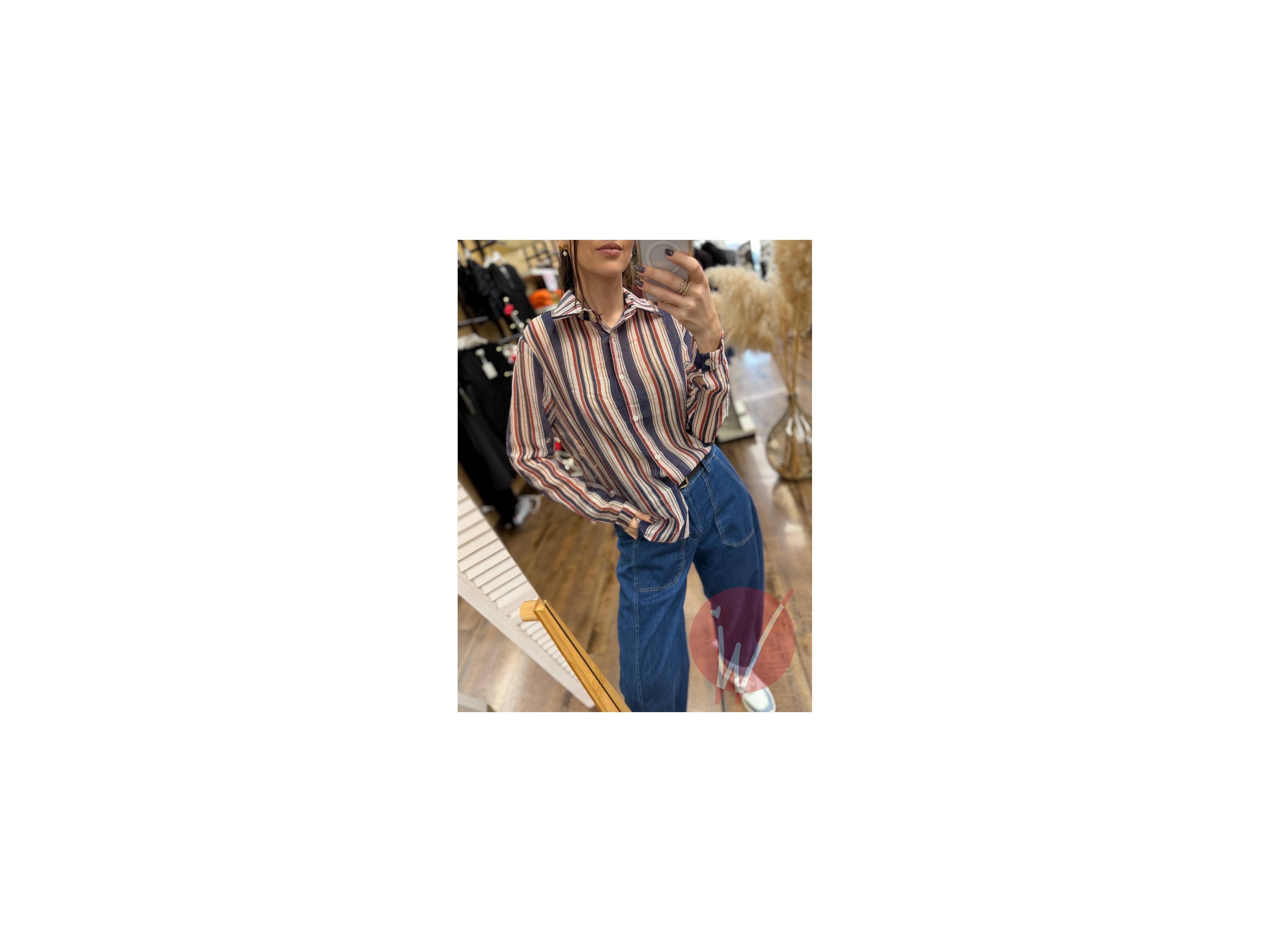 Camicia in simil organza, in fantasia a righe multicolore verticali, vestibilità regolare.