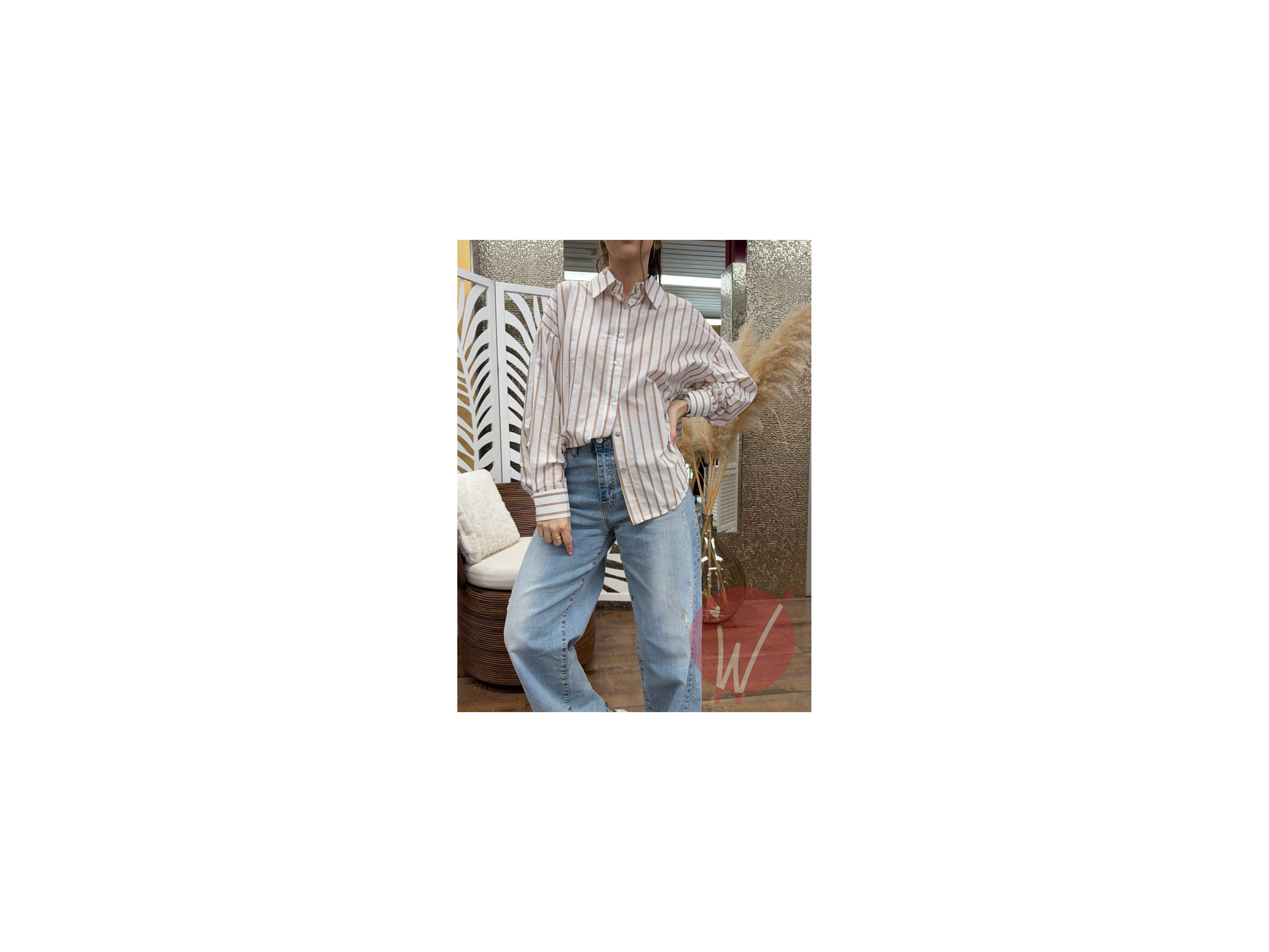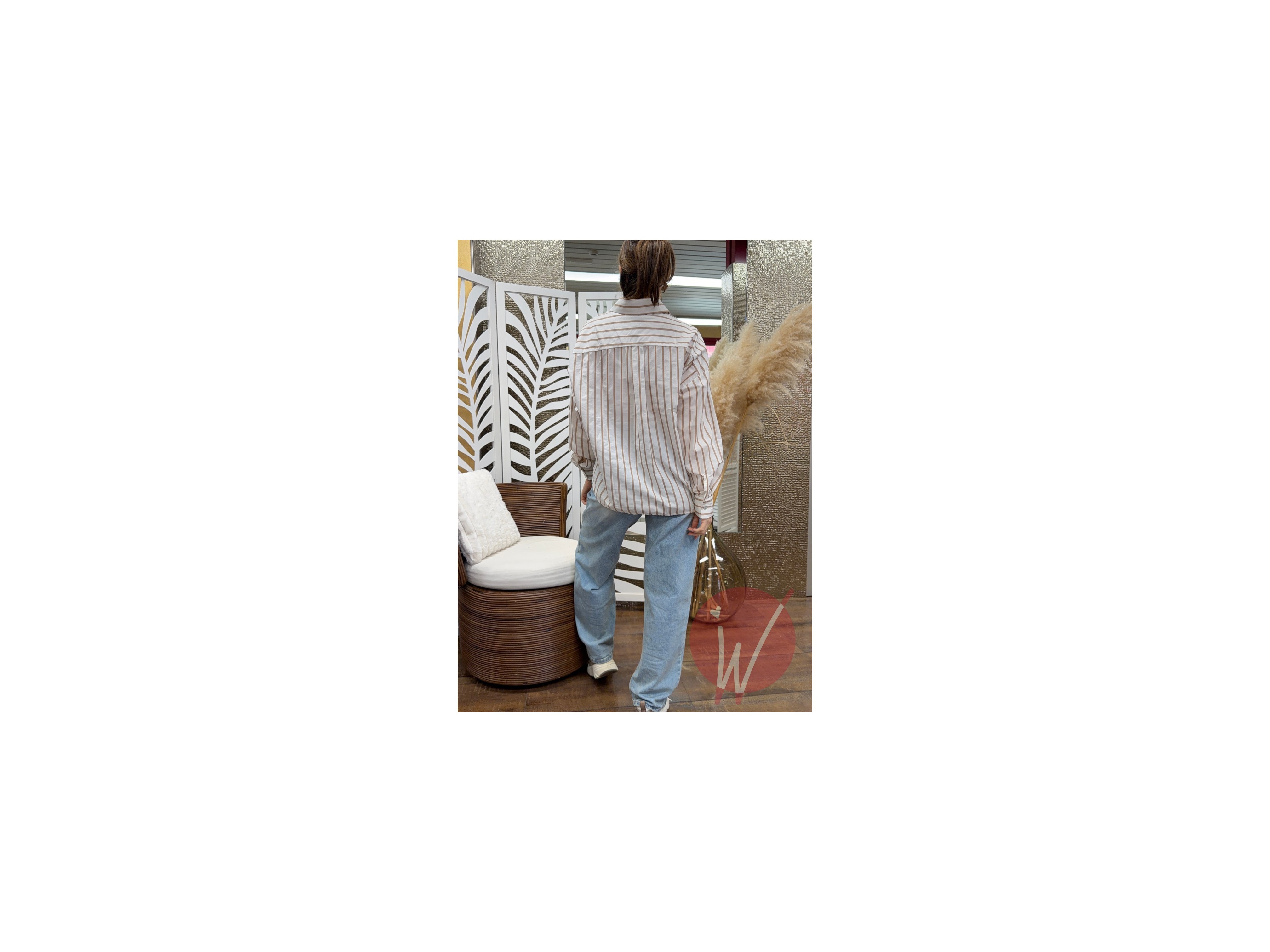 Camicia di cotone a righe, vestibilità over con pince sul retro, ricami e applicazioni di paillettes, leggermente più lunga dietro.