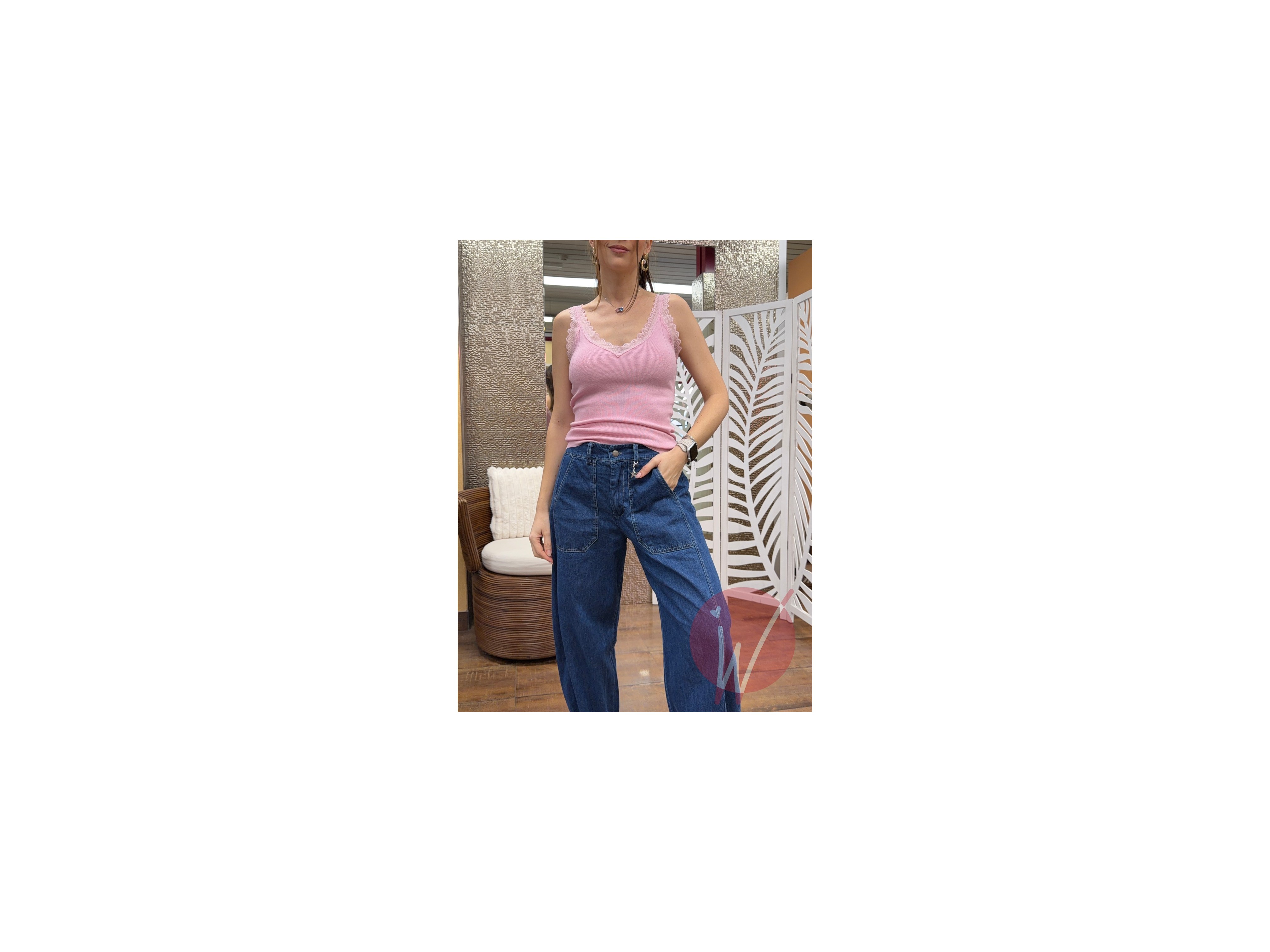 Top canotta in viscosa elasticizzata a costine sottili con bordo e spalline rifinite di morbido pizzo, scollo a v.