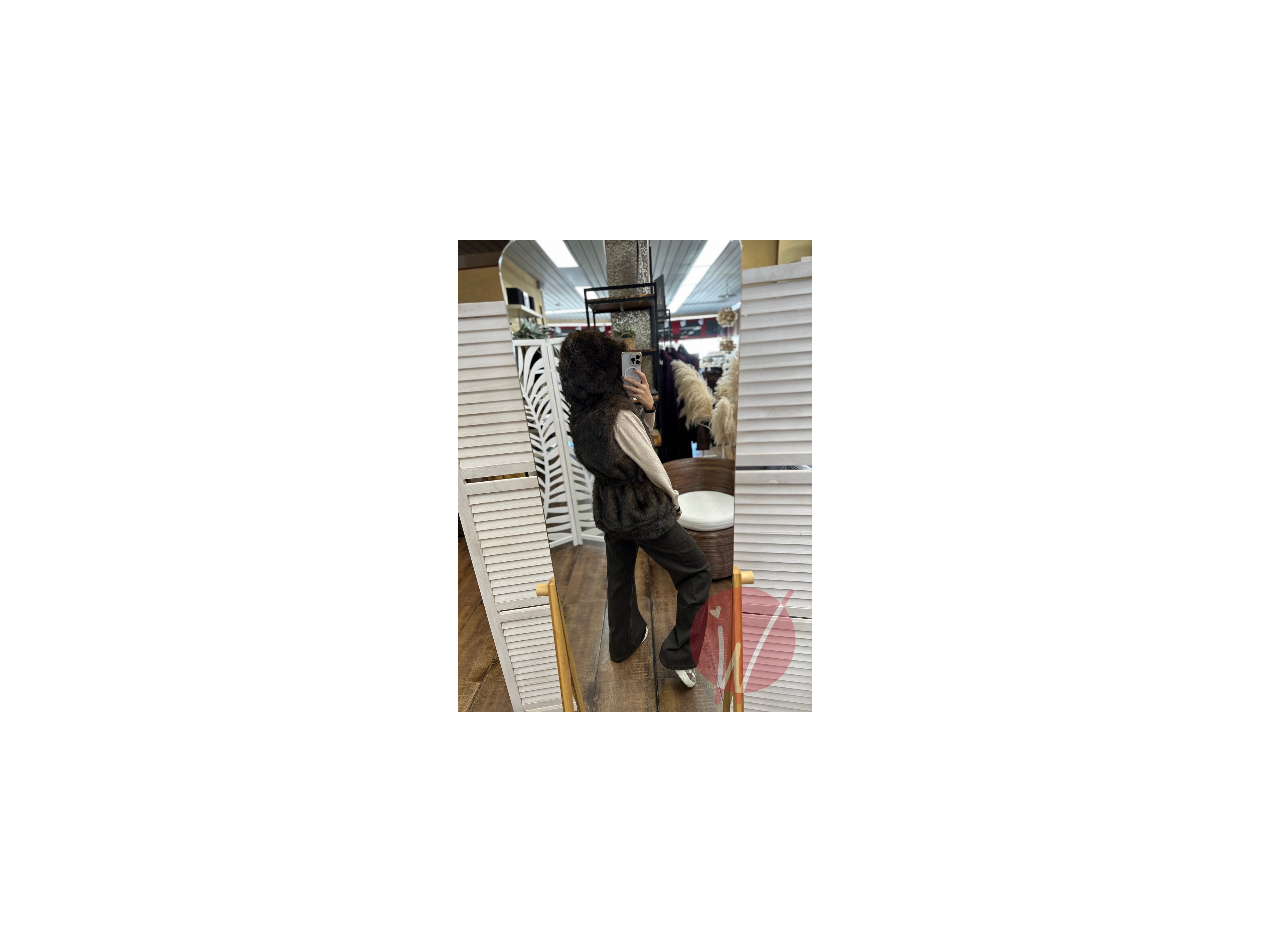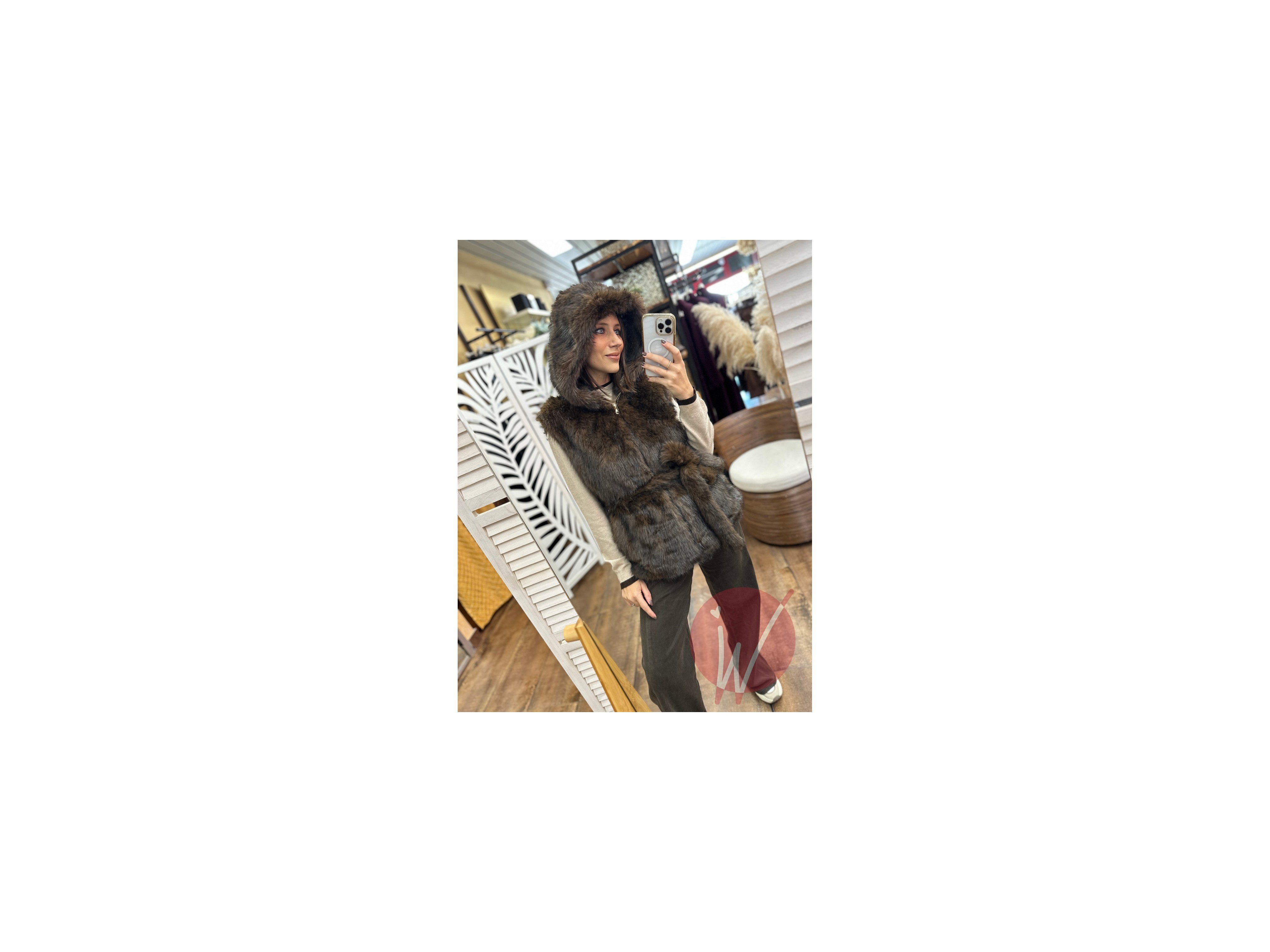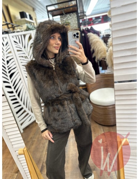 Ecopelliccia smanicata foderata all'interno, con cappuccio e cintura, tasche in piedi laterali, chiusura con zip.