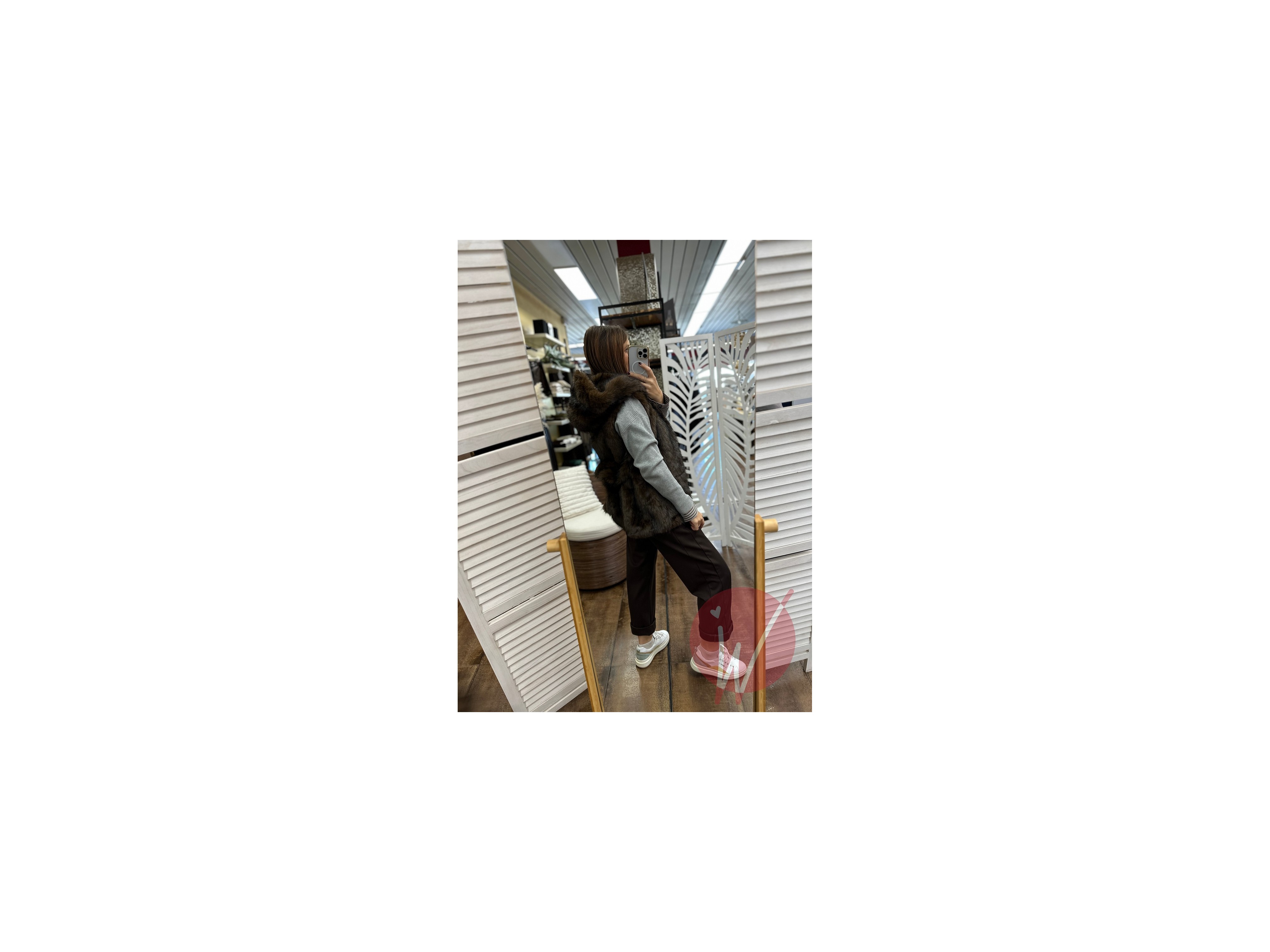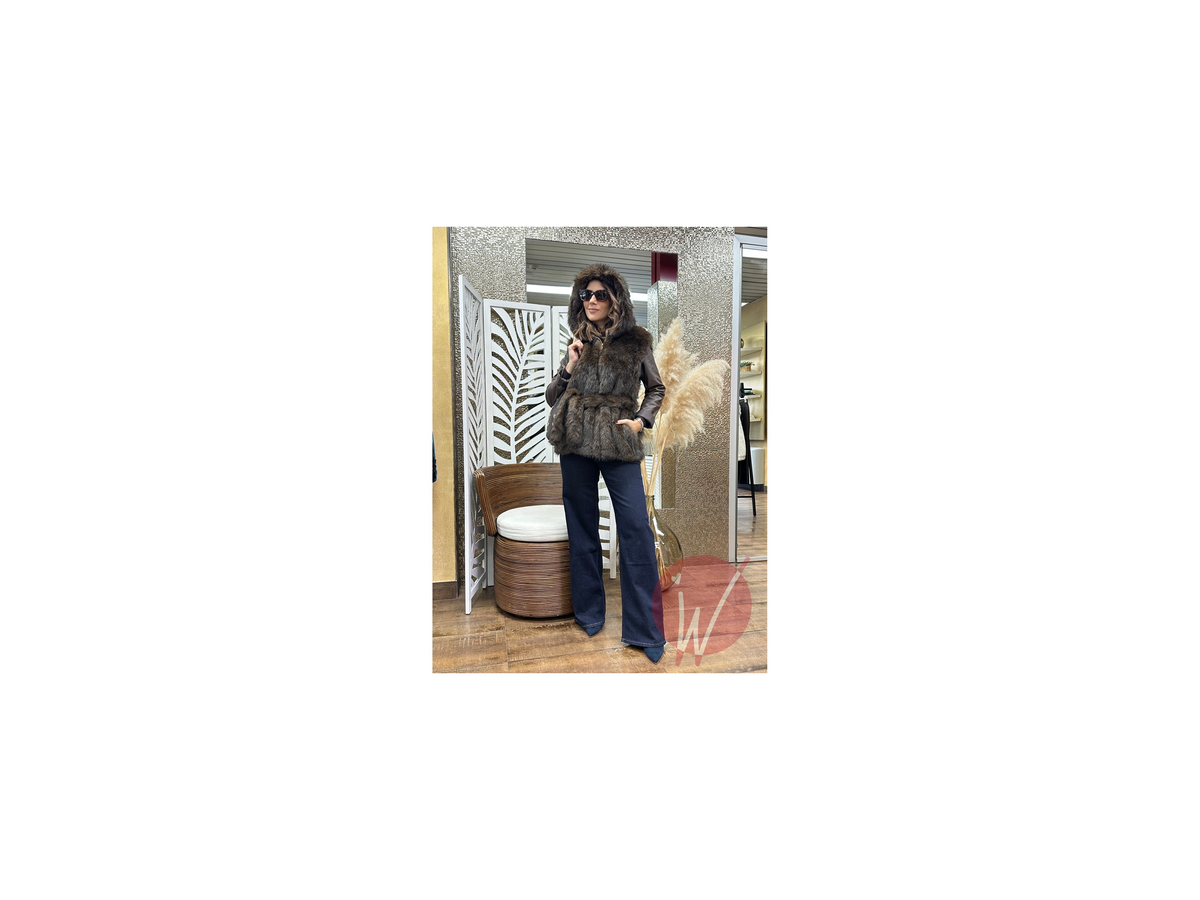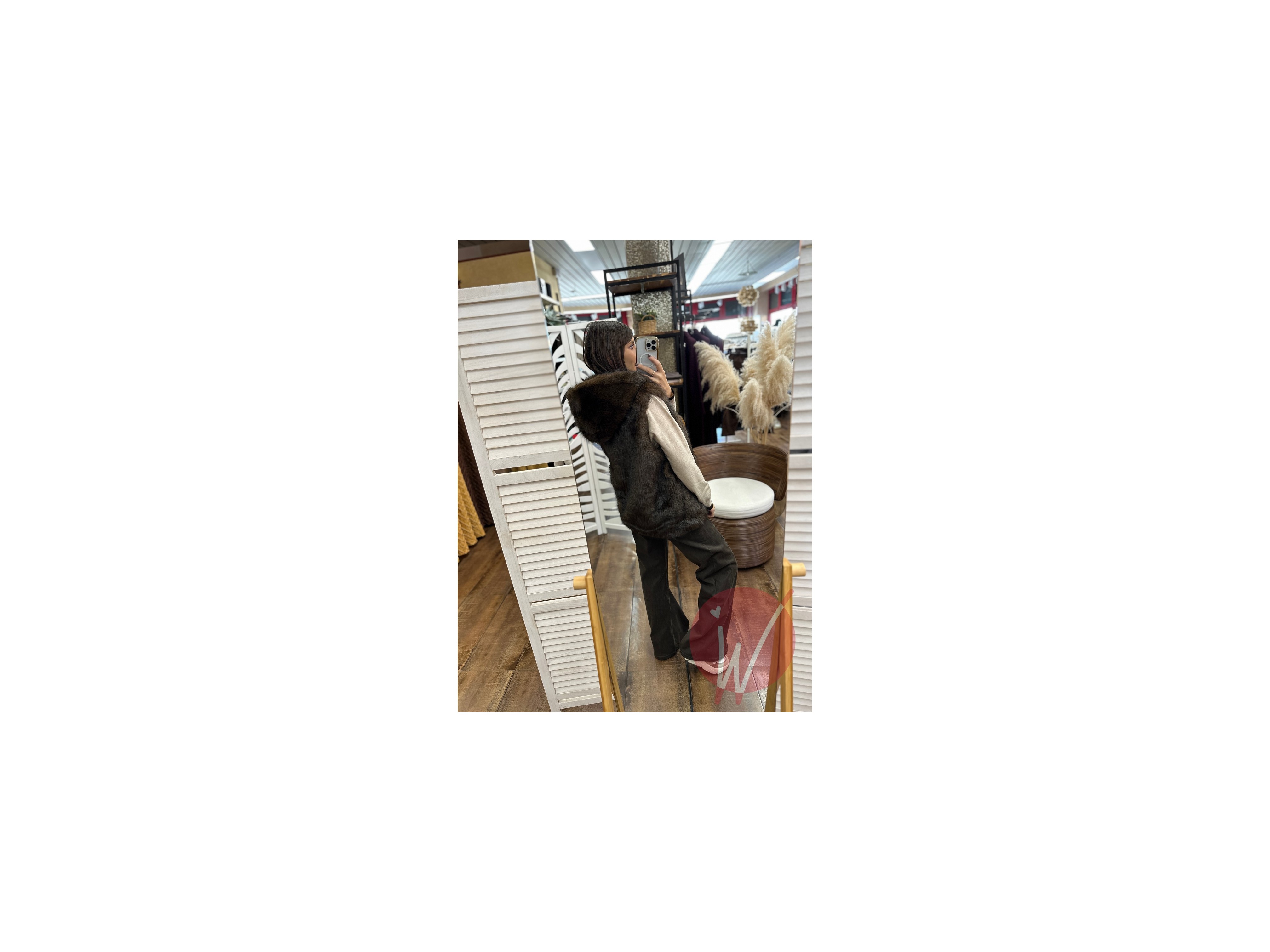 Ecopelliccia smanicata foderata all'interno, con cappuccio e cintura, tasche in piedi laterali, chiusura con zip.
