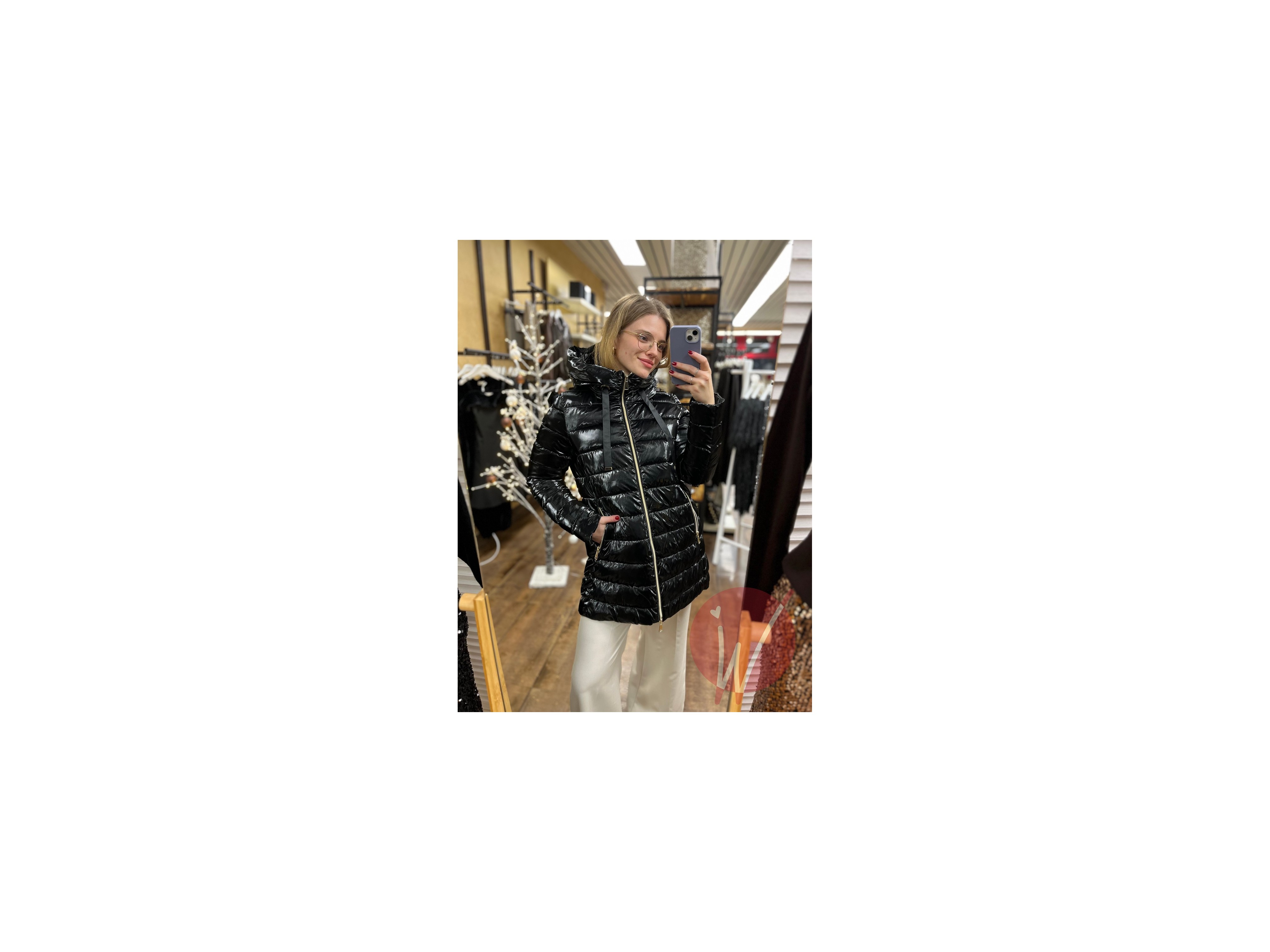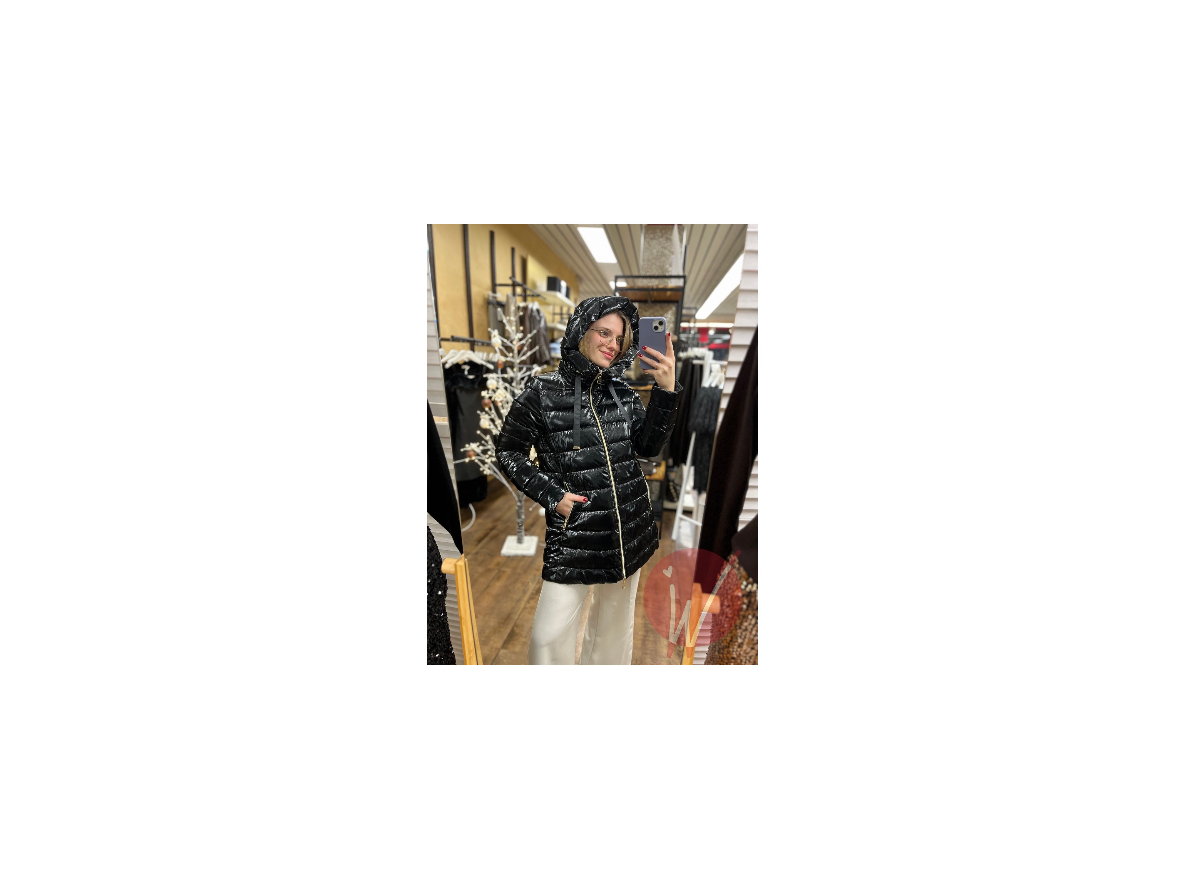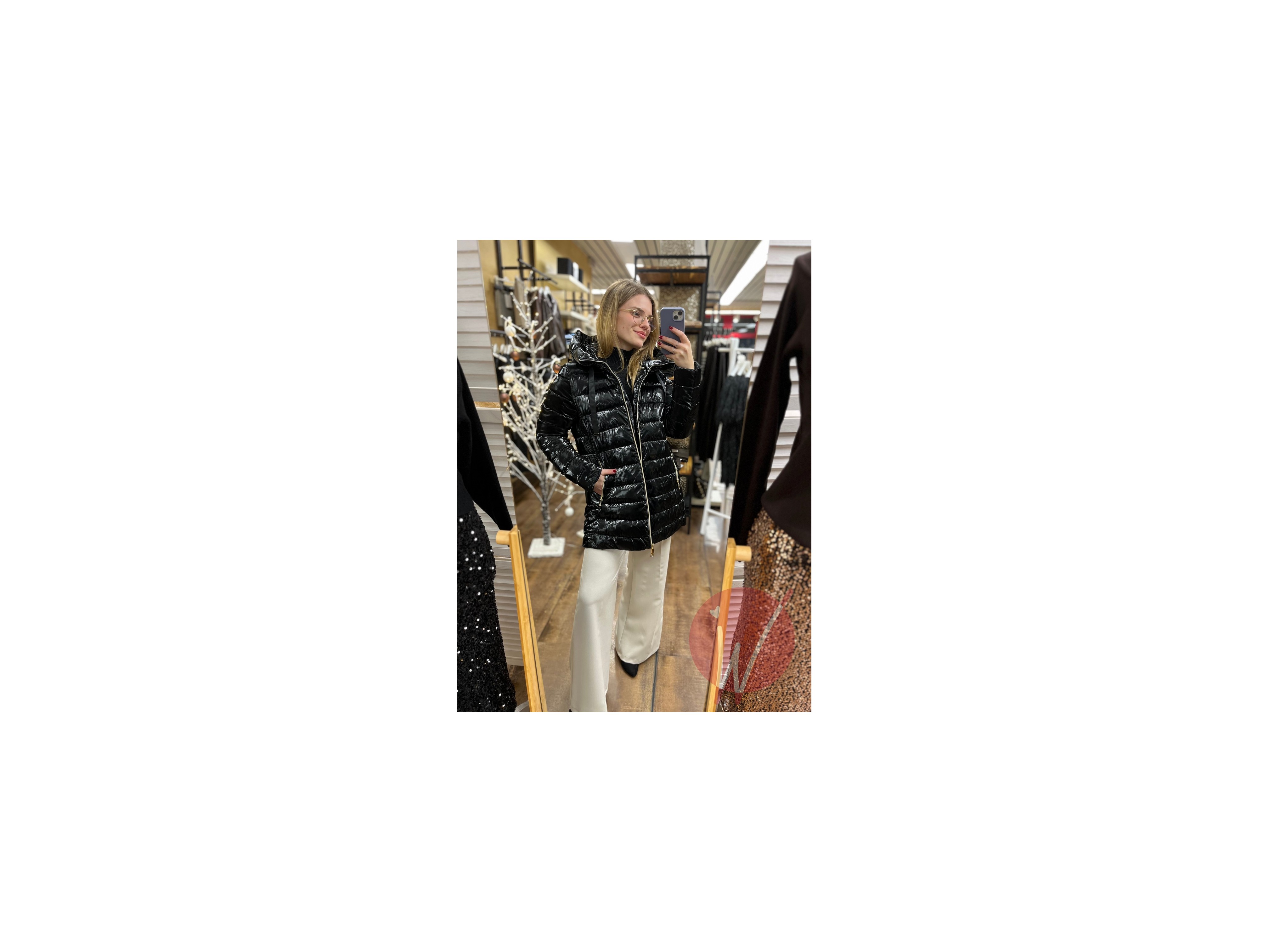Piumino imbottito con zip di chiusura, colorazione metallizzata, con cappuccio, manicotto elasticizzato interno, tasche a lato con zip.