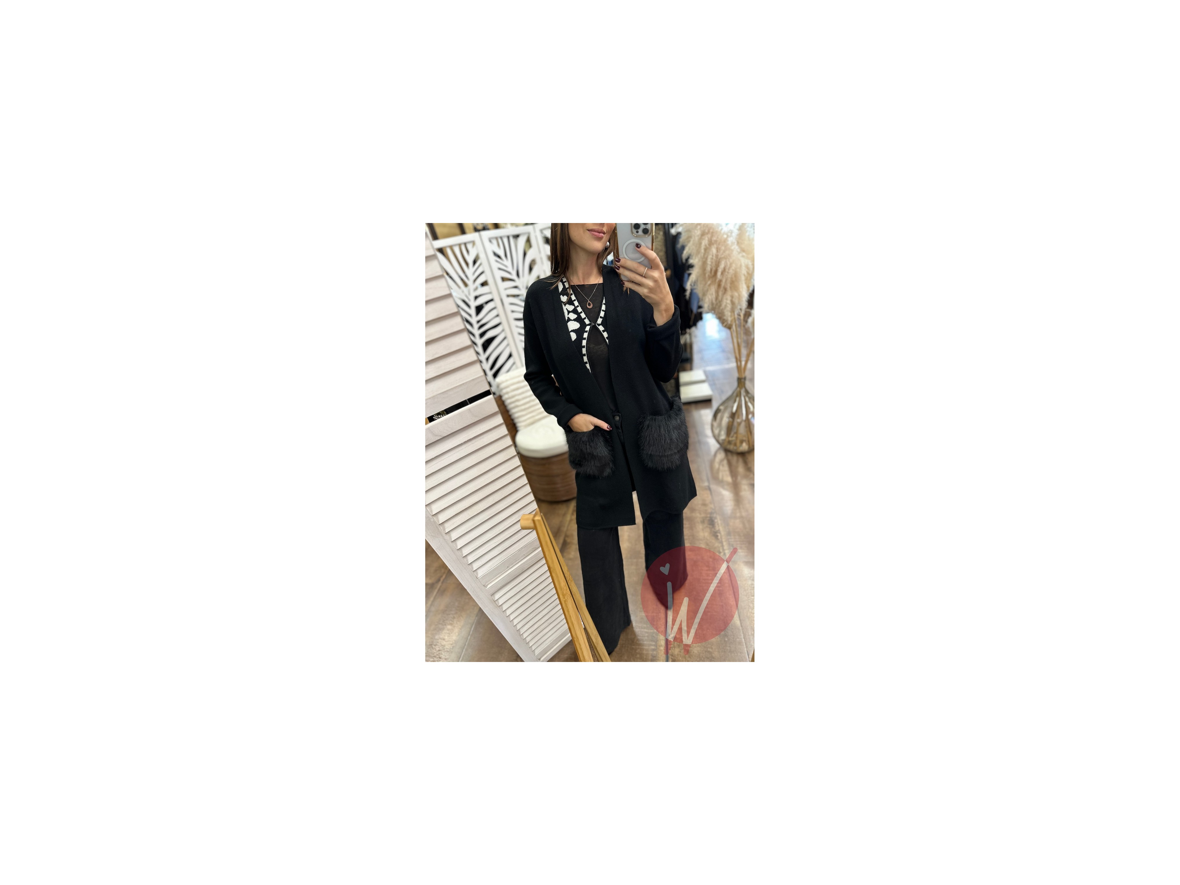 Cardigan a manica lunga in viscosa morbida e calda, tasche profonde rivestite in ecopelliccia.
