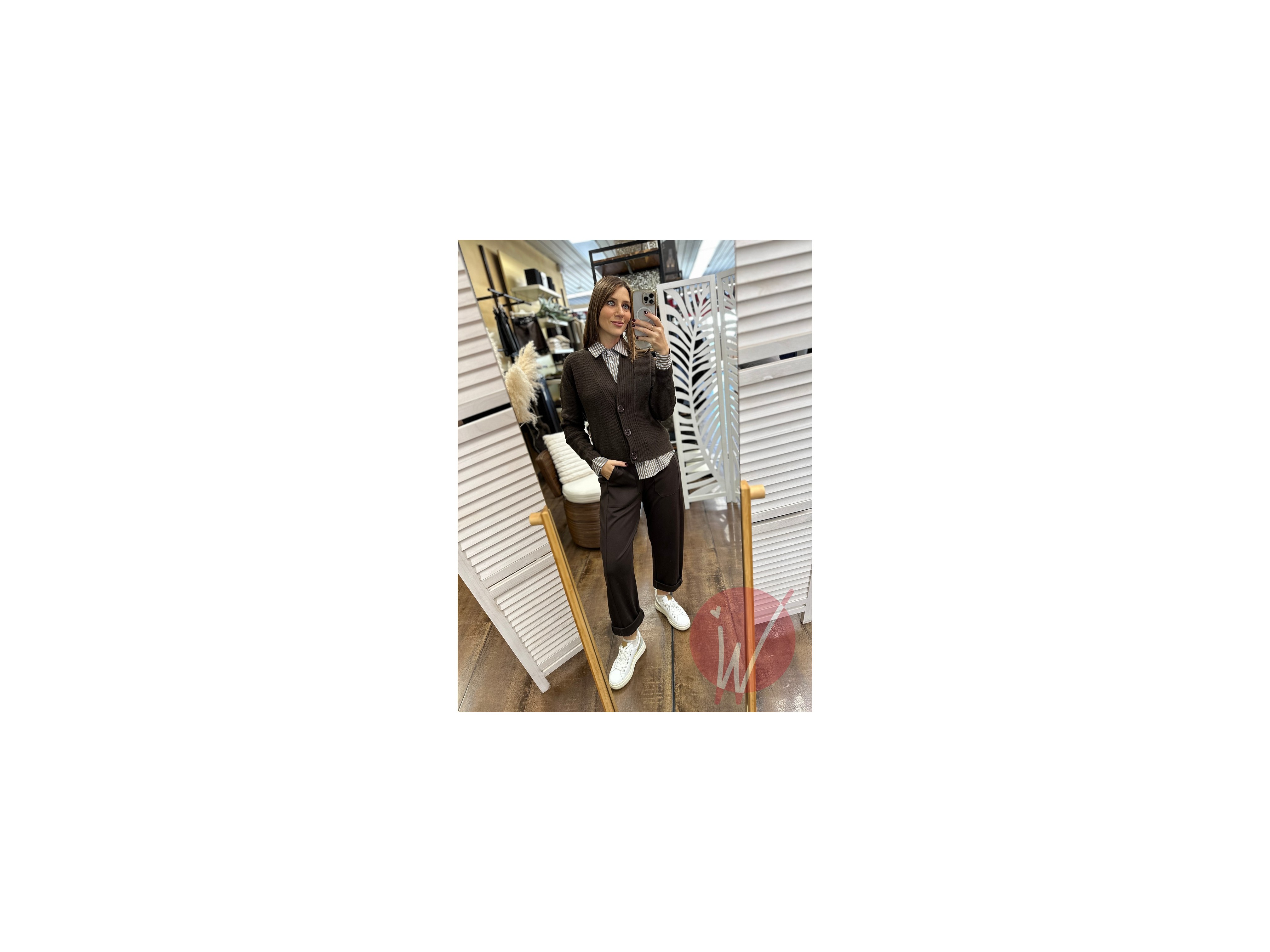 Cardigan in viscosa morbida e calda, lavorazione a costa inglese, collo a costine verticali, chiusura con bottoni davanti.