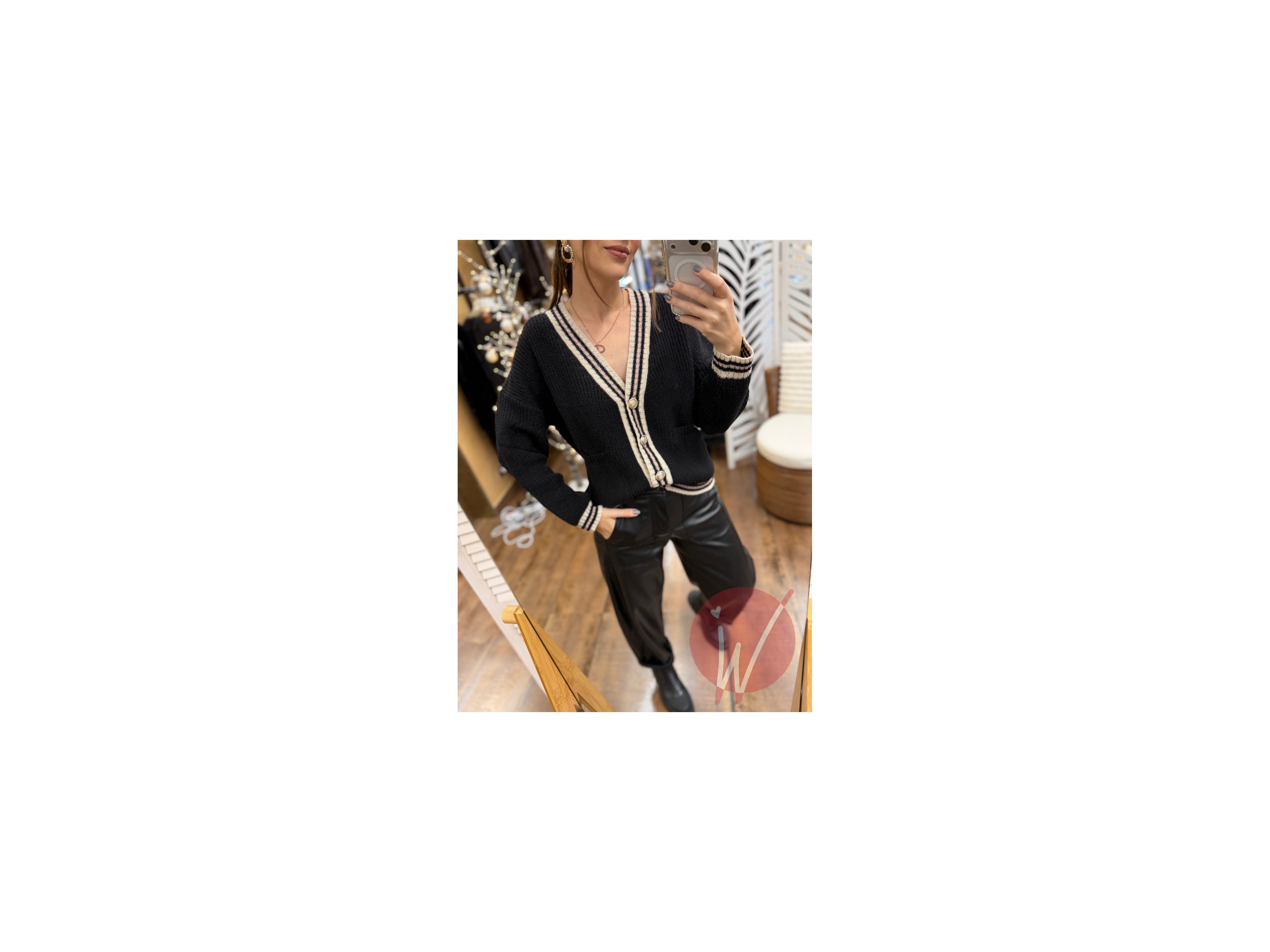 Cardigan corto a coste inglesi, con taschini davanti, scollo a v tricolore a contrasto, con bottoncini effetto metallo.