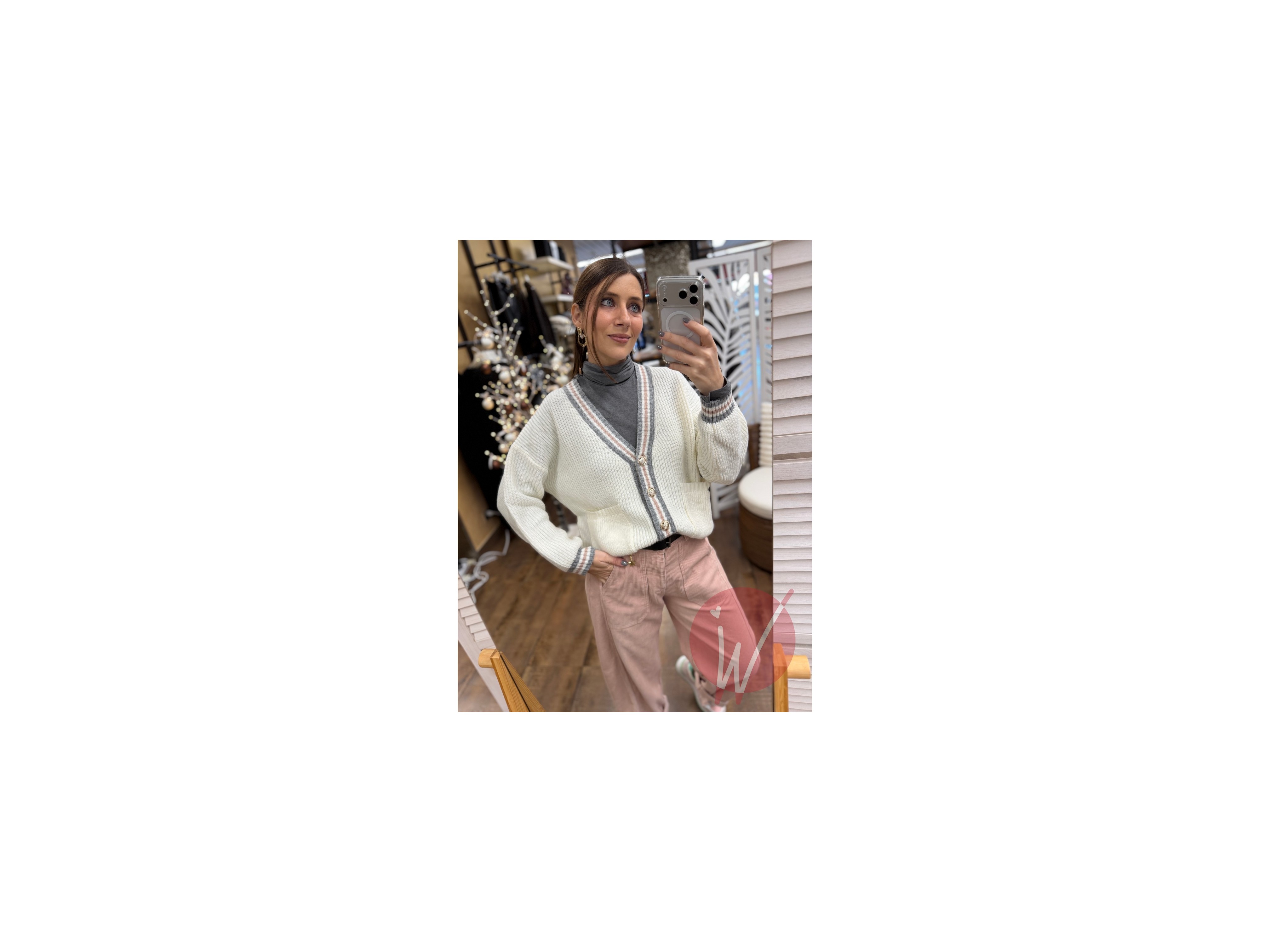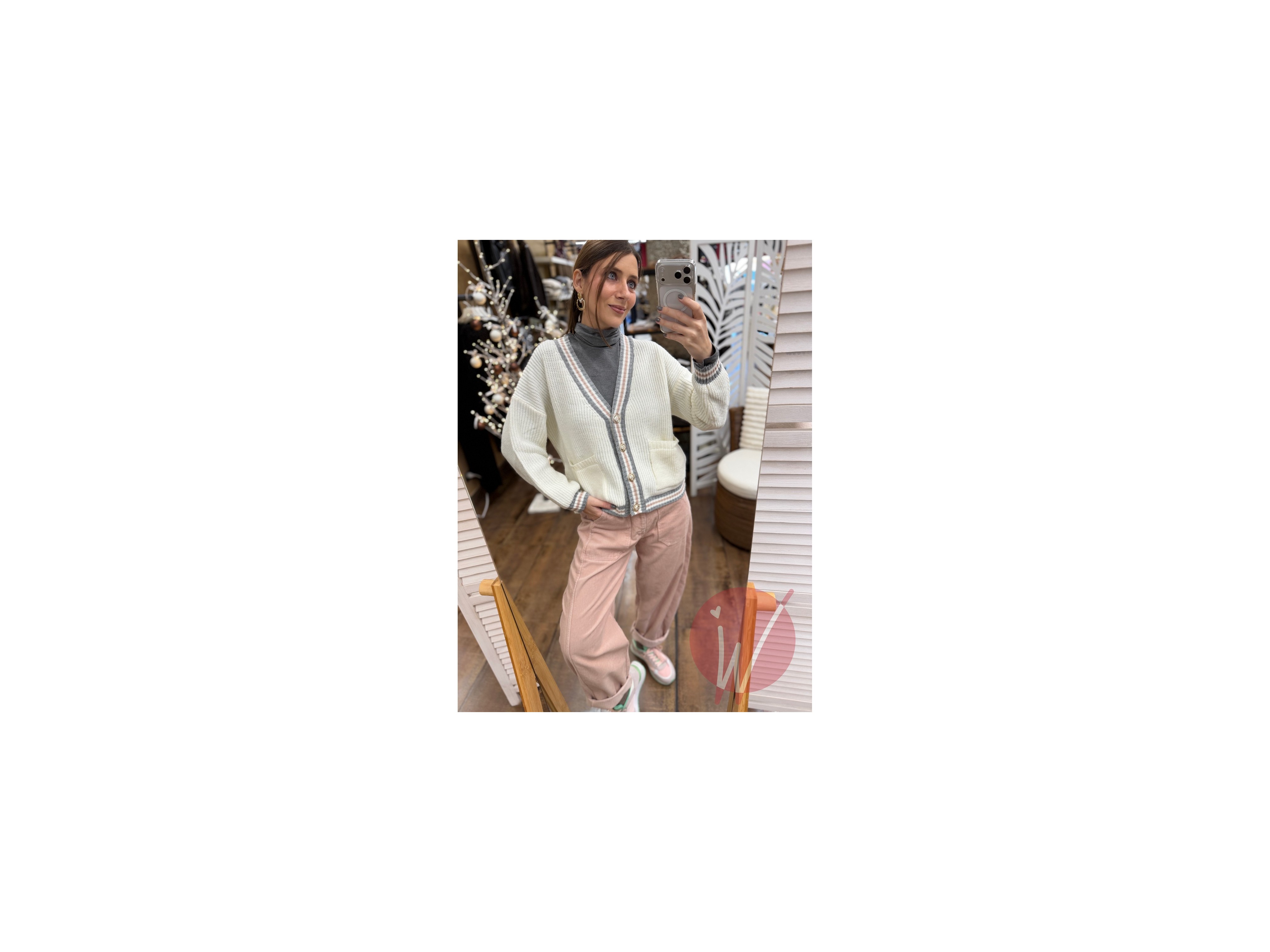 Cardigan corto a coste inglesi, con taschini davanti, scollo a v tricolore a contrasto, con bottoncini effetto metallo.