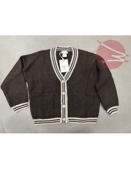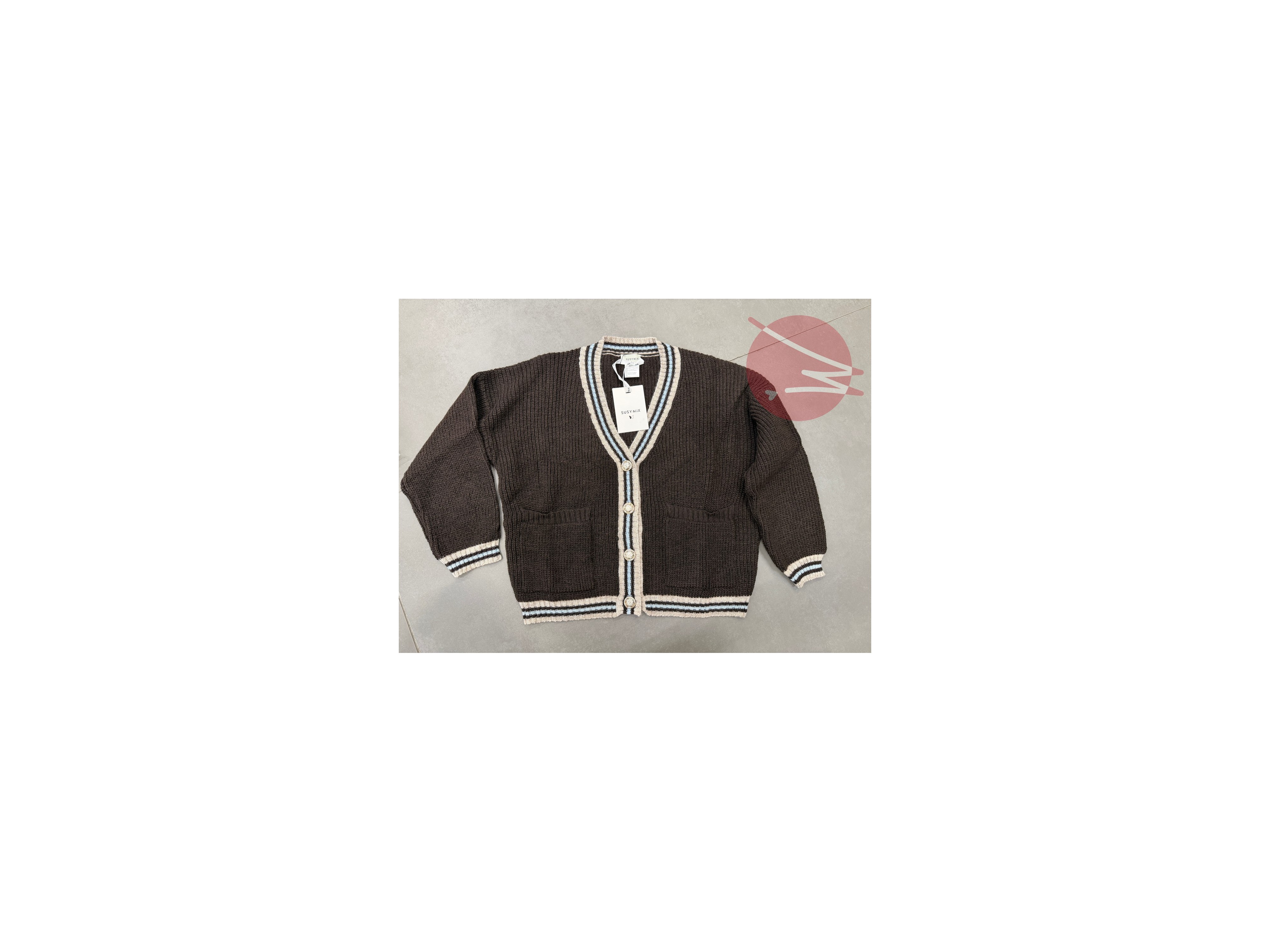 Cardigan corto a coste inglesi, con taschini davanti, scollo a v tricolore a contrasto, con bottoncini effetto metallo.