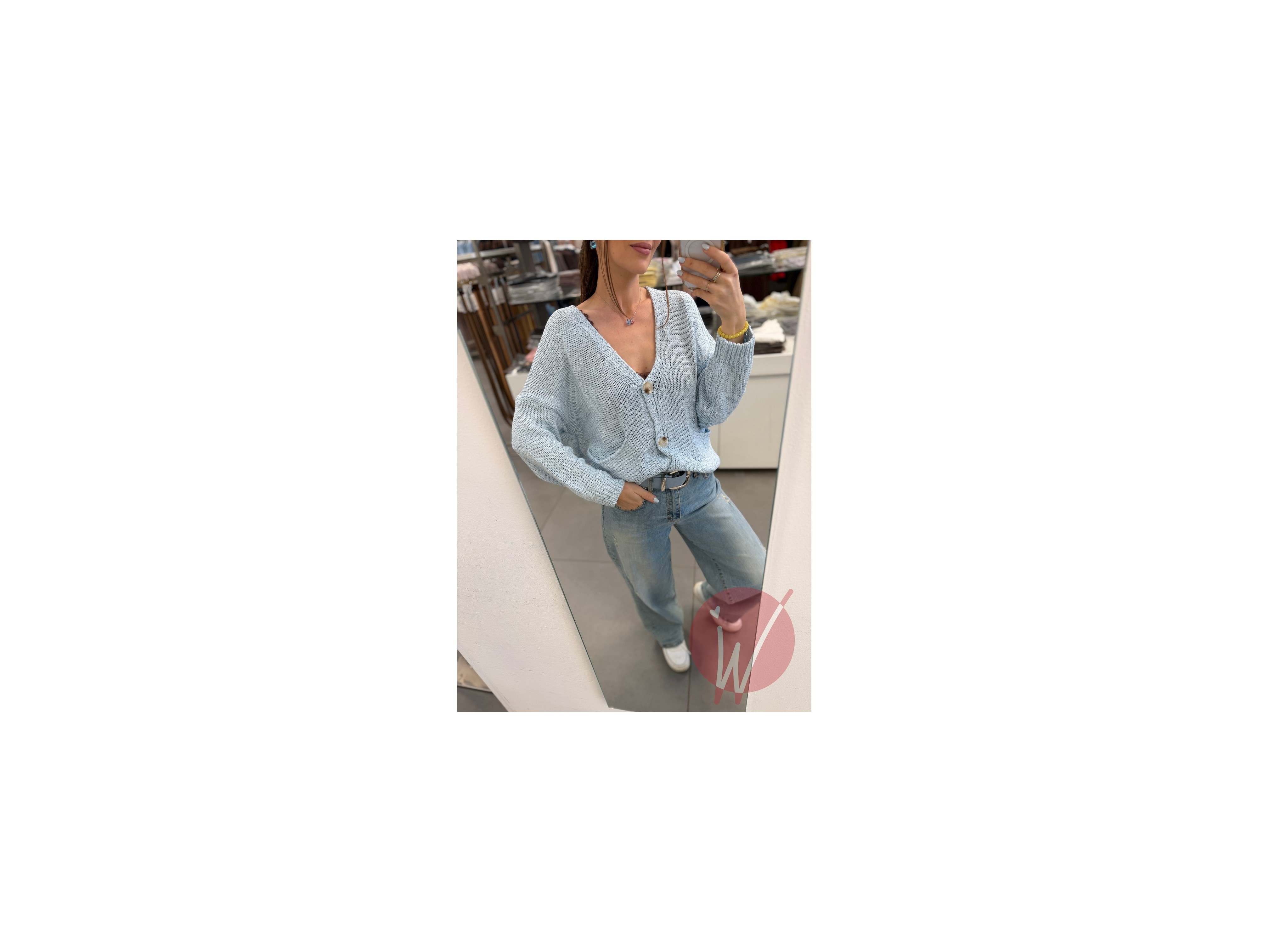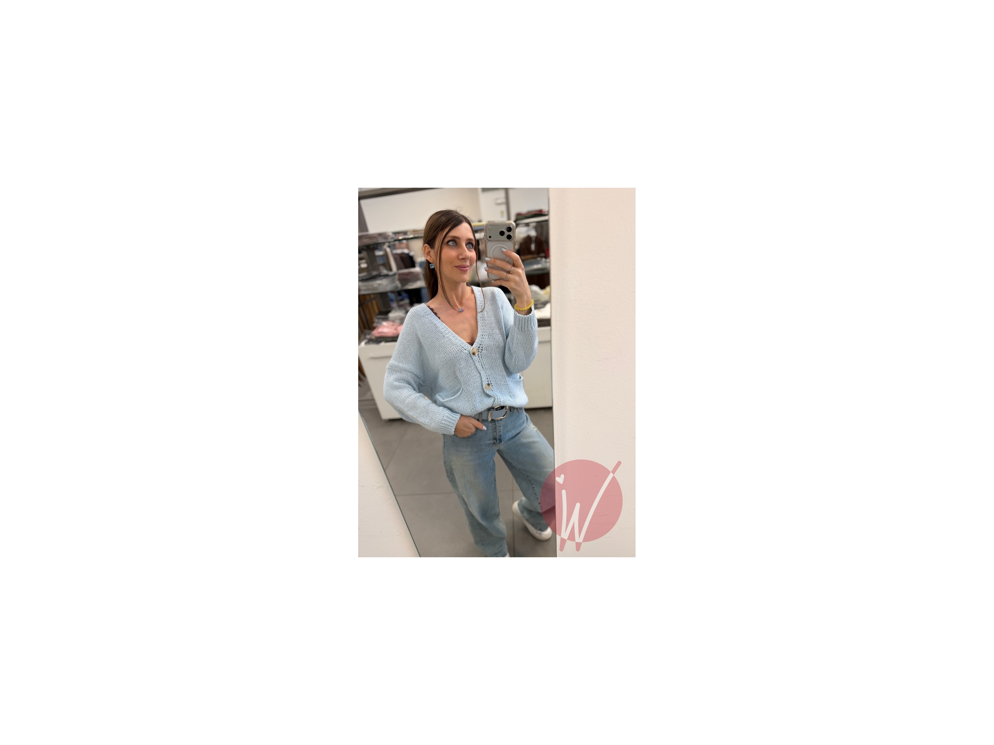 Cardigan in cotone morbido e confortevole, modello a scatolina, con tasche frontali, chiusura con tre bottoni.