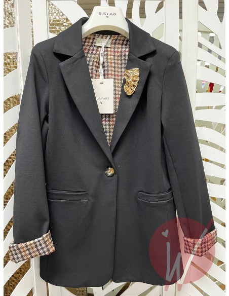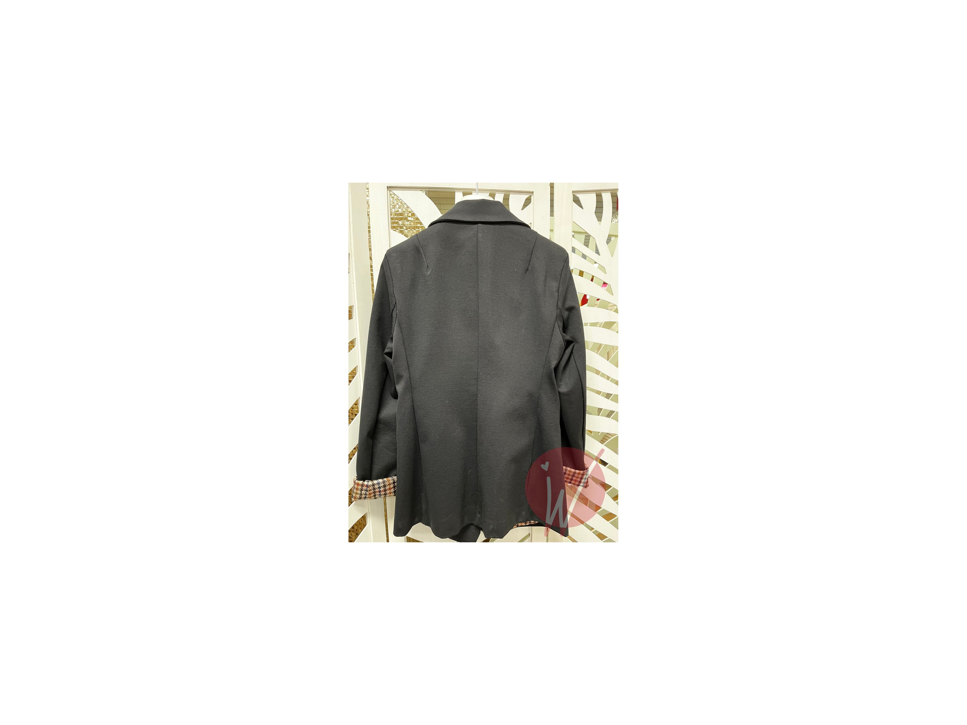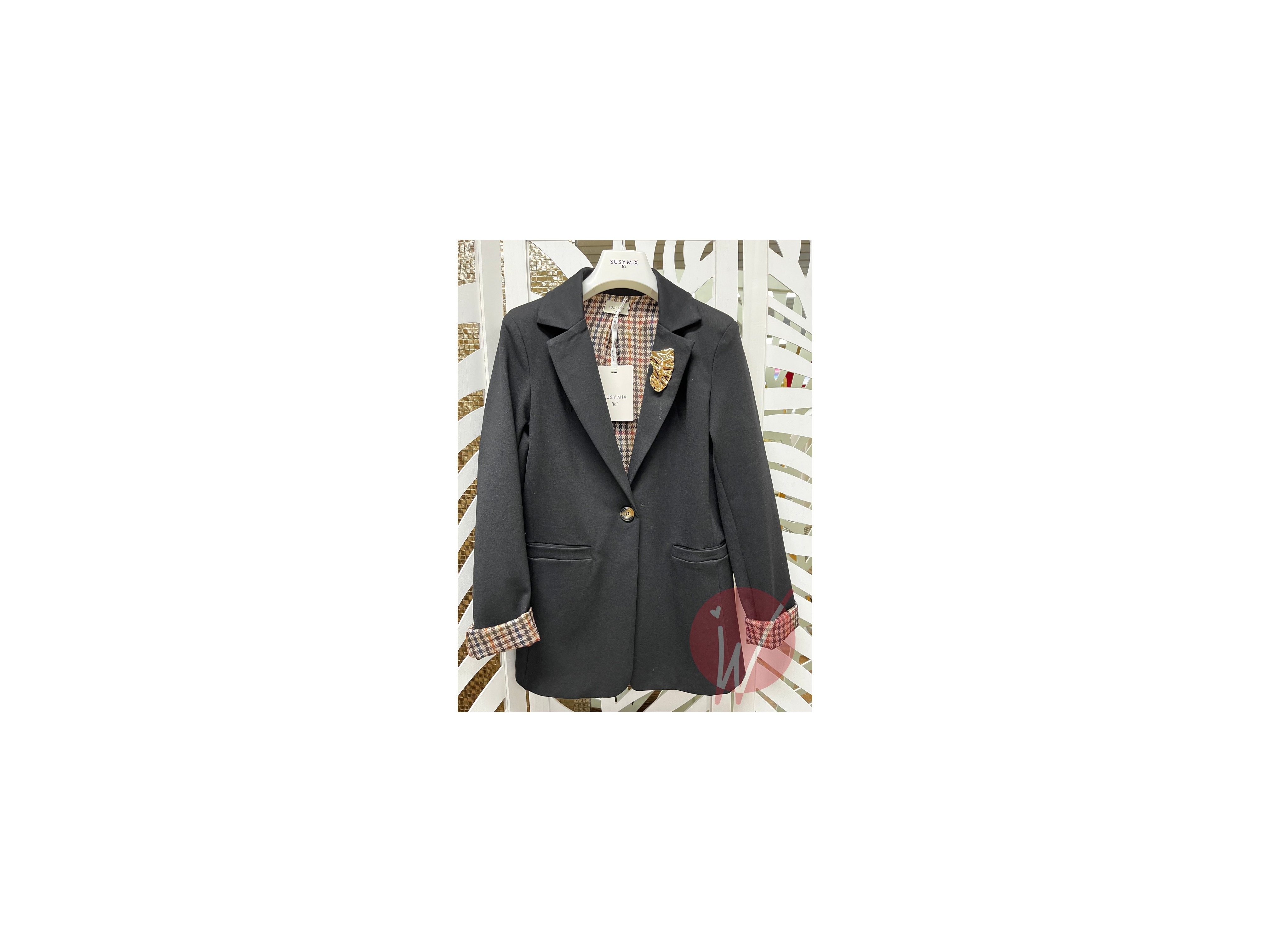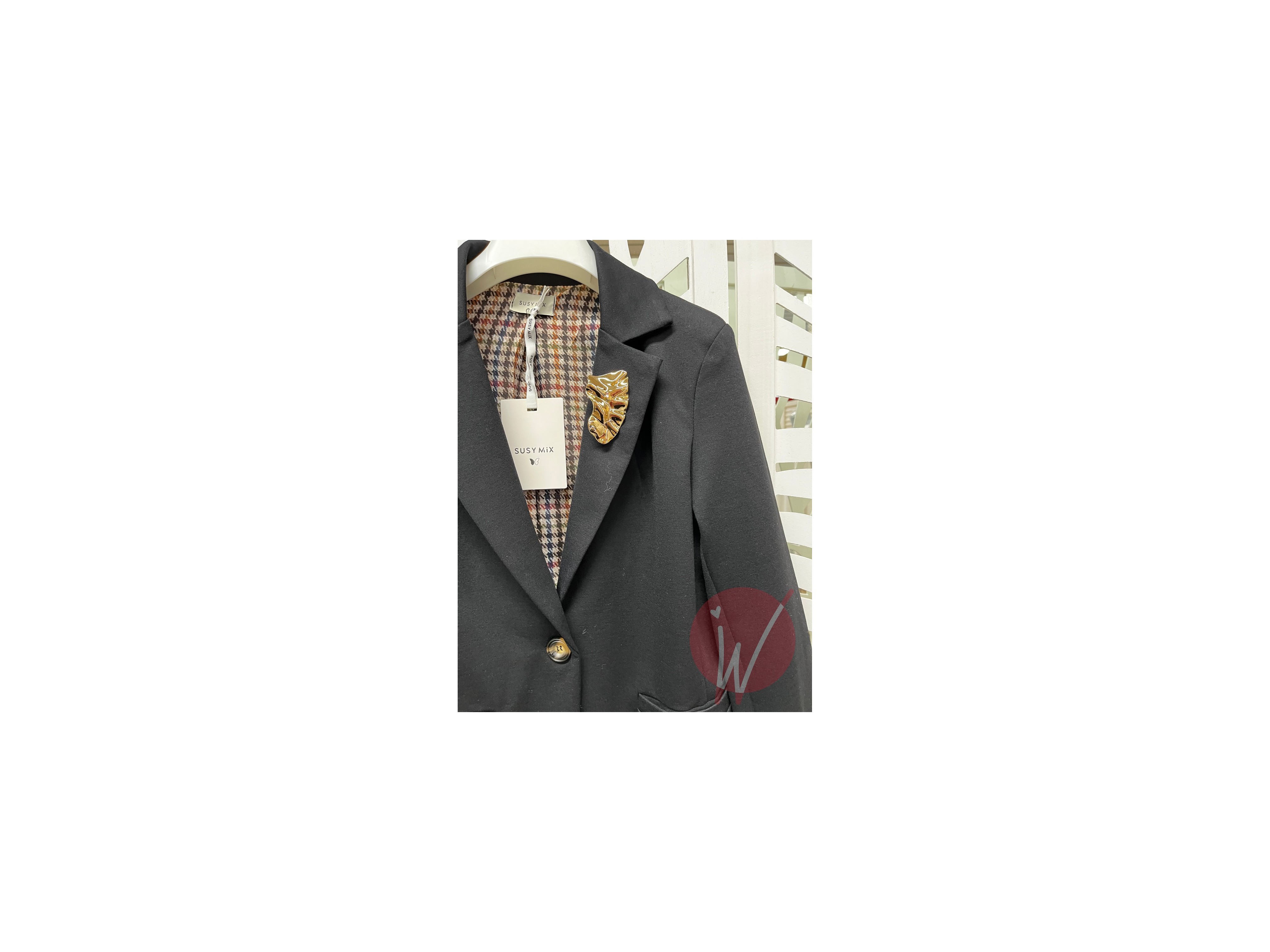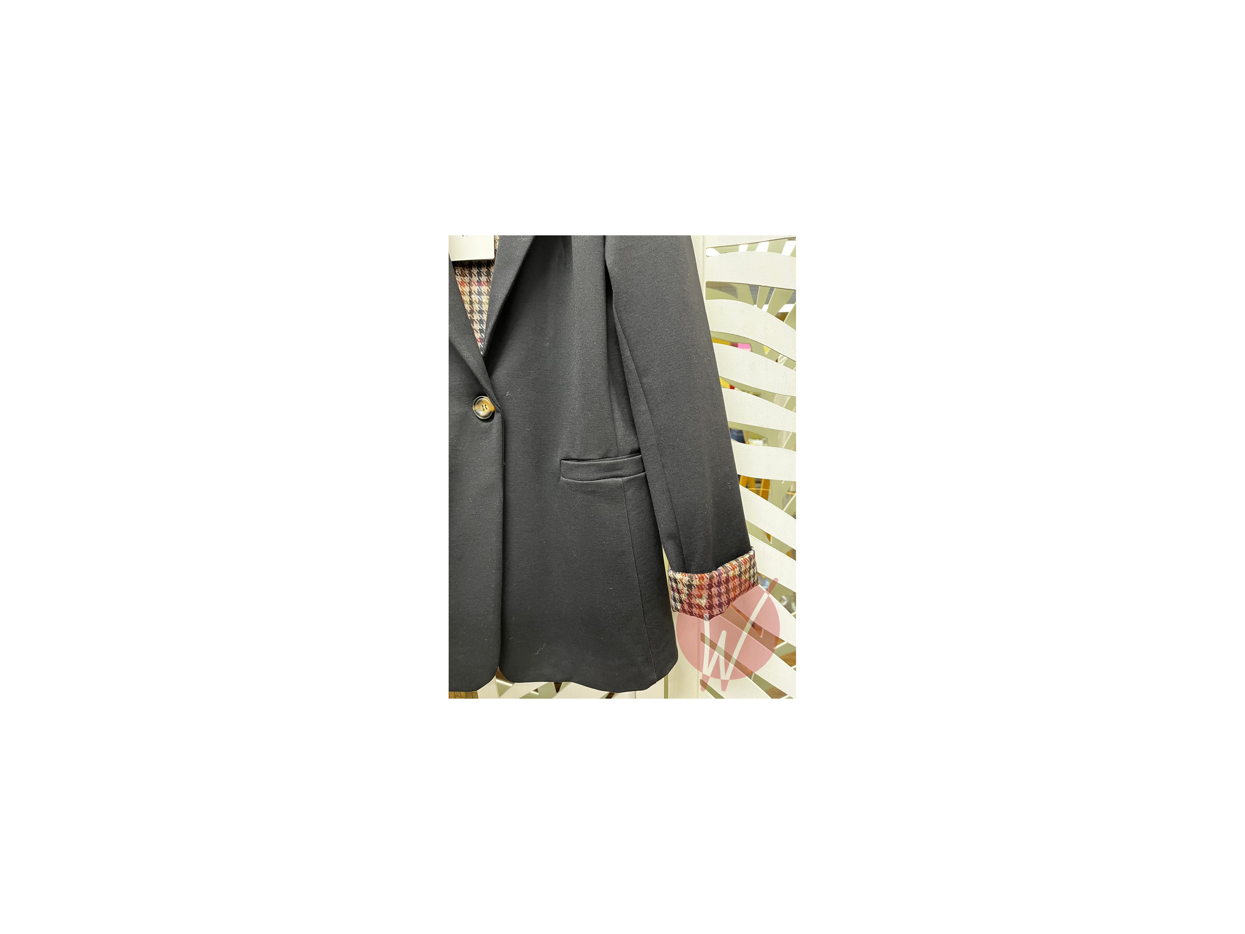 Giacca in viscosa elasticizzata, lavorazione punto milano, modello monopetto sfiancato, con tasche laterali a filetto, foderata in fantasia check, con spilla inclusa, spalline leggermente imbottite.