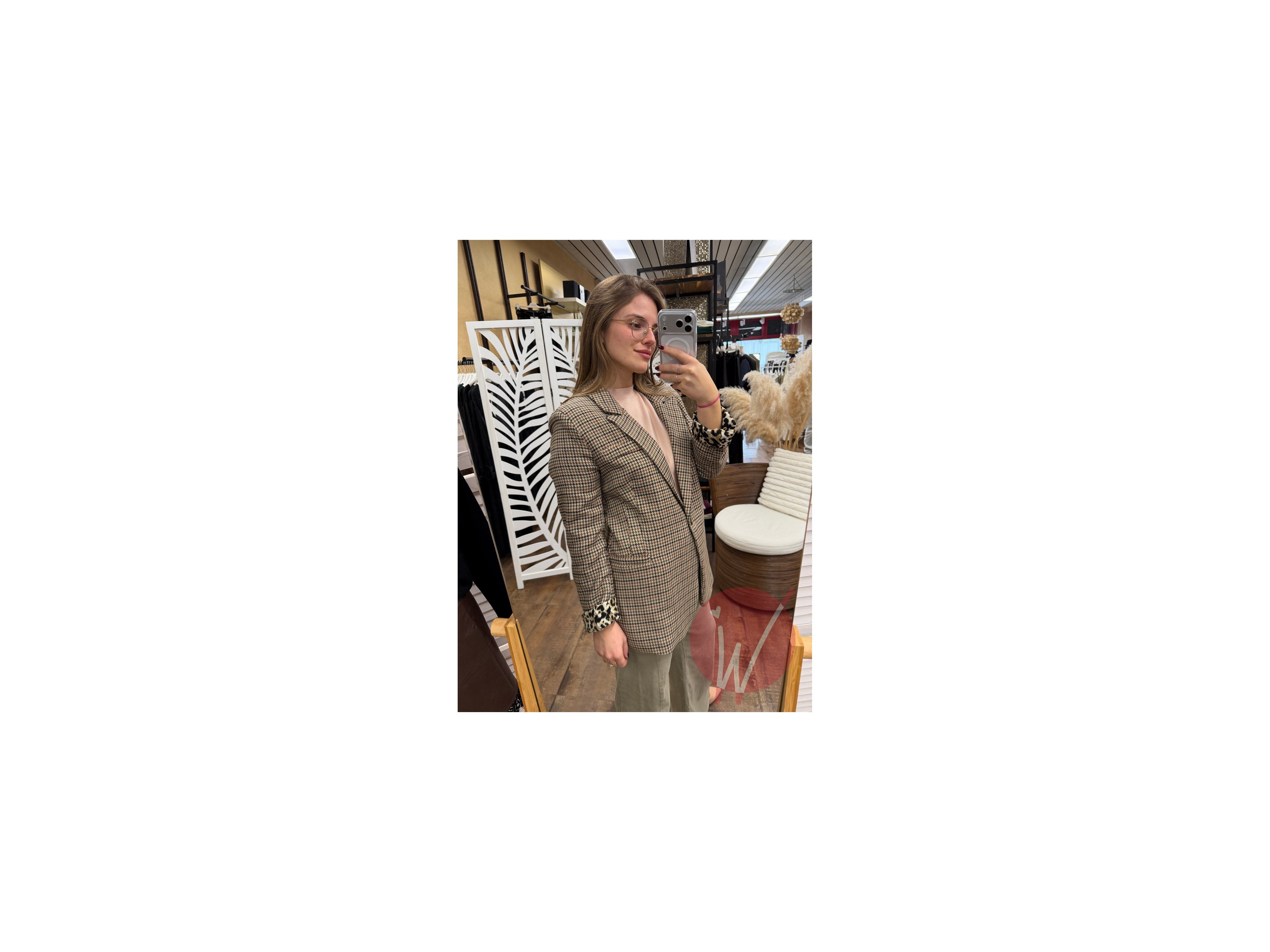 Blazer in pied de poule in viscosa calda, foderato in fantasia animalier all'interno, con revers a lancia, chiusura a monopetto, spalline leggermente imbottite.