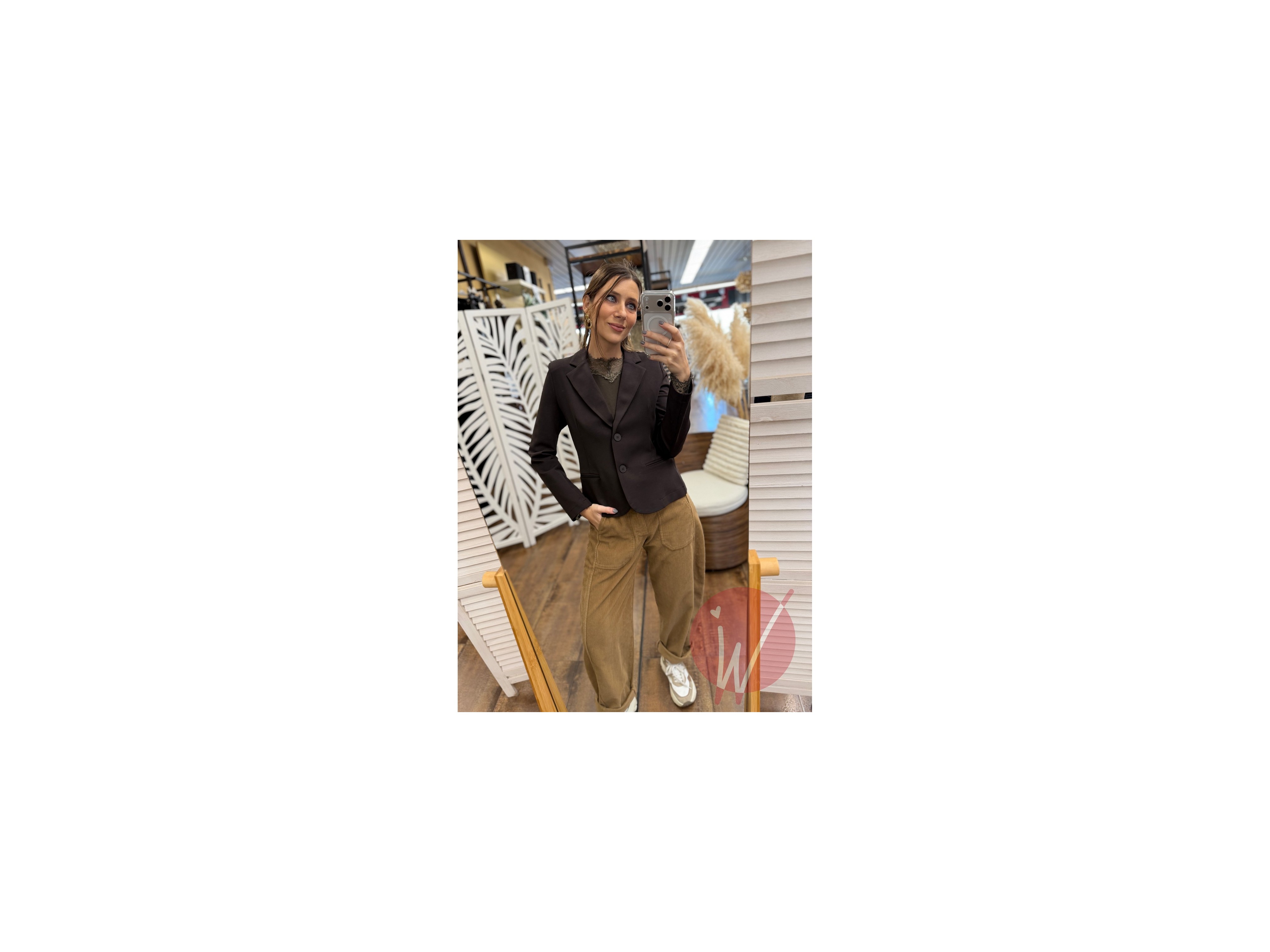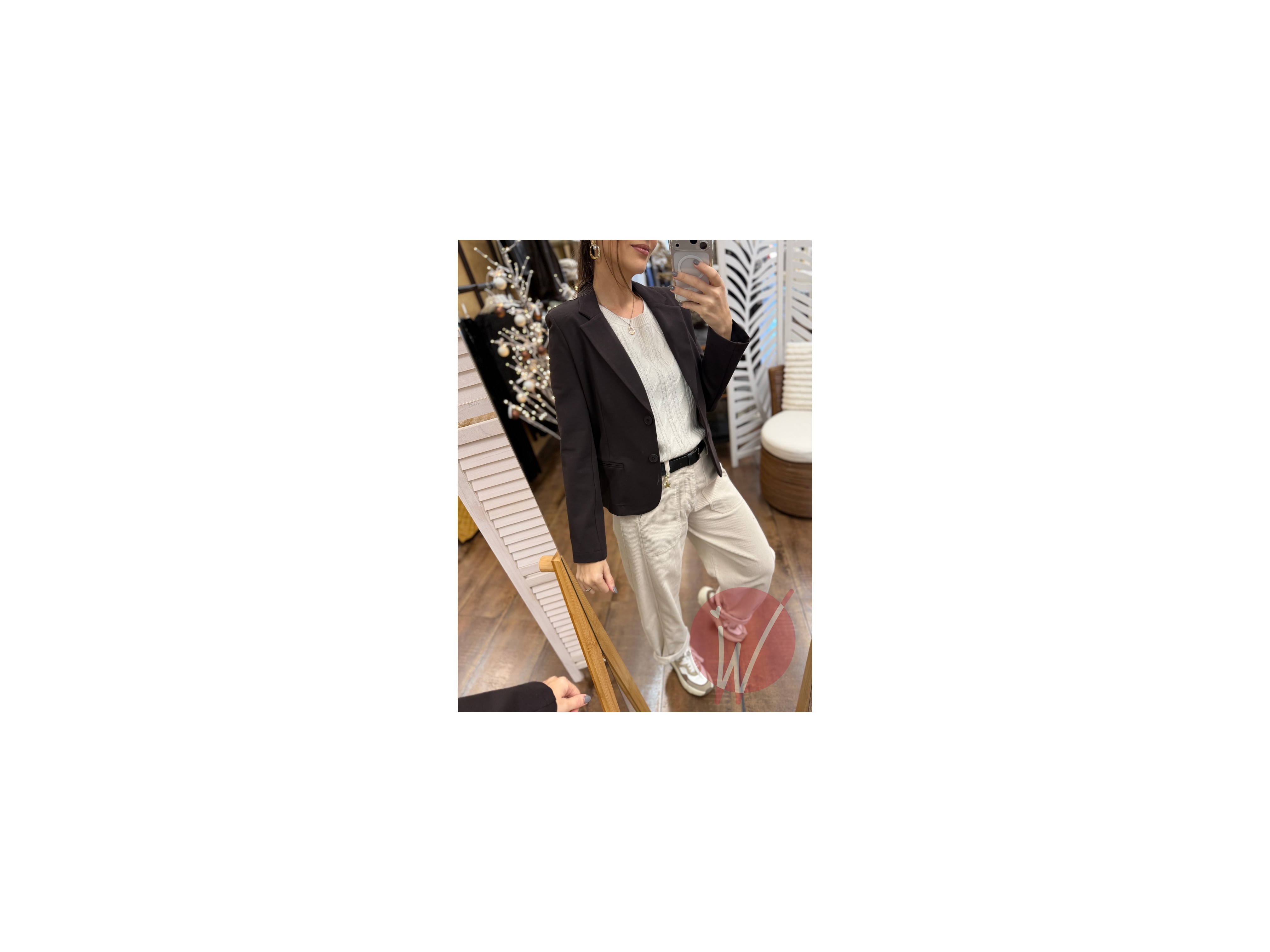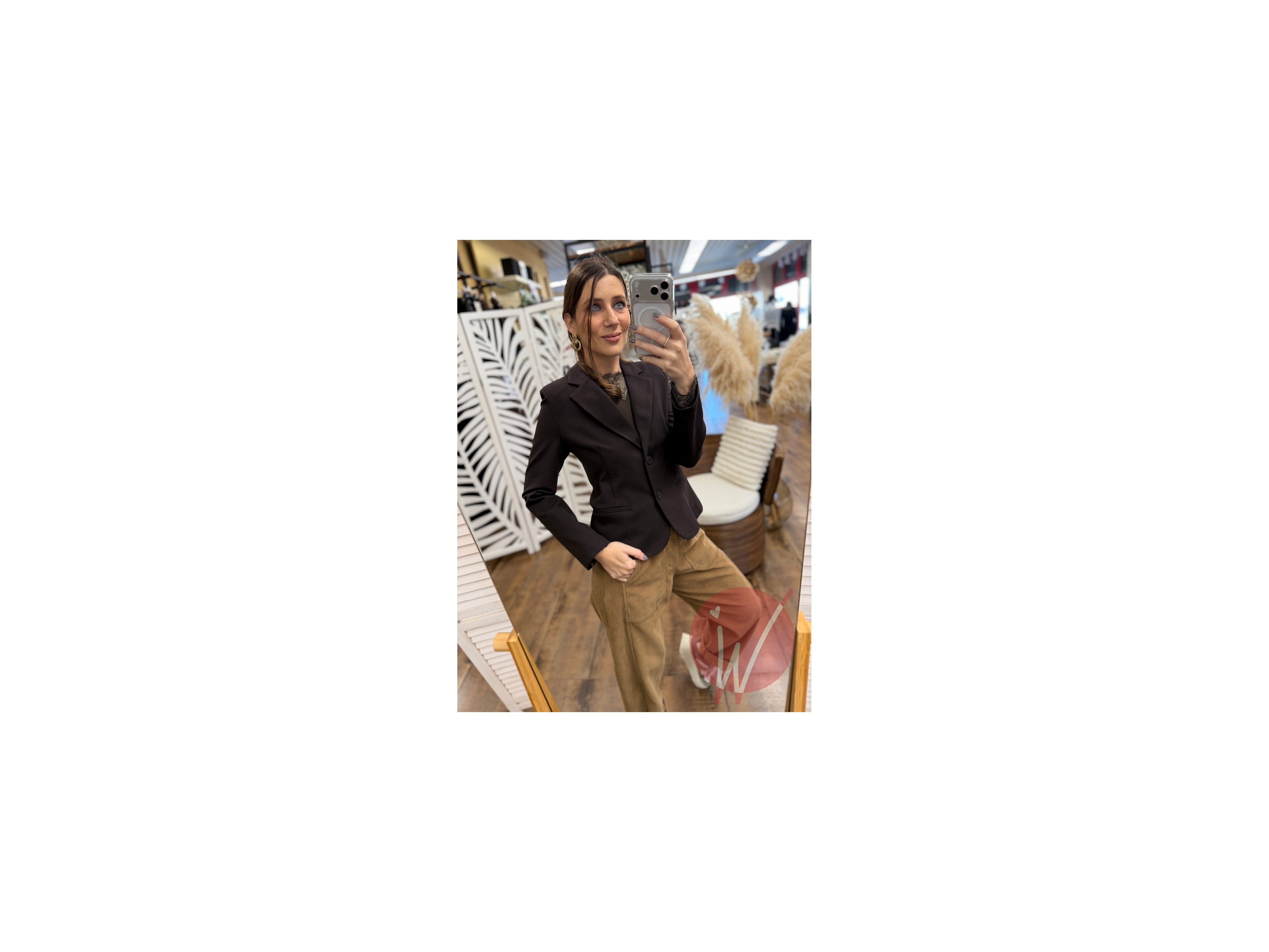 Giacca in viscosa punto milano, chiusura monopetto, taglio sfiancato, con revers a lancia e tasche a filetto davanti.