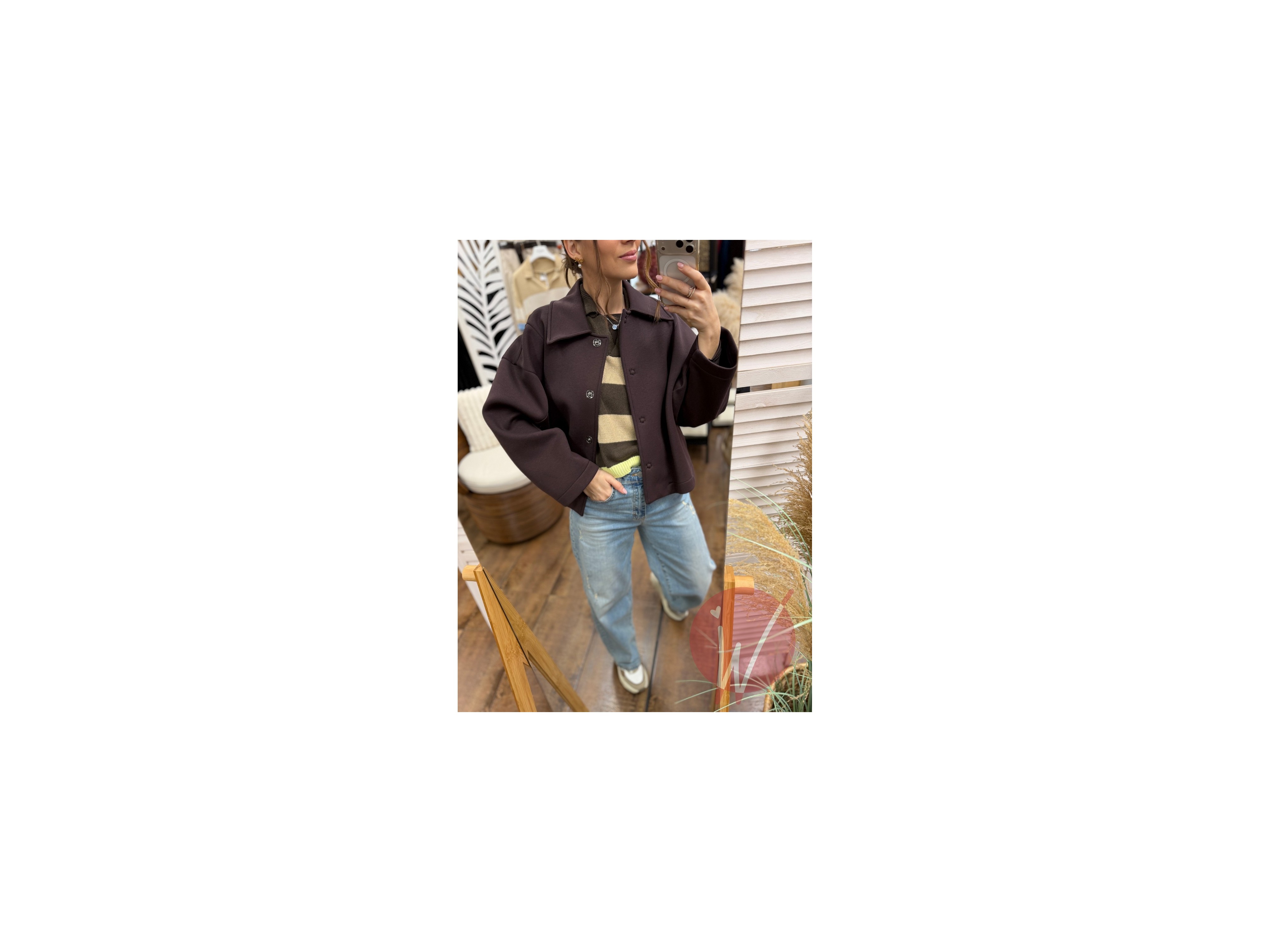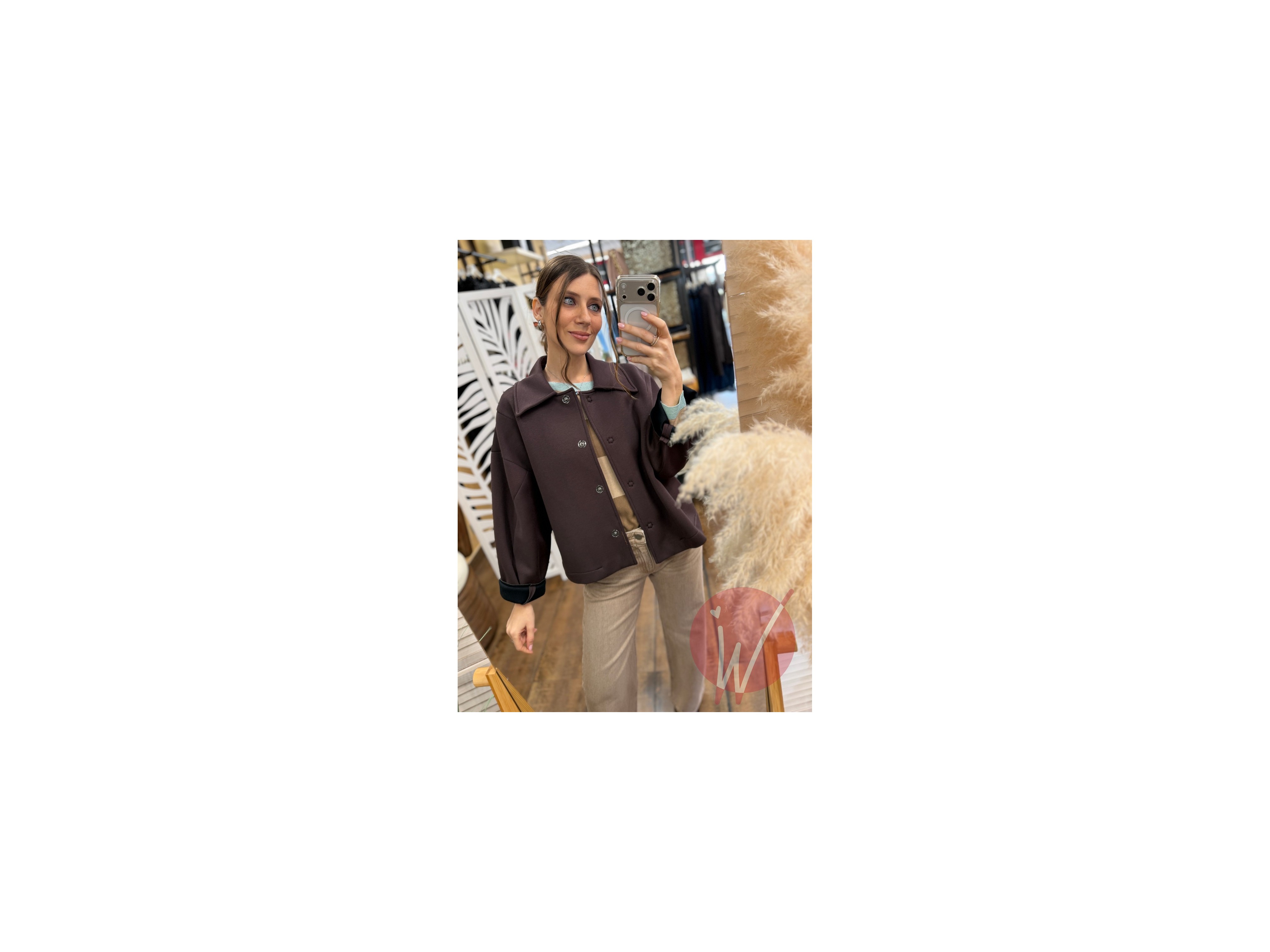 Giacca in neoprene morbido, taglio dritto a scatolina, chiusura con bottoni automatici, colletto a camicia, con tasche in piedi laterali.