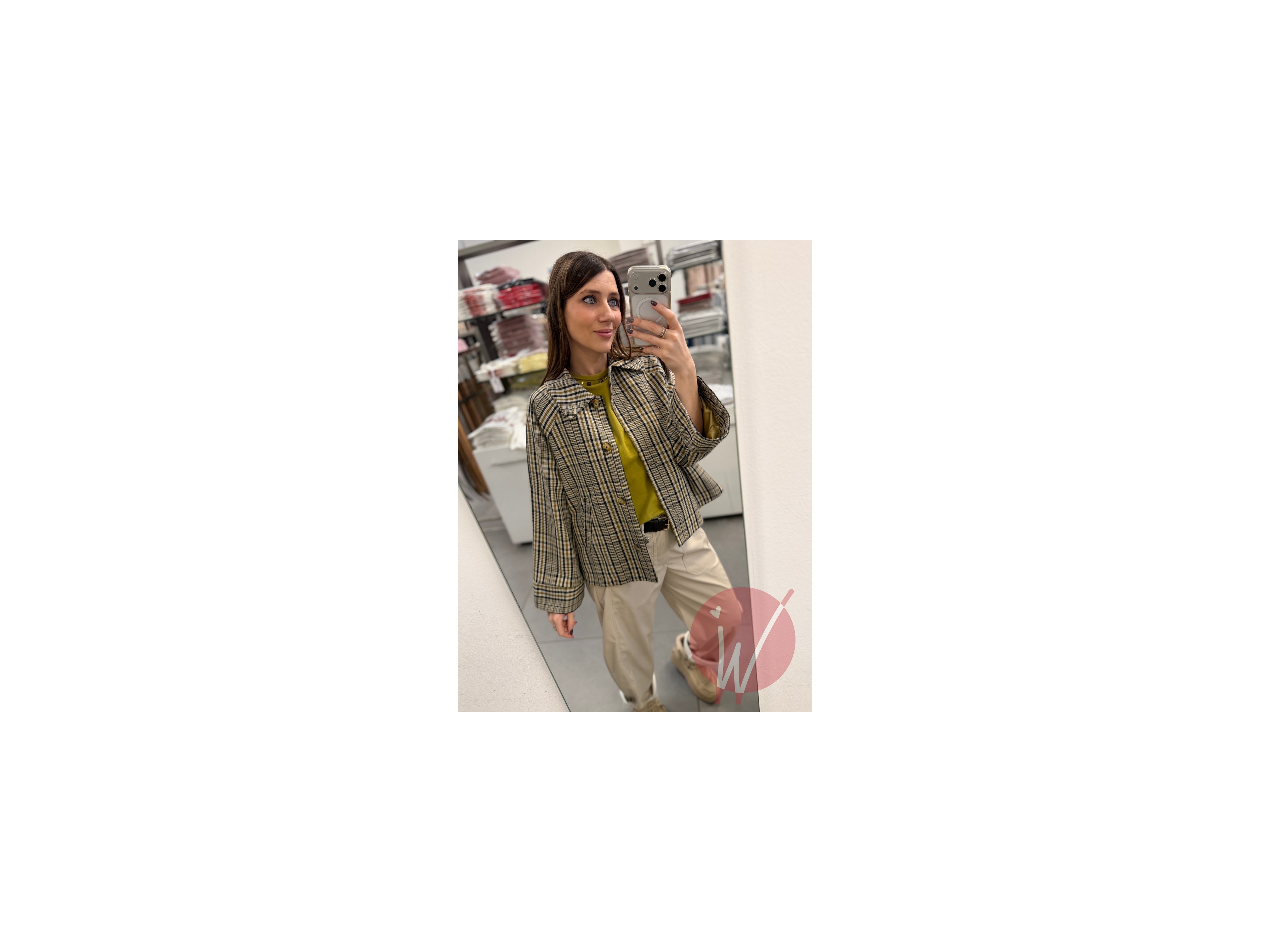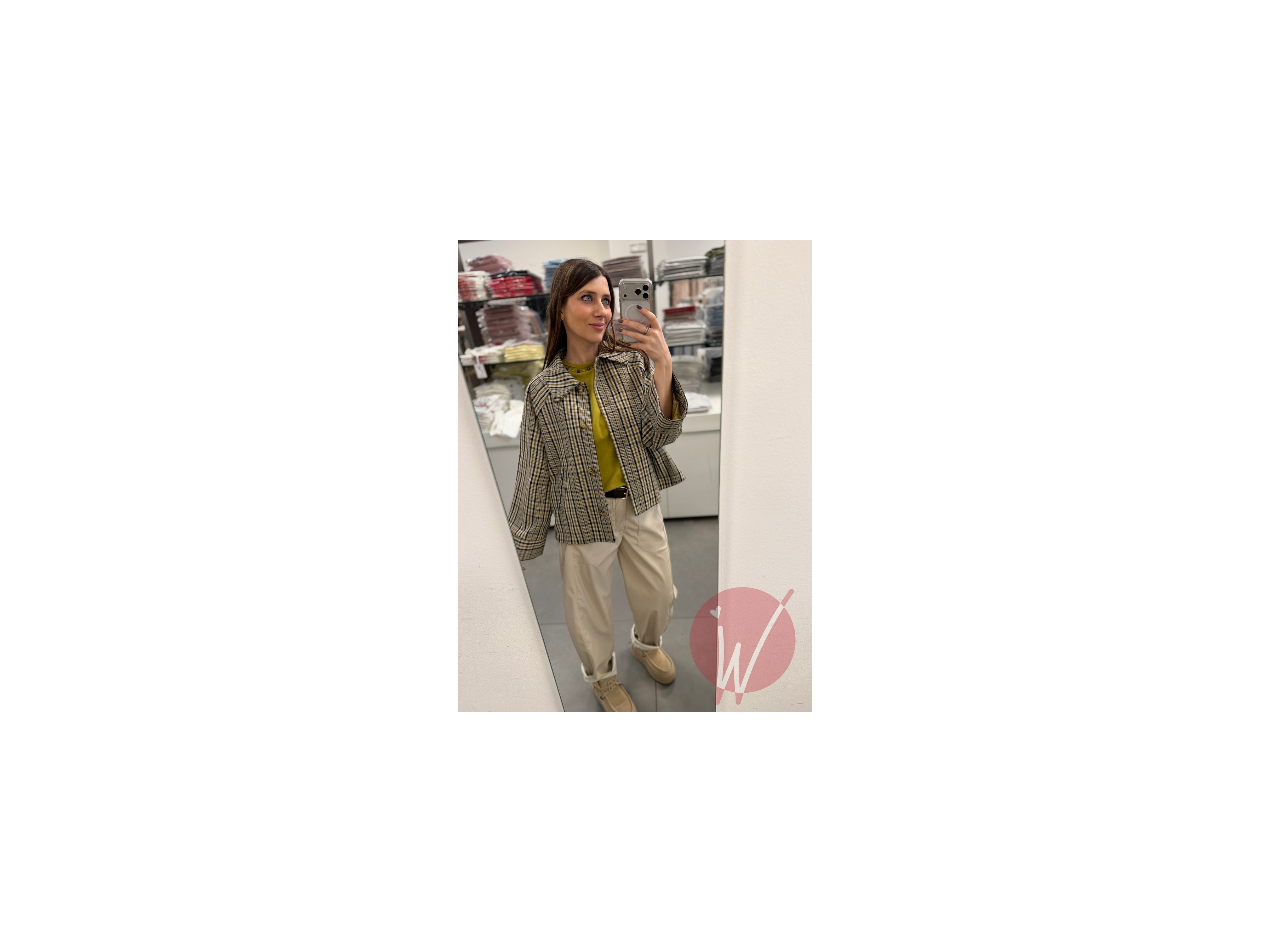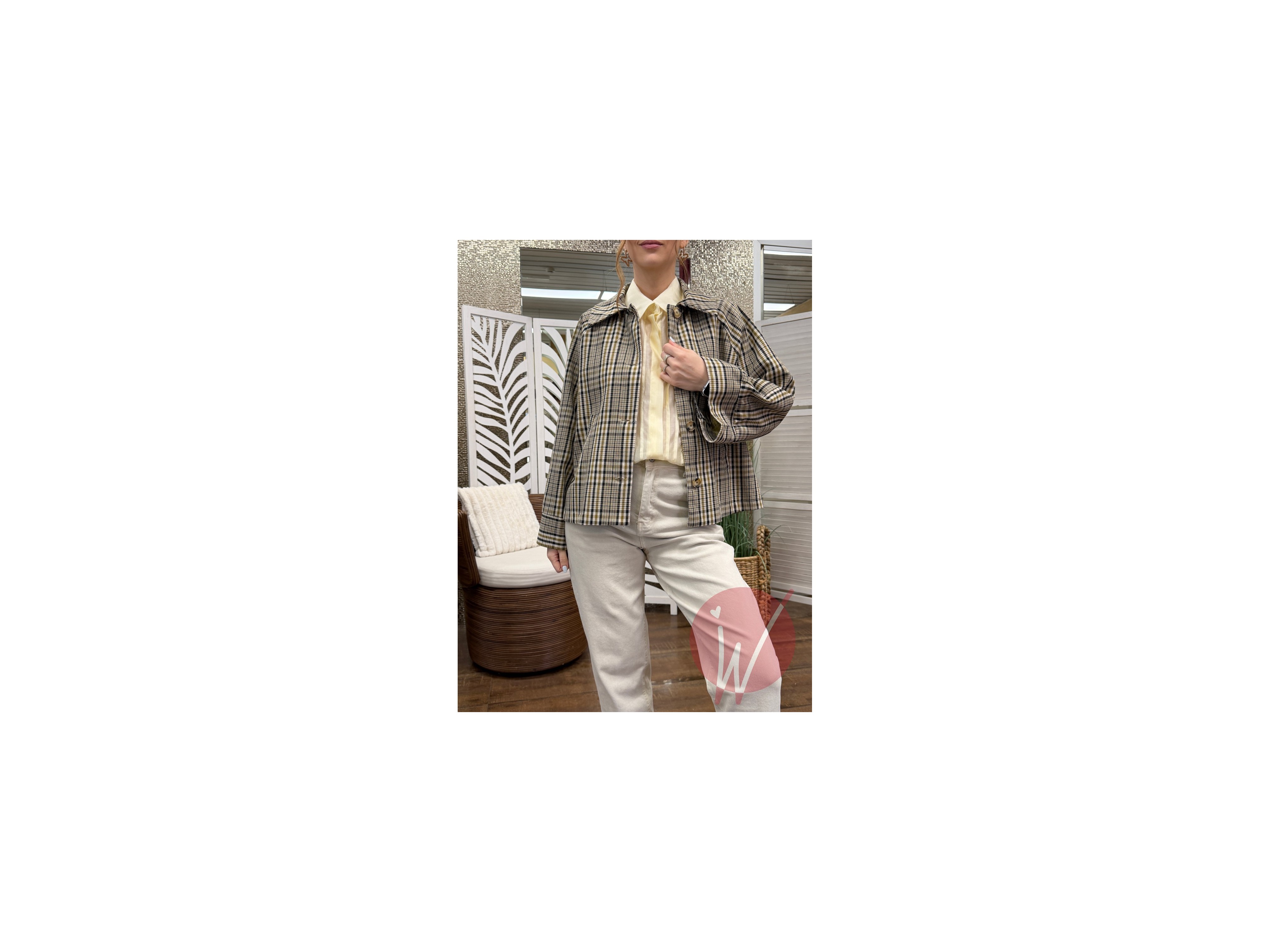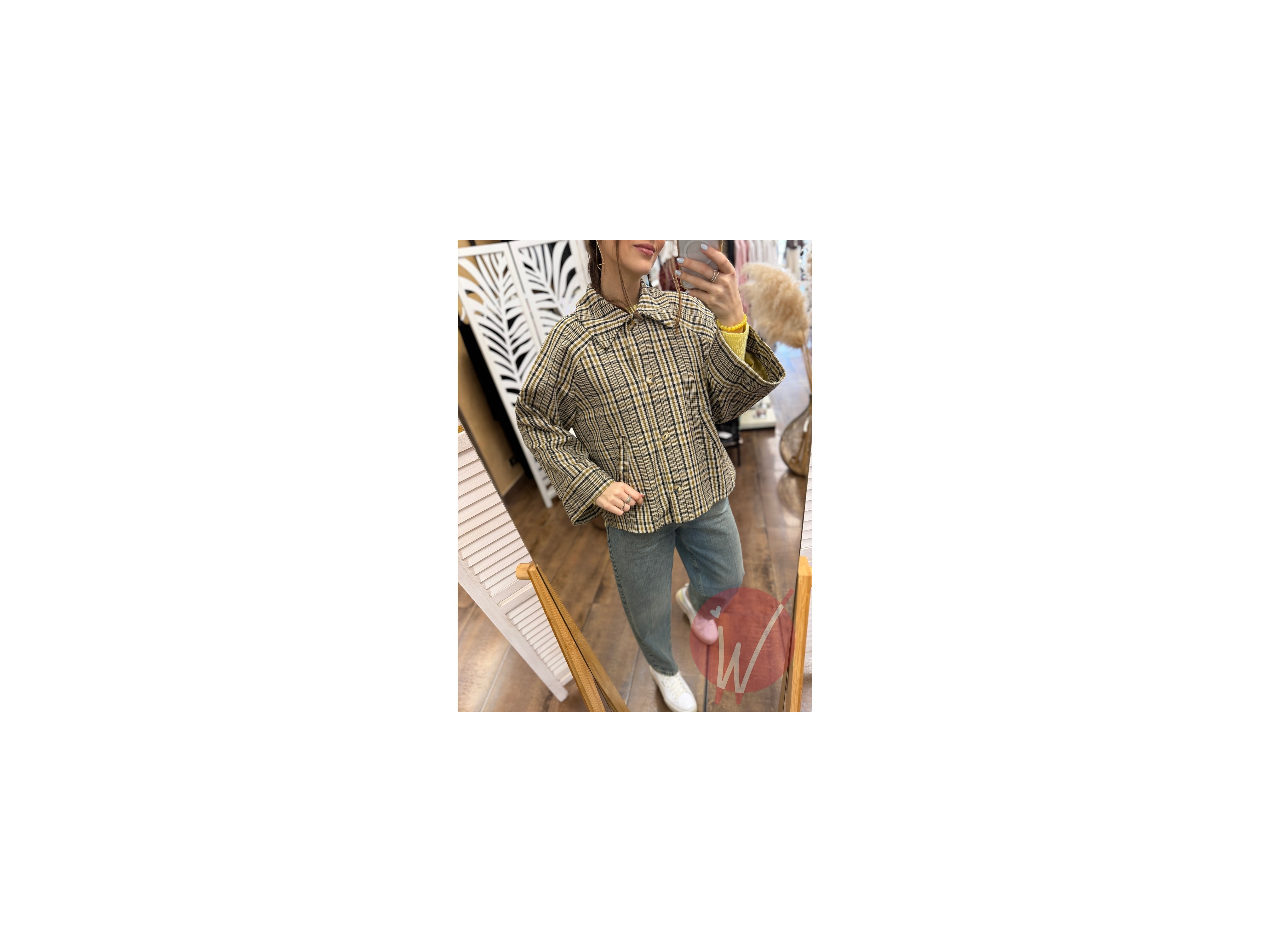 Giacca modello cappa, fantasia check, con bottoni davanti, foderata all'interno, tasche in piedi laterali, maniche ampie, taglio leggermente svasato.