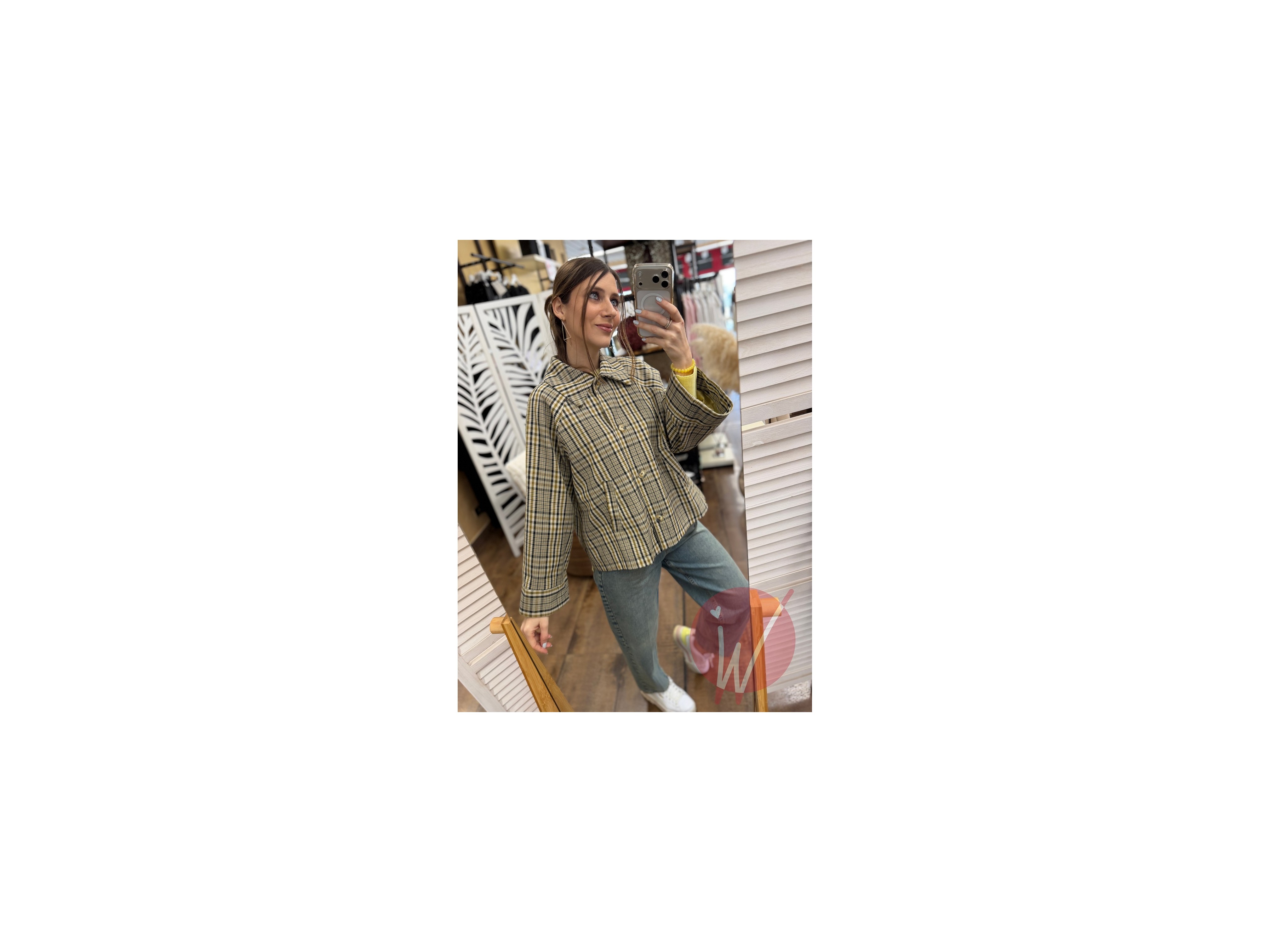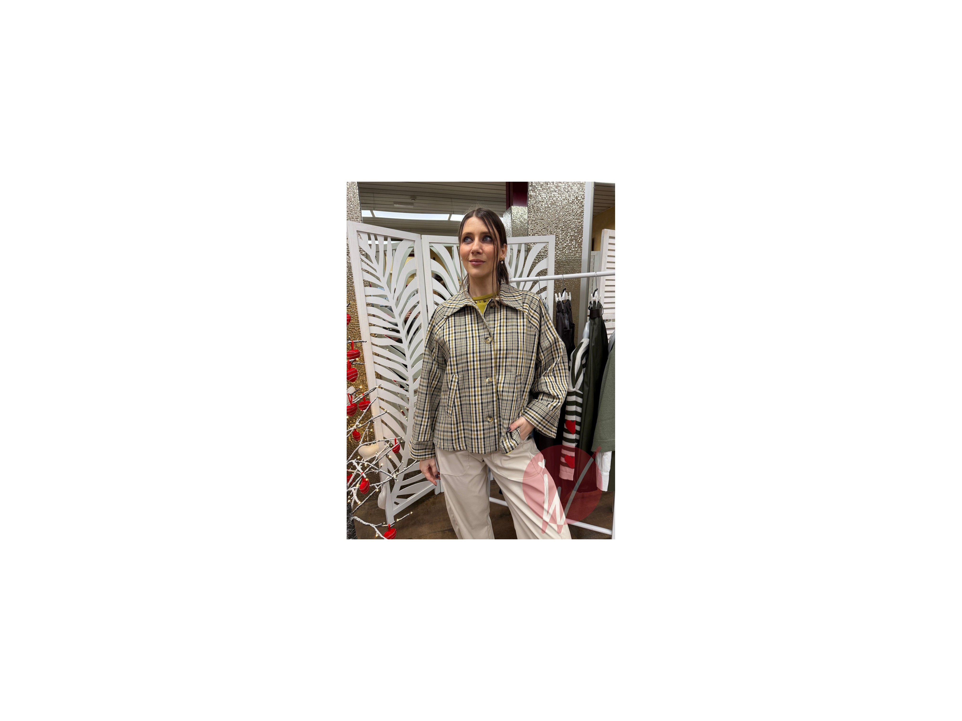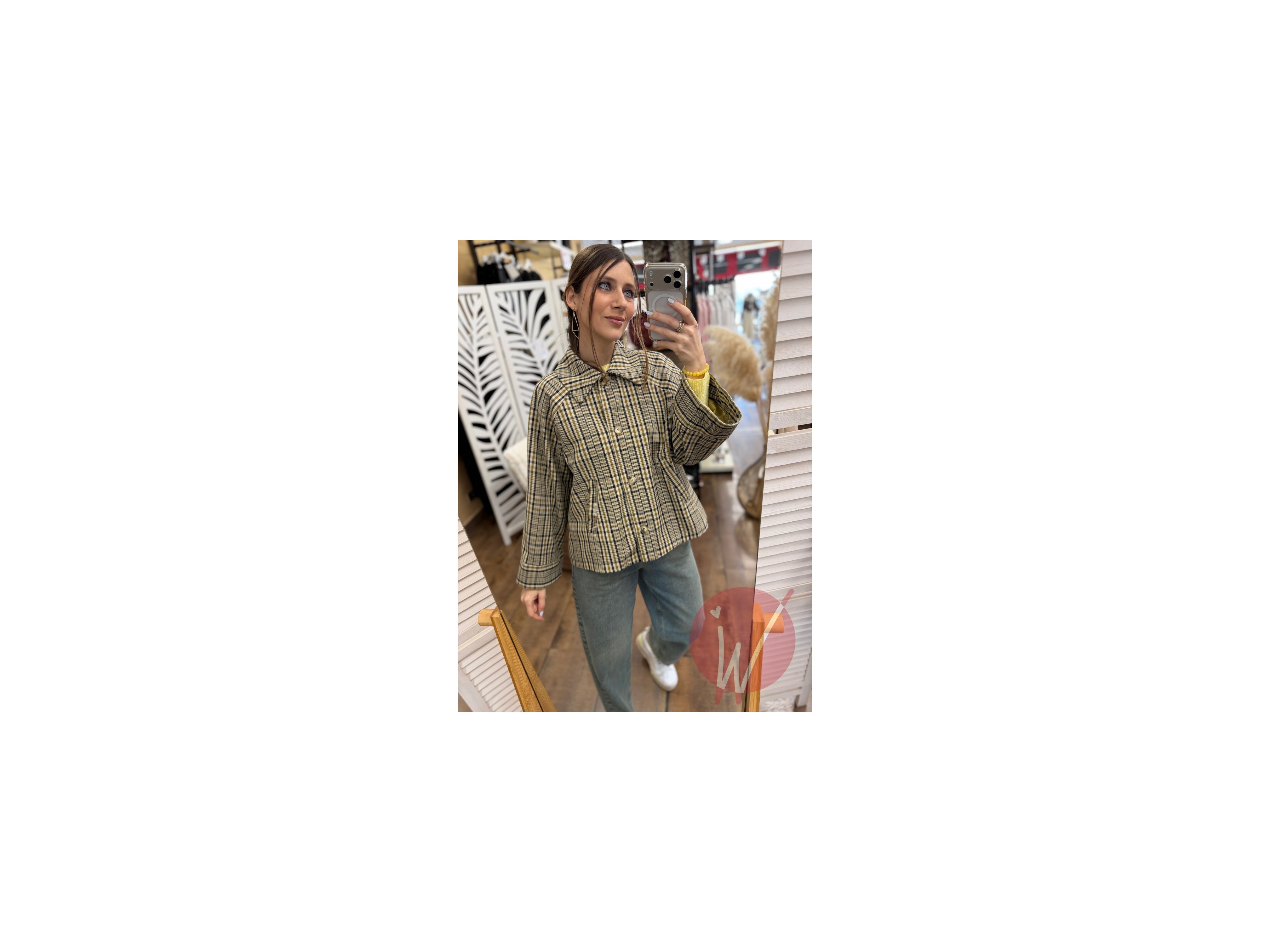 Giacca modello cappa, fantasia check, con bottoni davanti, foderata all'interno, tasche in piedi laterali, maniche ampie, taglio leggermente svasato.