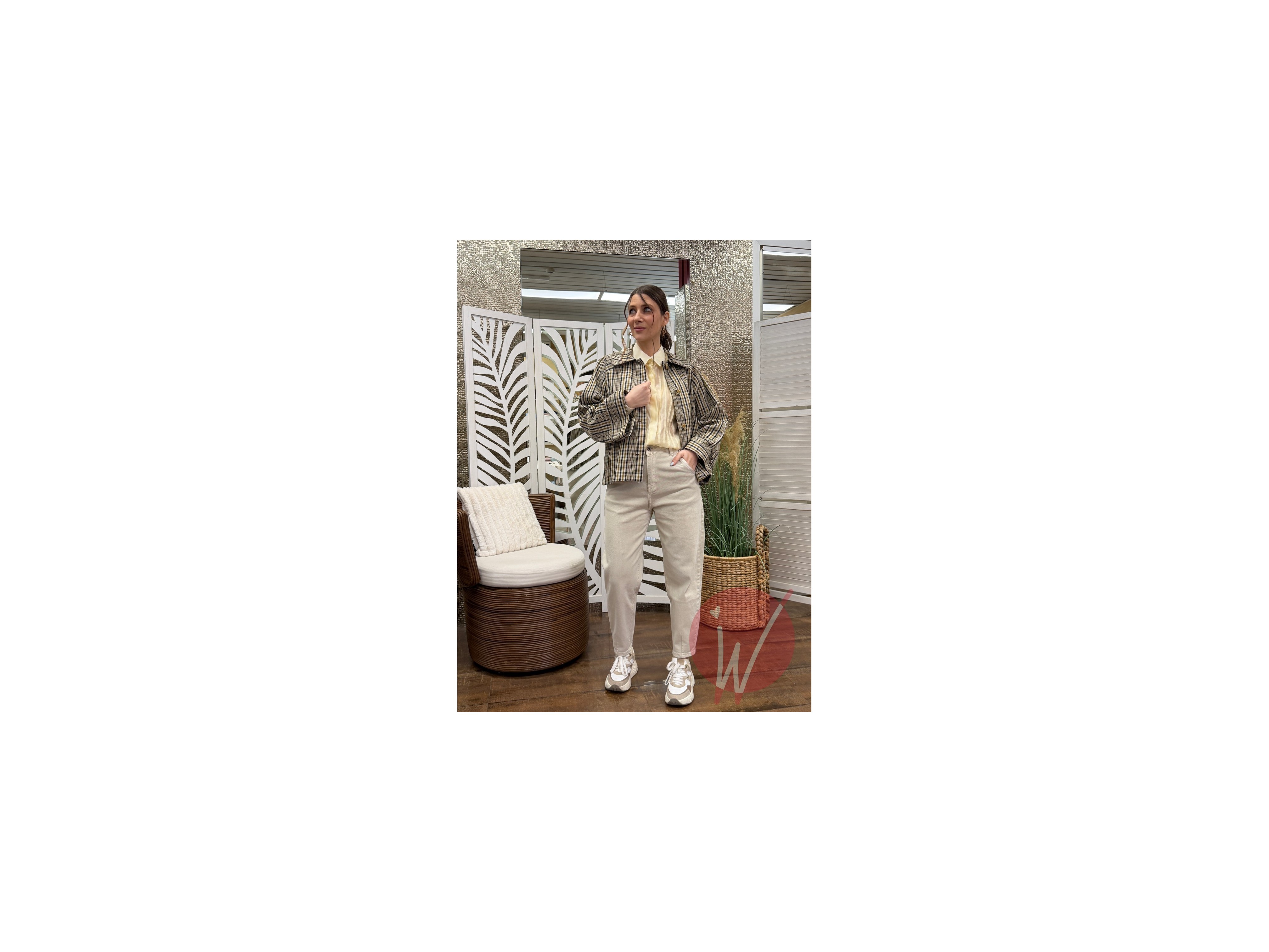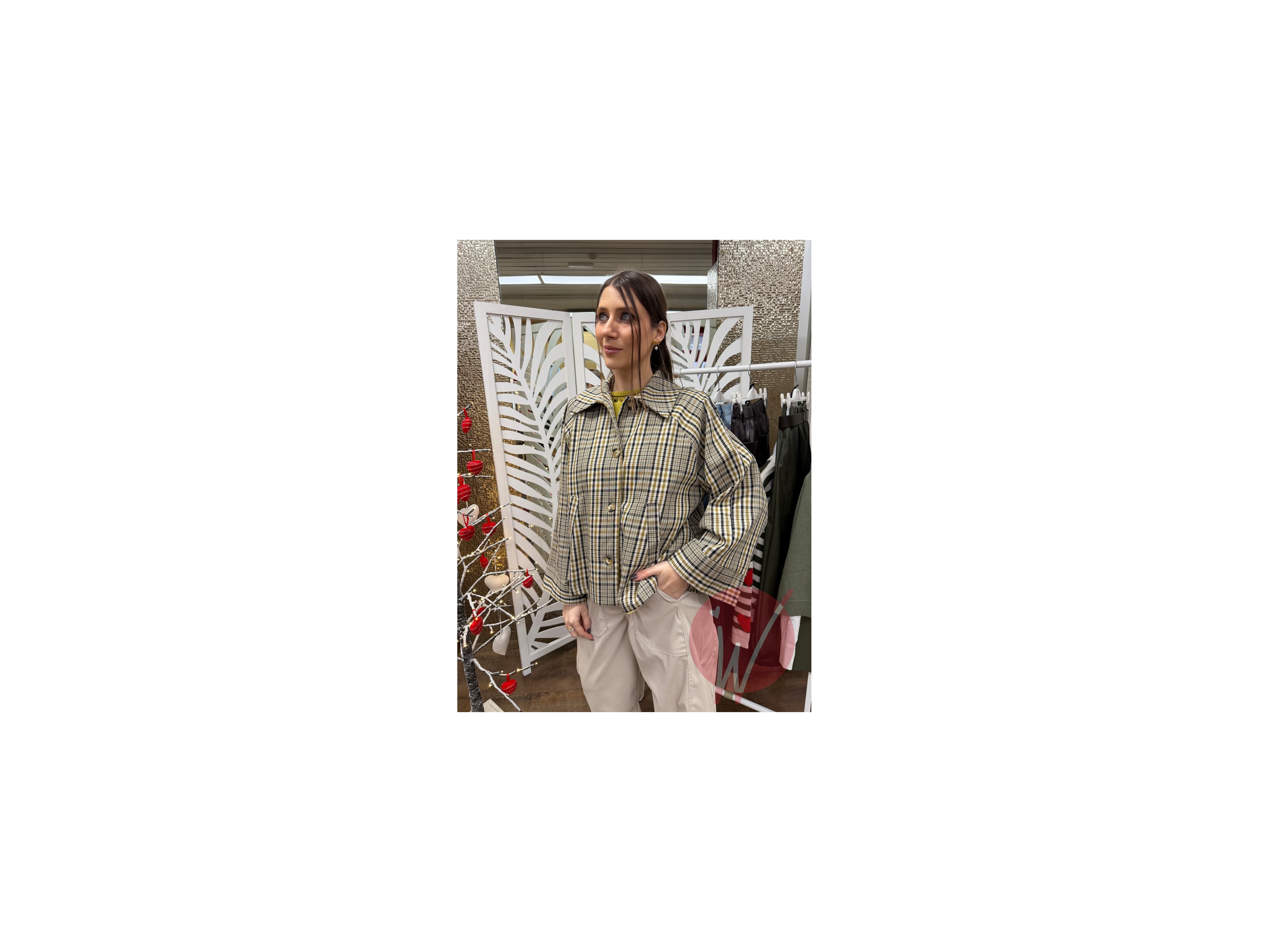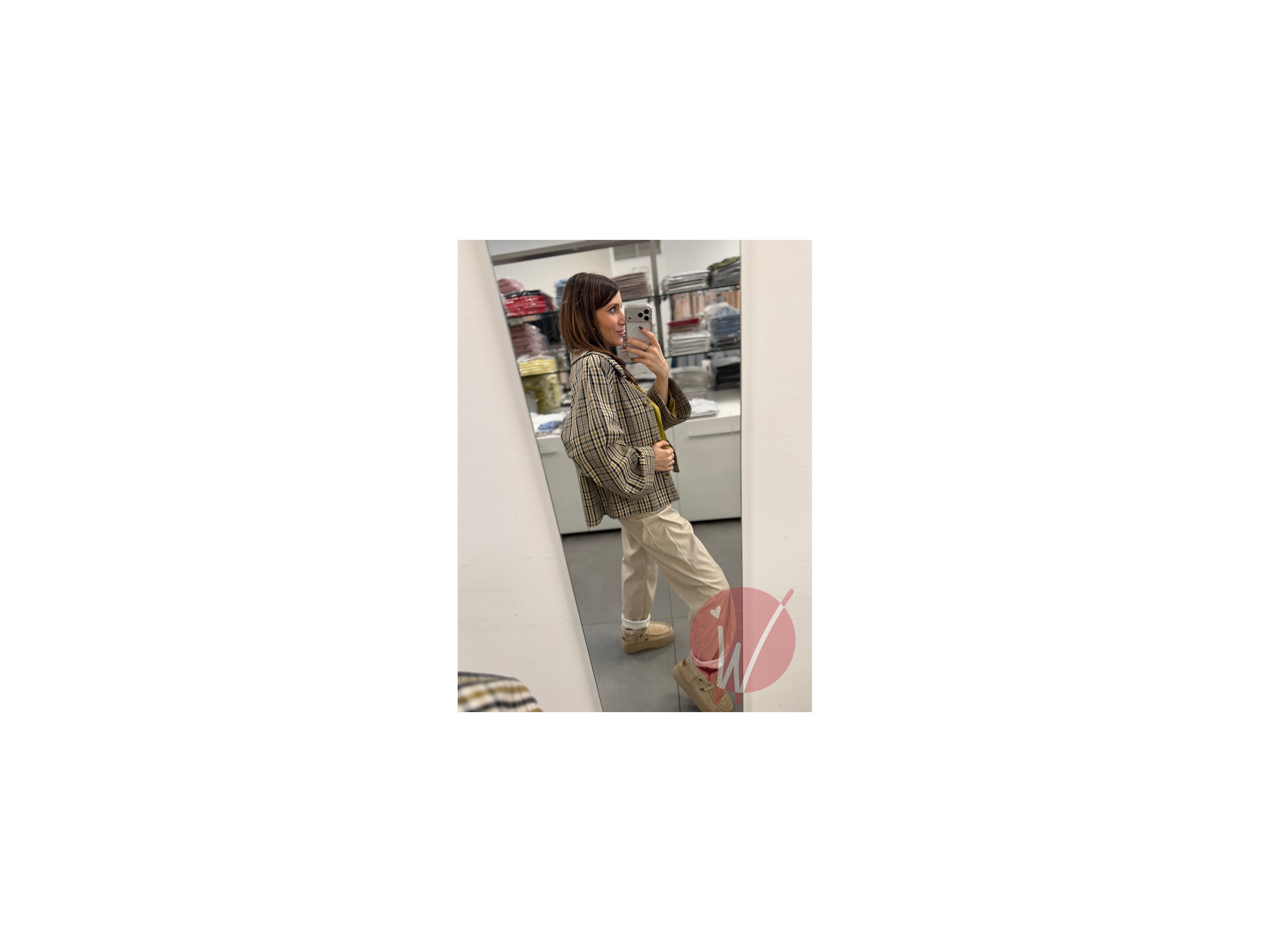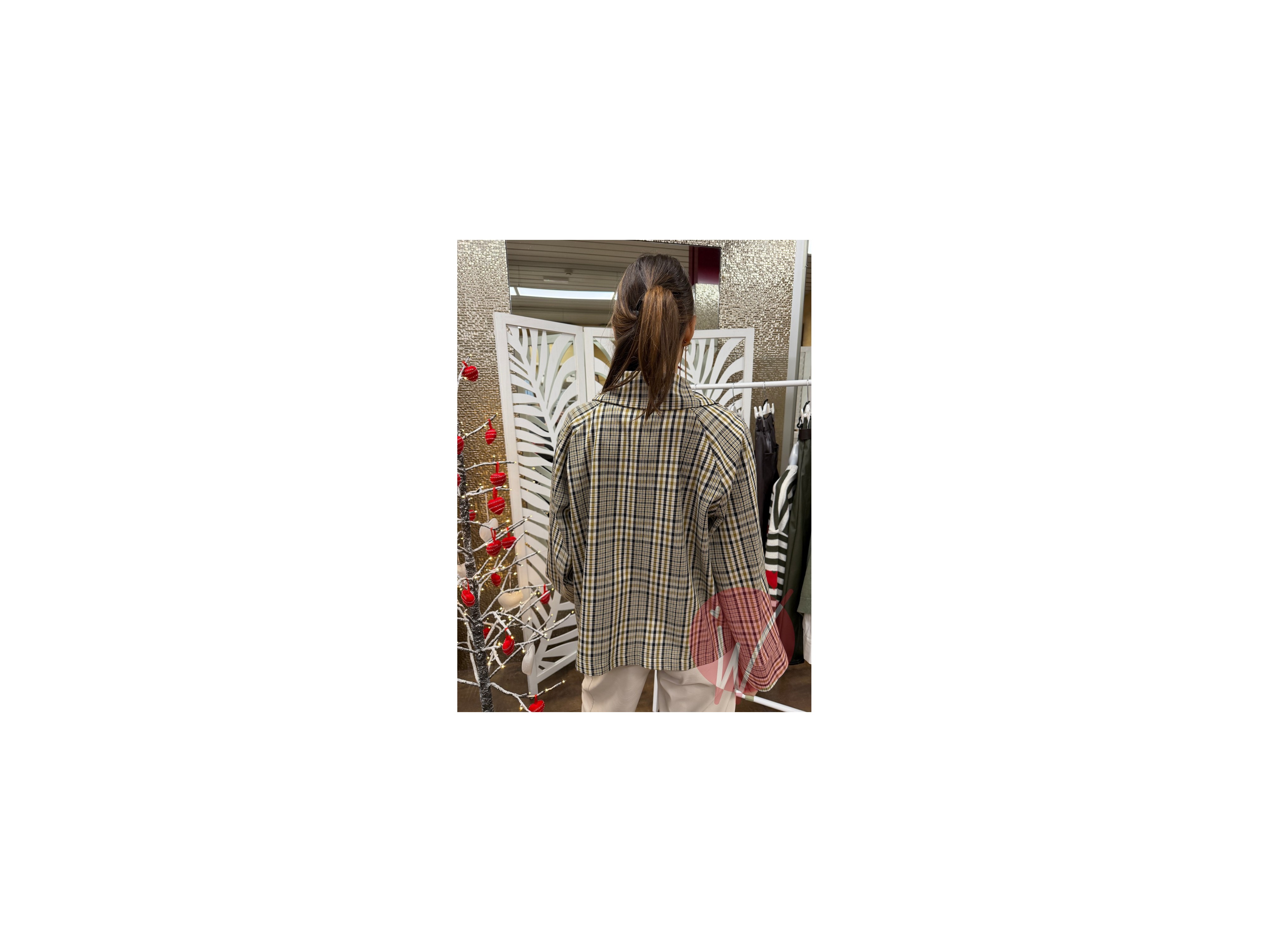 Giacca modello cappa, fantasia check, con bottoni davanti, foderata all'interno, tasche in piedi laterali, maniche ampie, taglio leggermente svasato.