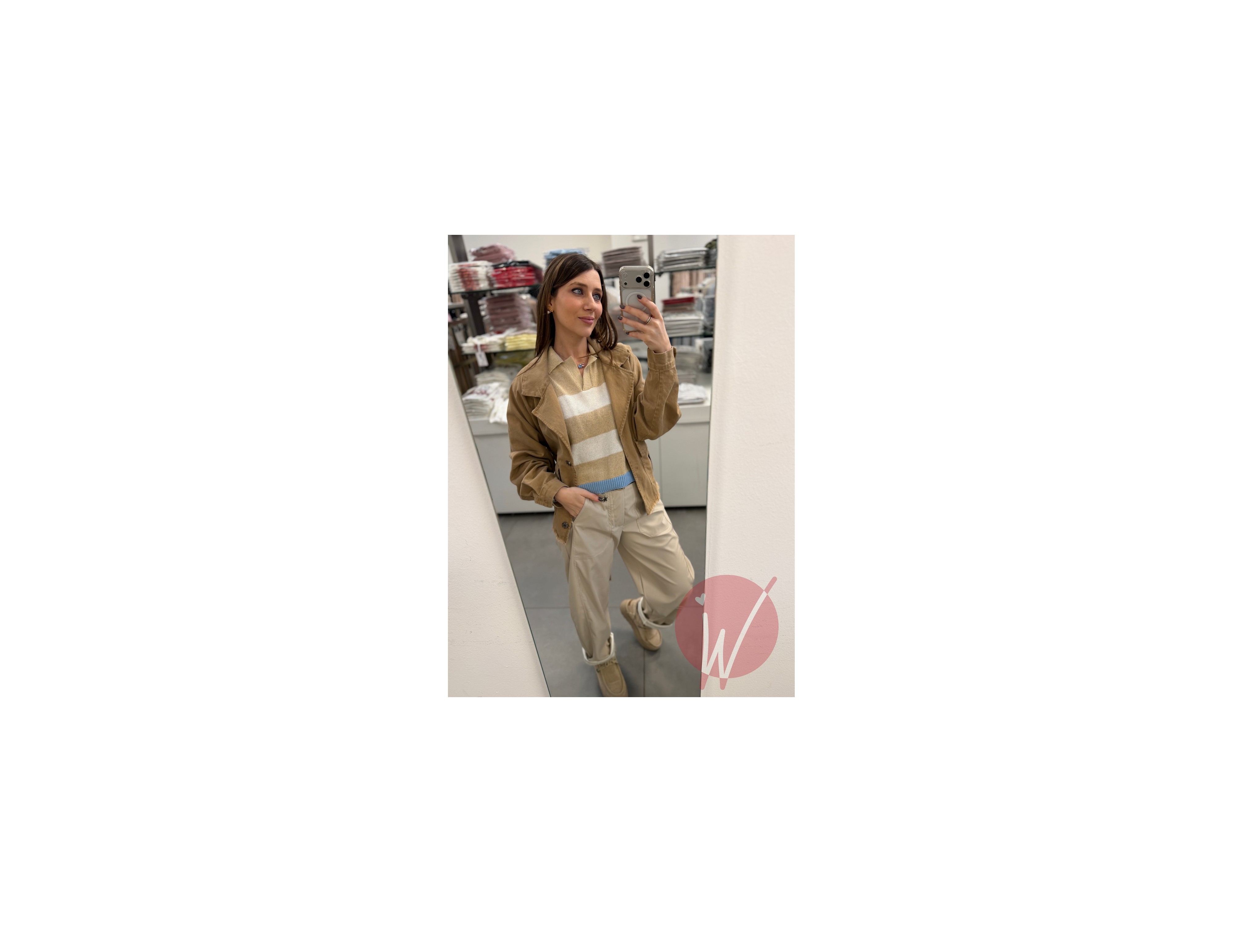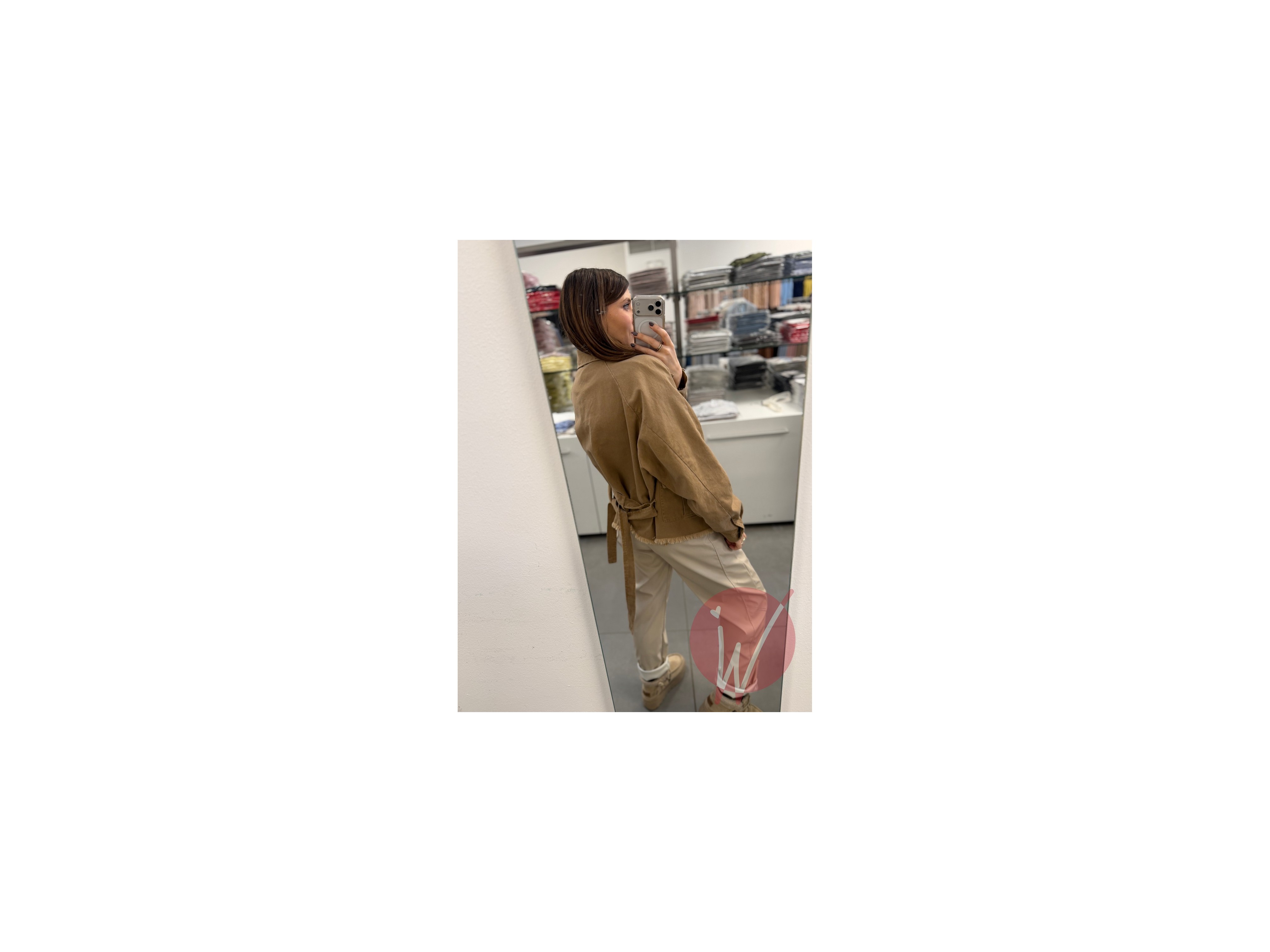 Giacca in drill di cotone, con revers e bordi frangiati in taglio vivo, bottoni automatici di chiusura davanti, tasche ampie, passanti in vita da portare con cintura abbinata.