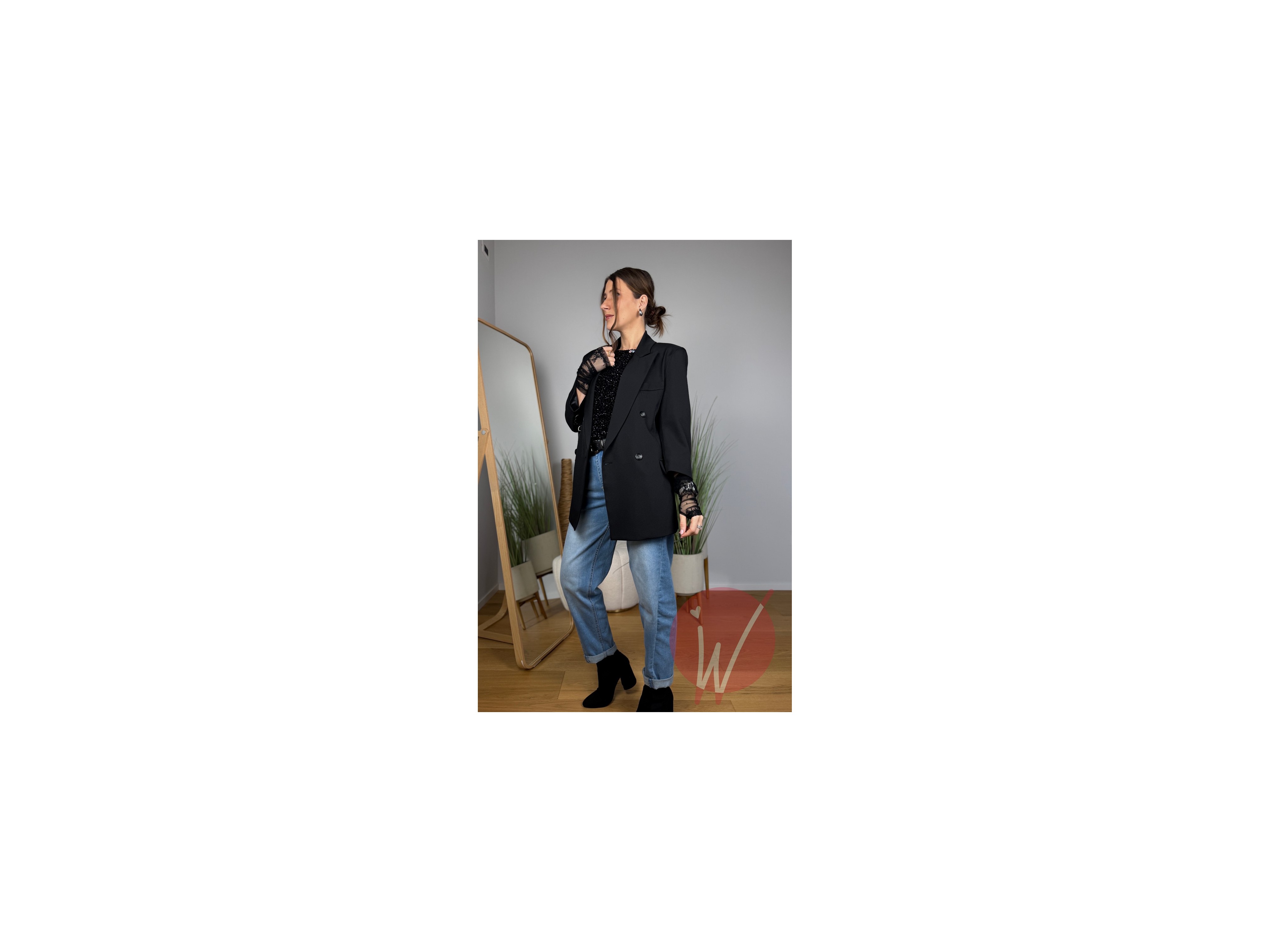 Blazer doppiopetto, taglio dritto uomo, con revers a lancia, manica a 3/4 con manicotti di pizzo, foderata all'interno, finte tasche laterali con pattina.