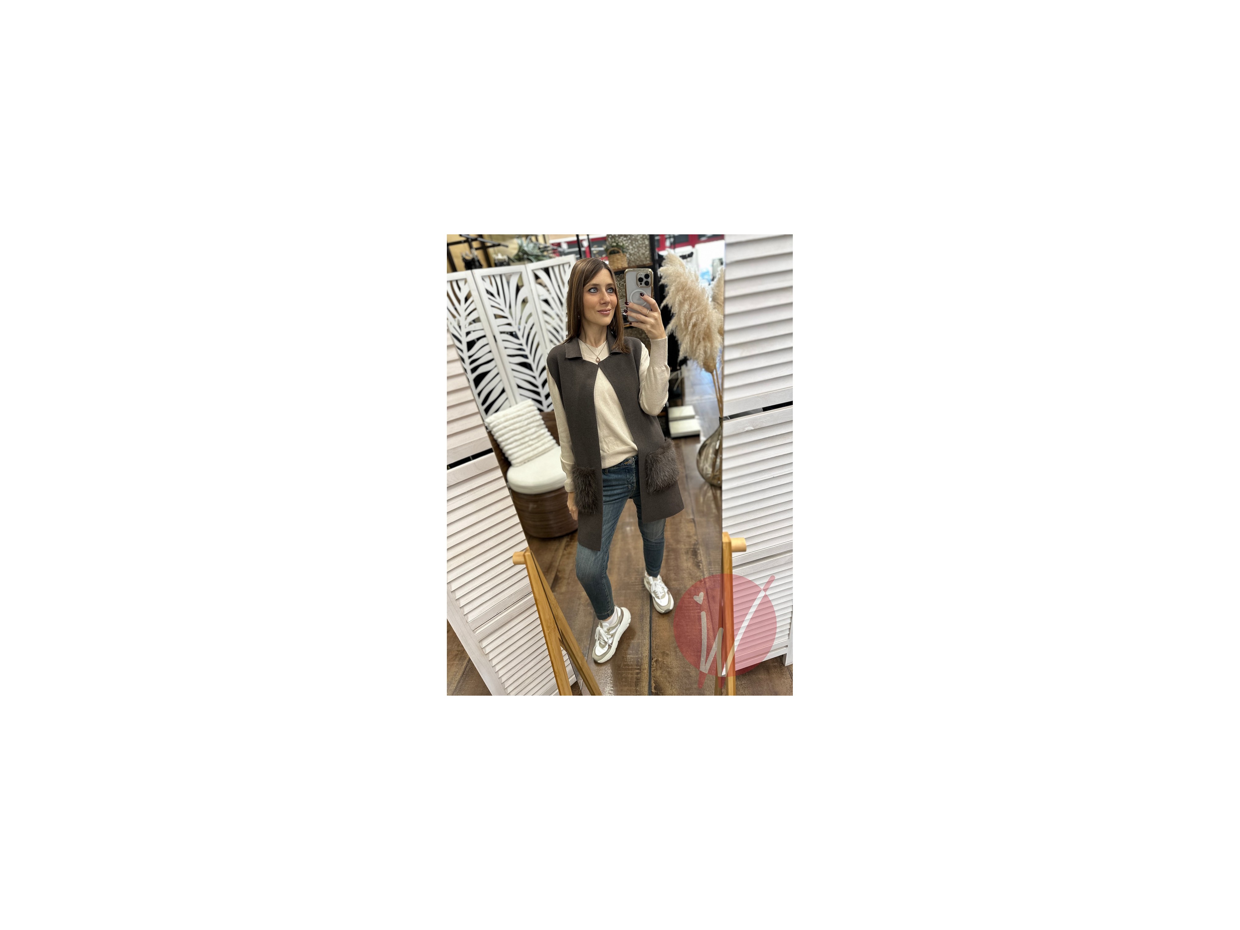 Gilet smanicato in viscosa morbida e calda, con colletto revers, tasche profonde rivestite in ecopelliccia.