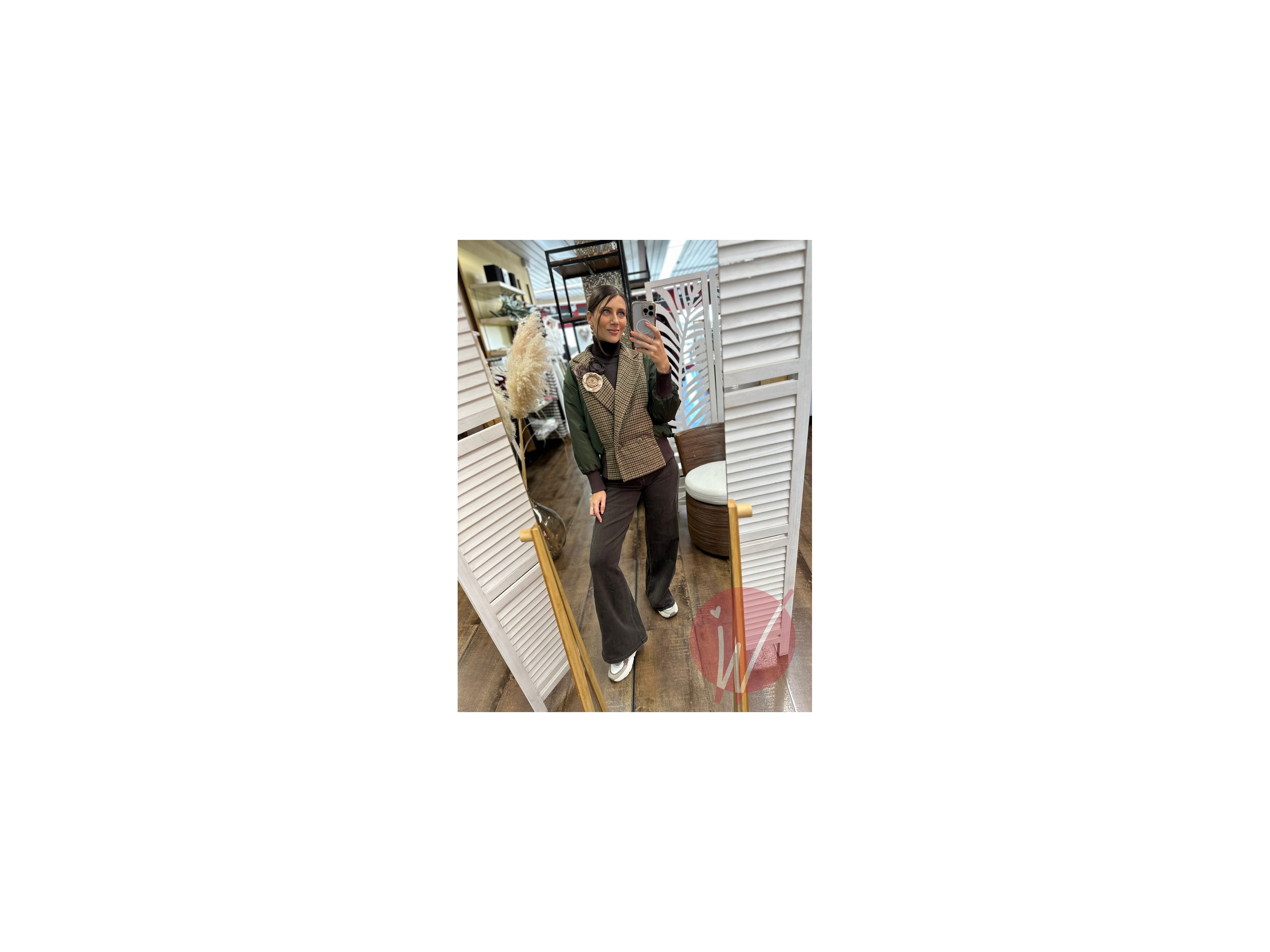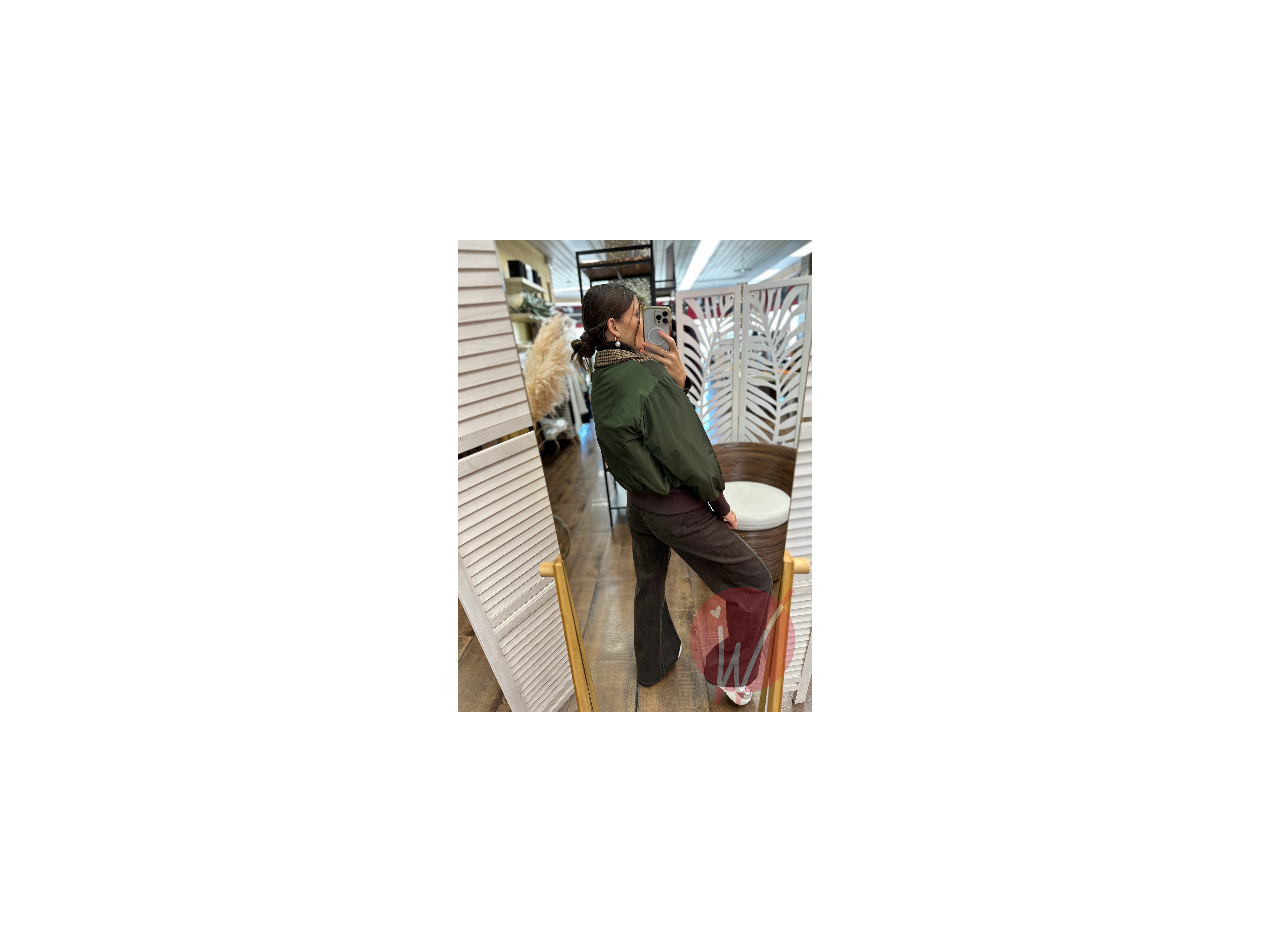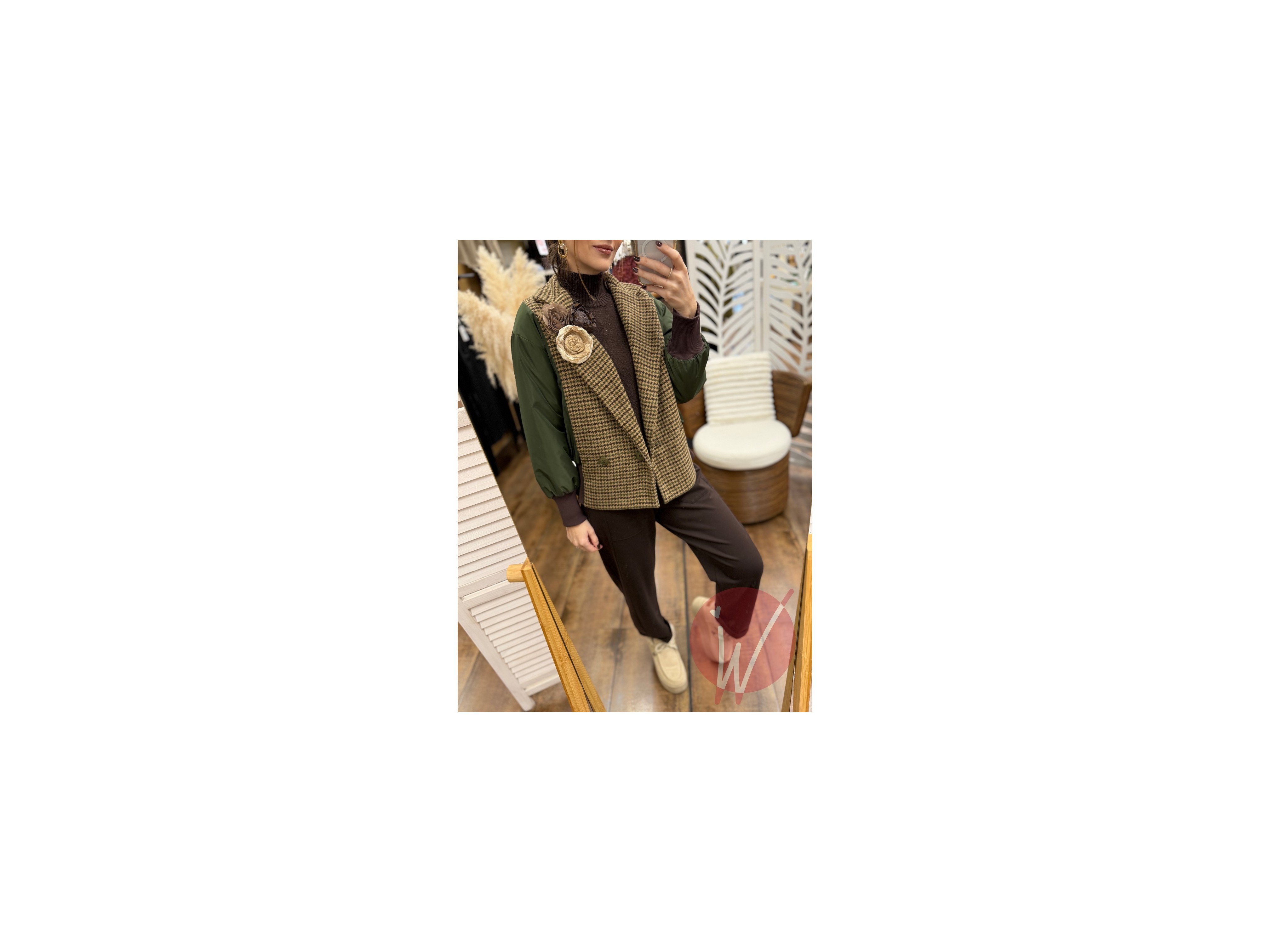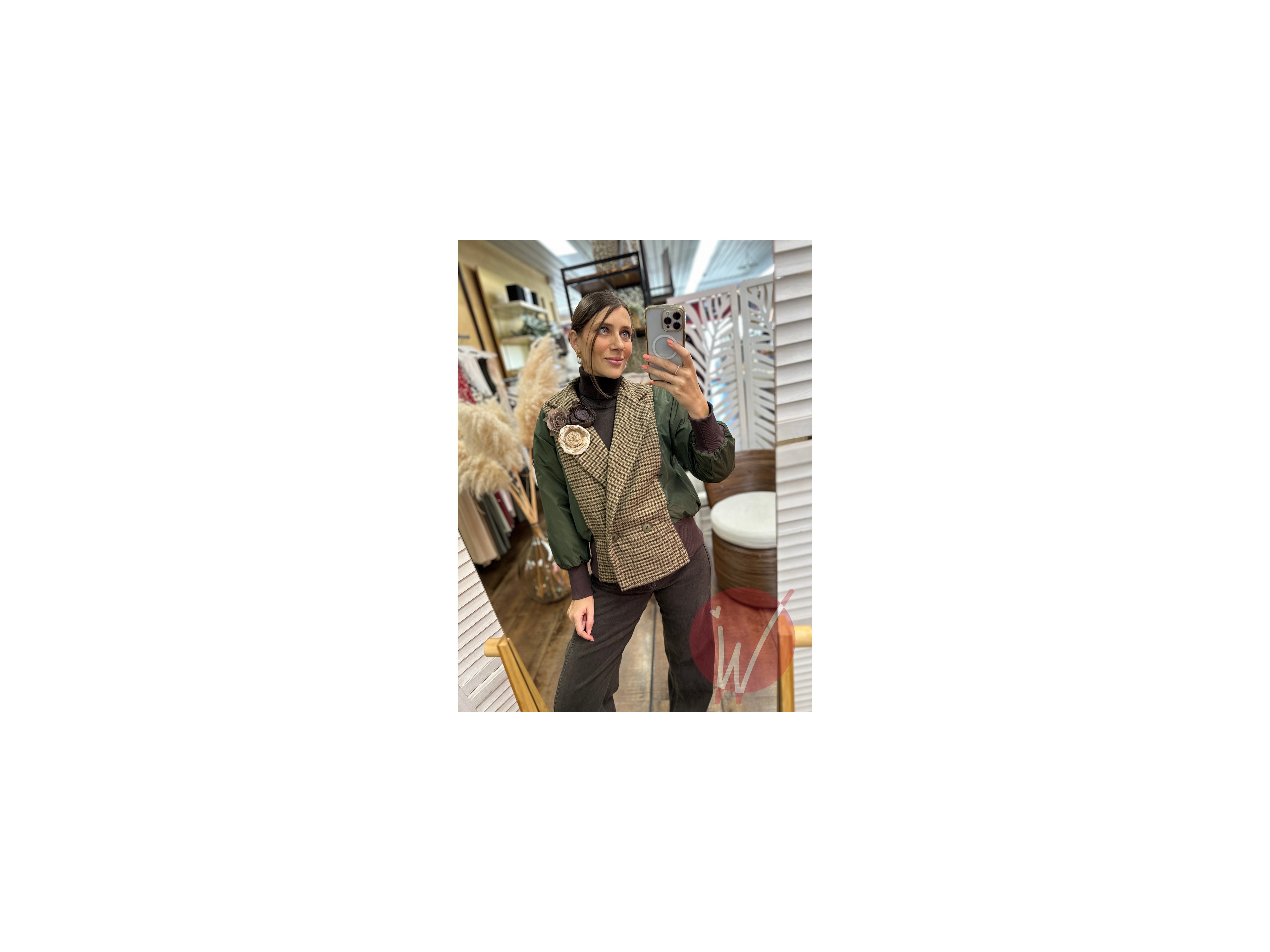 Bomber leggermente imbottito, chiusura a doppiopetto, revers a lancia in pied de poule, elastico in vita, rose cucite a lato.