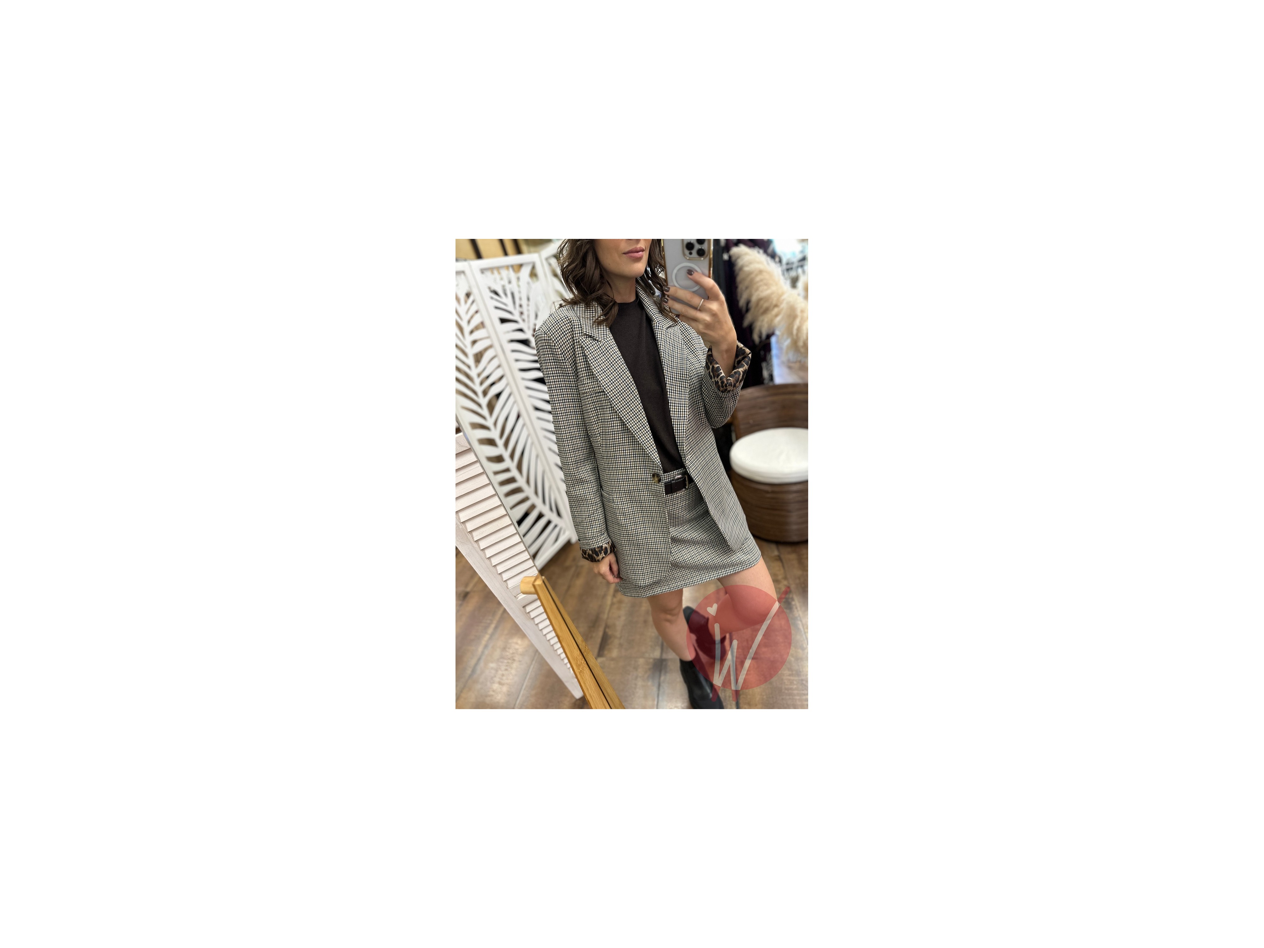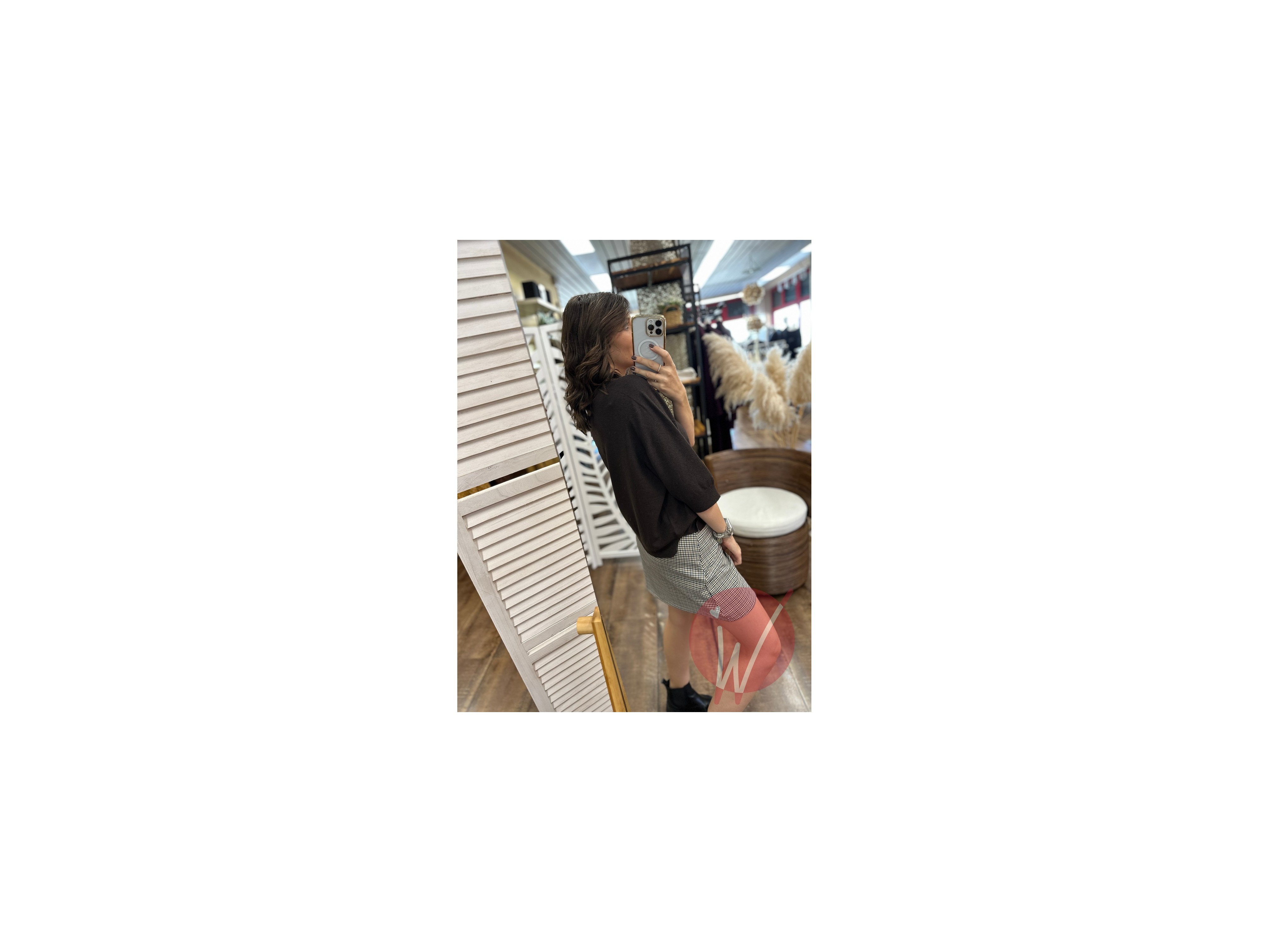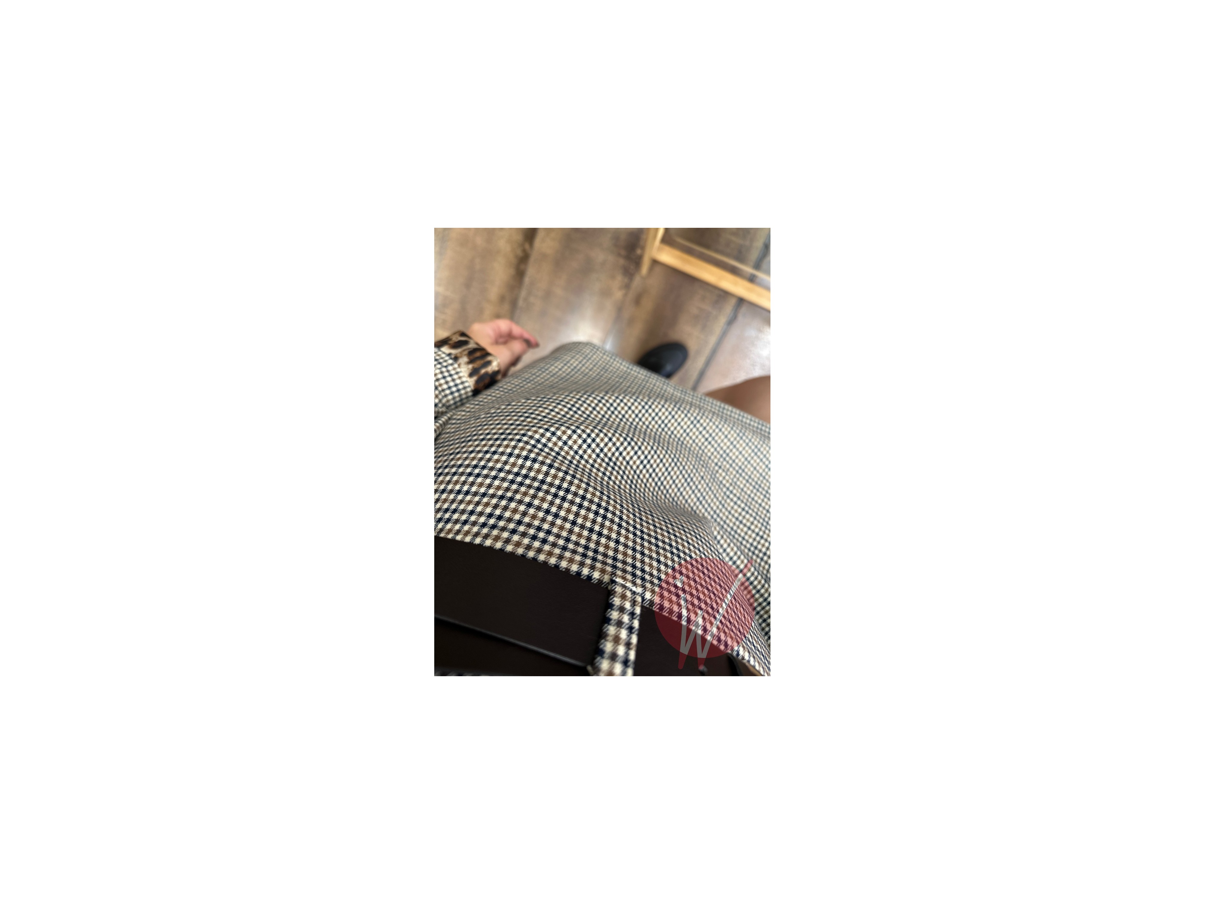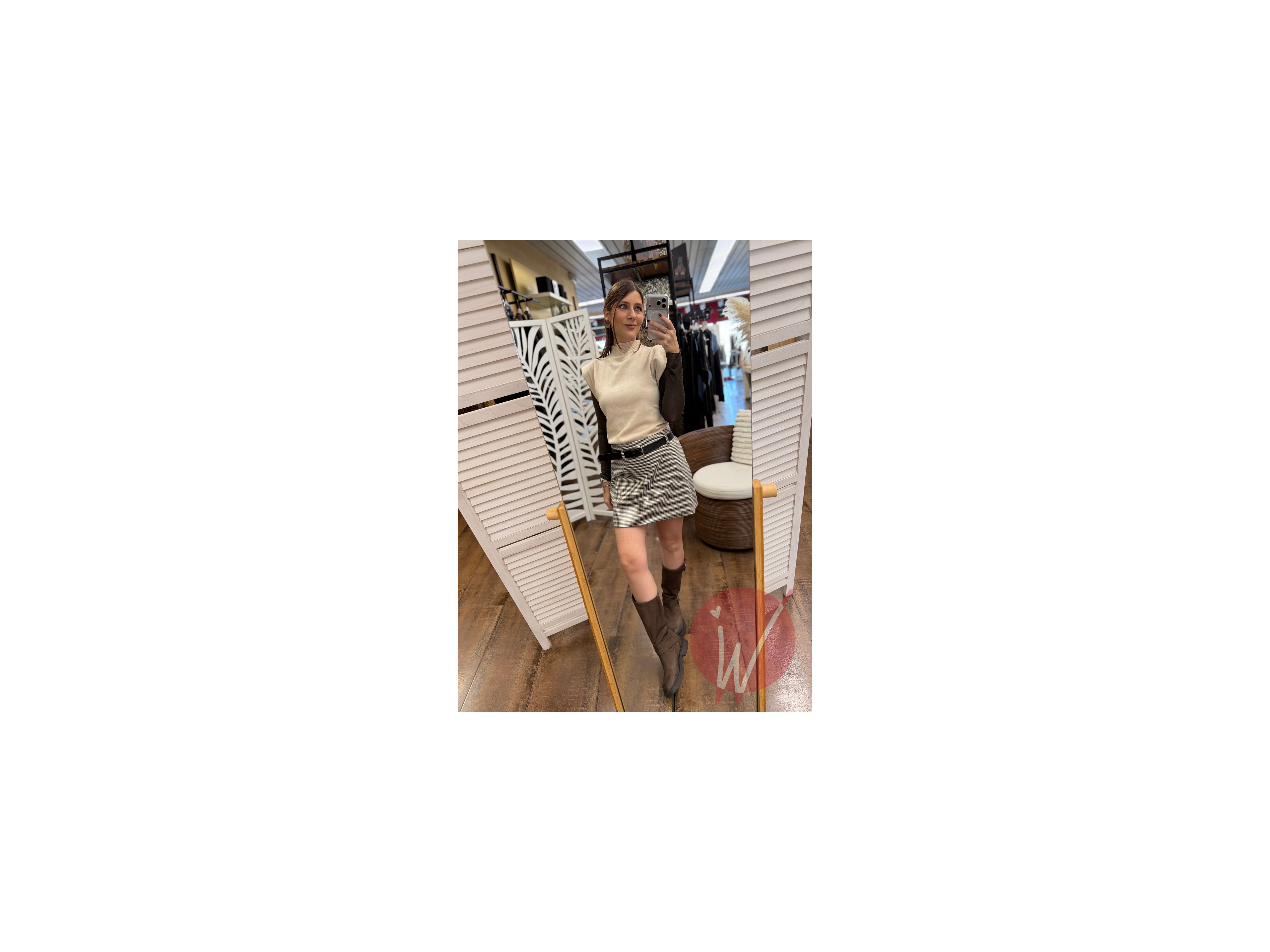 Minigonna in fantasia check, leggermente svasata sul fondo, con passanti e cintura in vita inclusa. Chiusura con zip a lato.