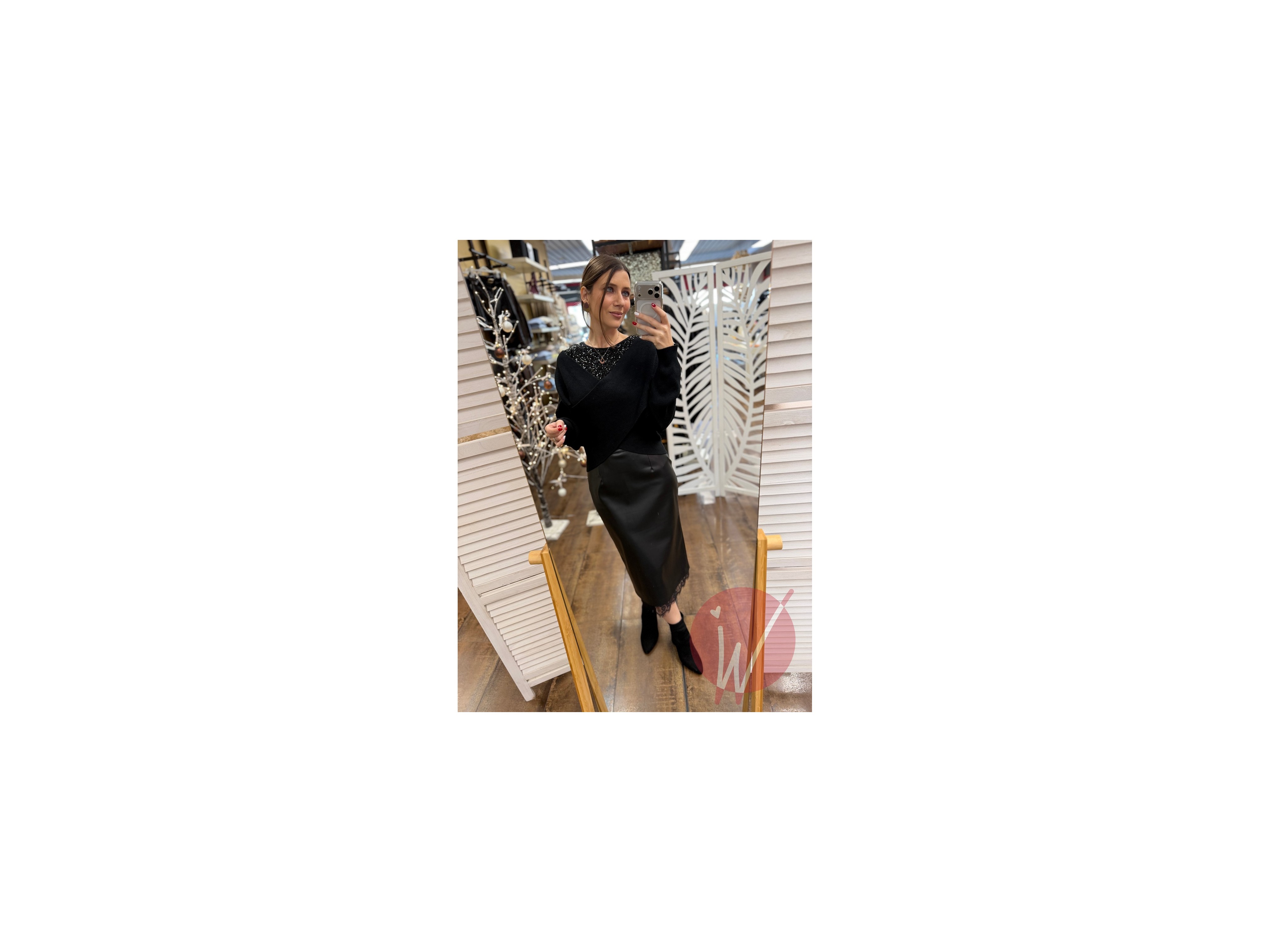 Longuette in ecopelle, lunghezza midi, modello a tubino con profilo di pizzo sul fondo, chiusura sul retro con zip.
