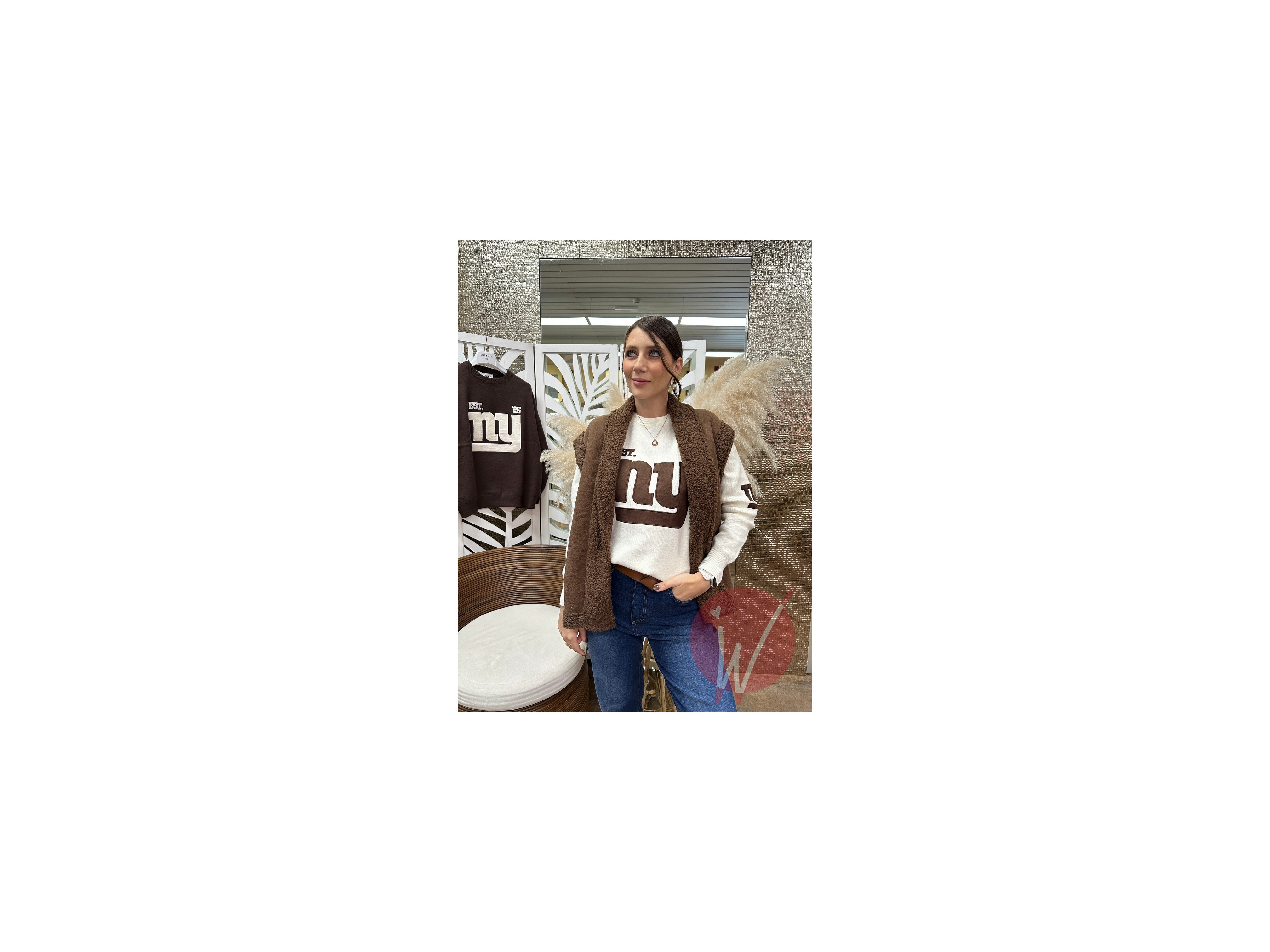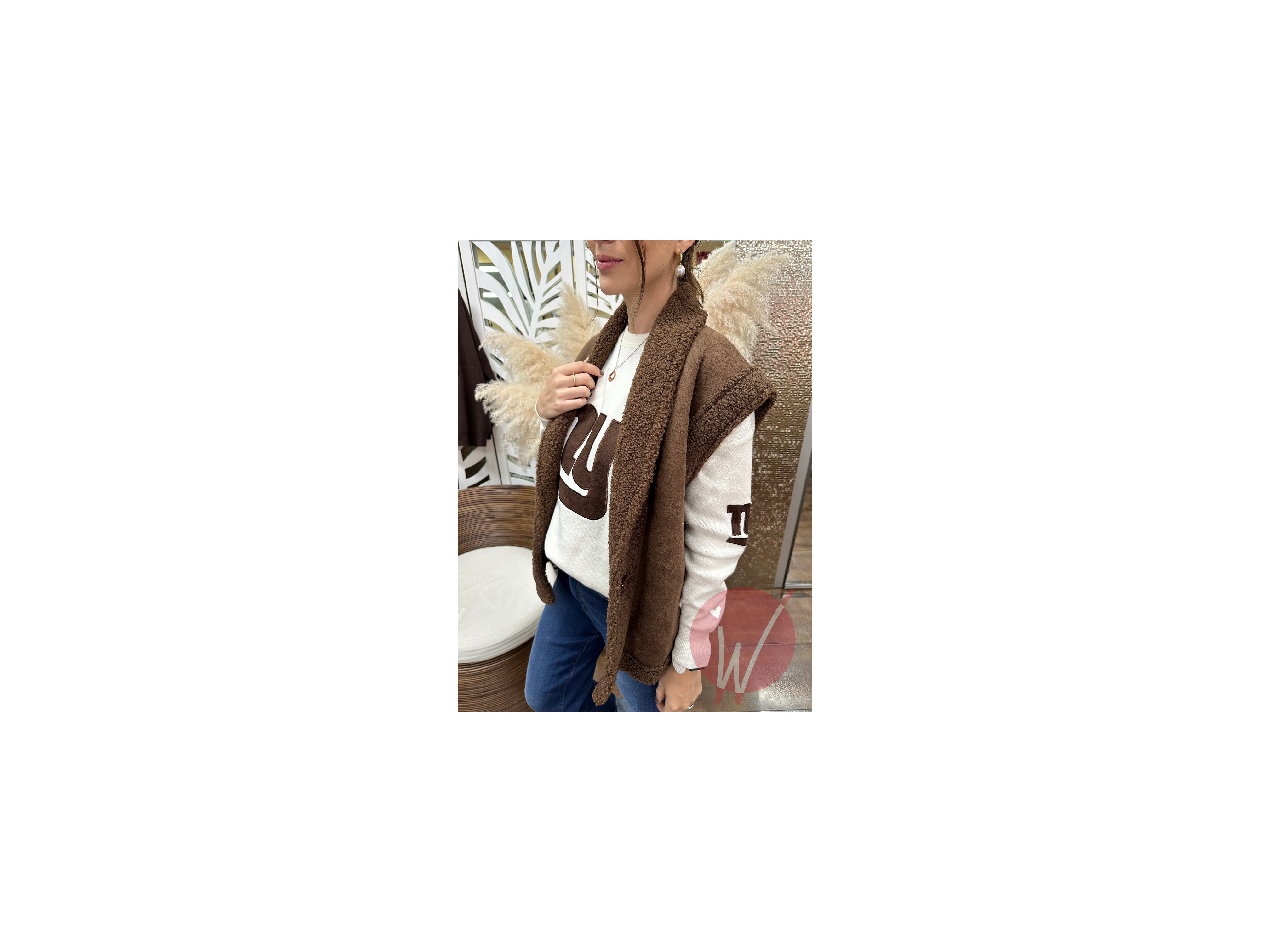 Gilet smanicato con revers effetto teddy, con bottone di chiusura davanti, taglio dritto a scatola.