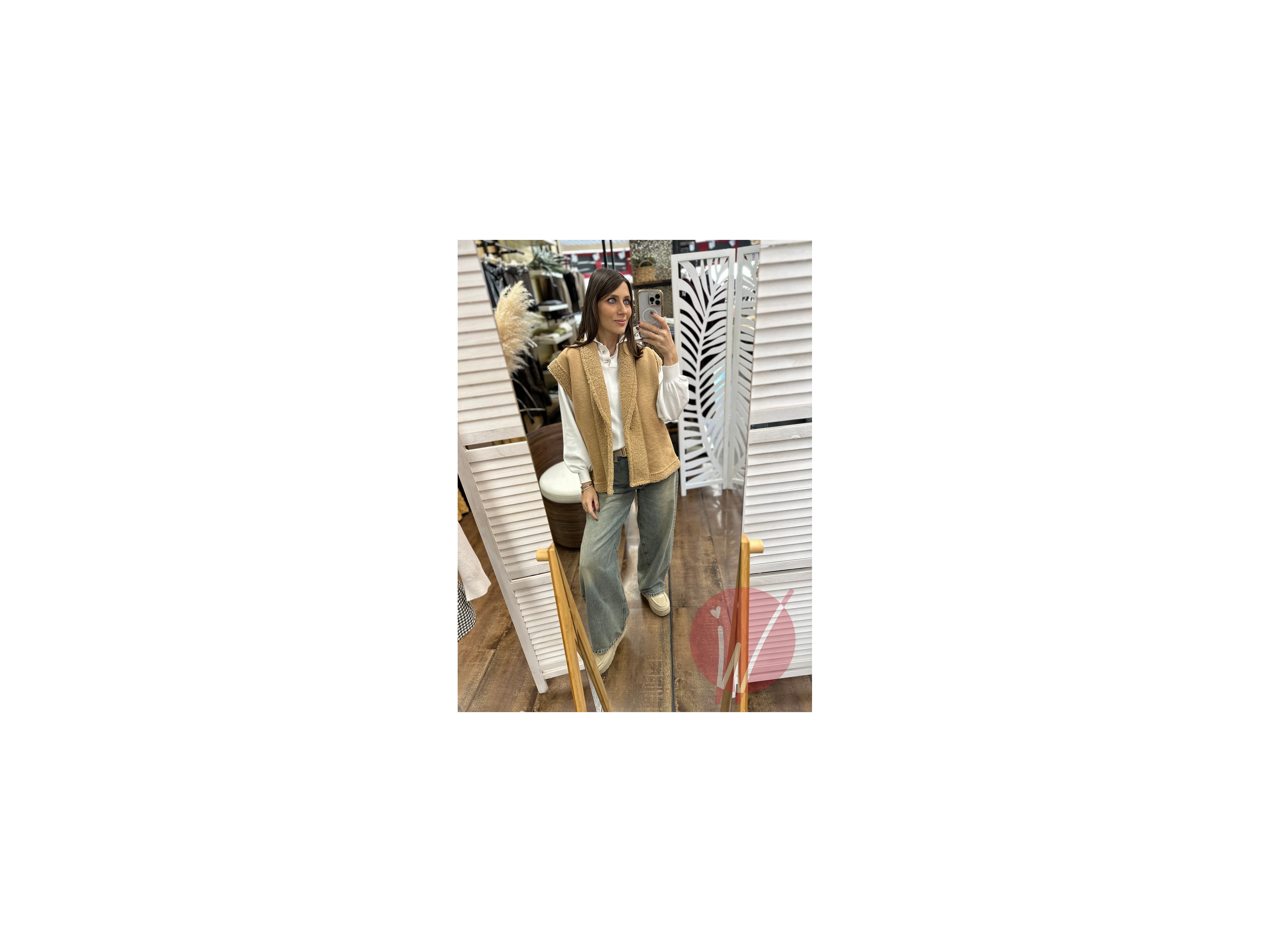 Gilet smanicato con revers effetto teddy, con bottone di chiusura davanti, taglio dritto a scatola.