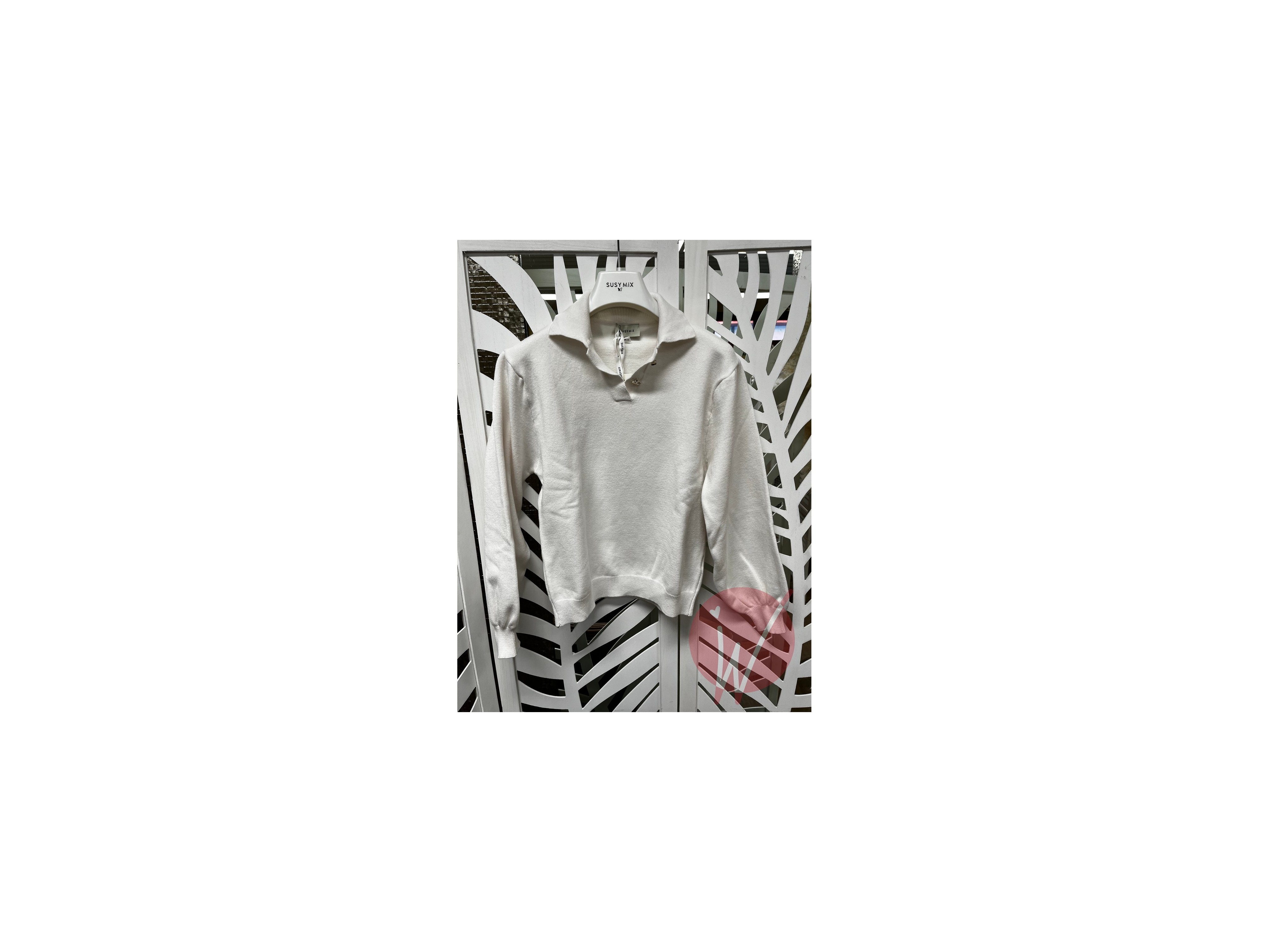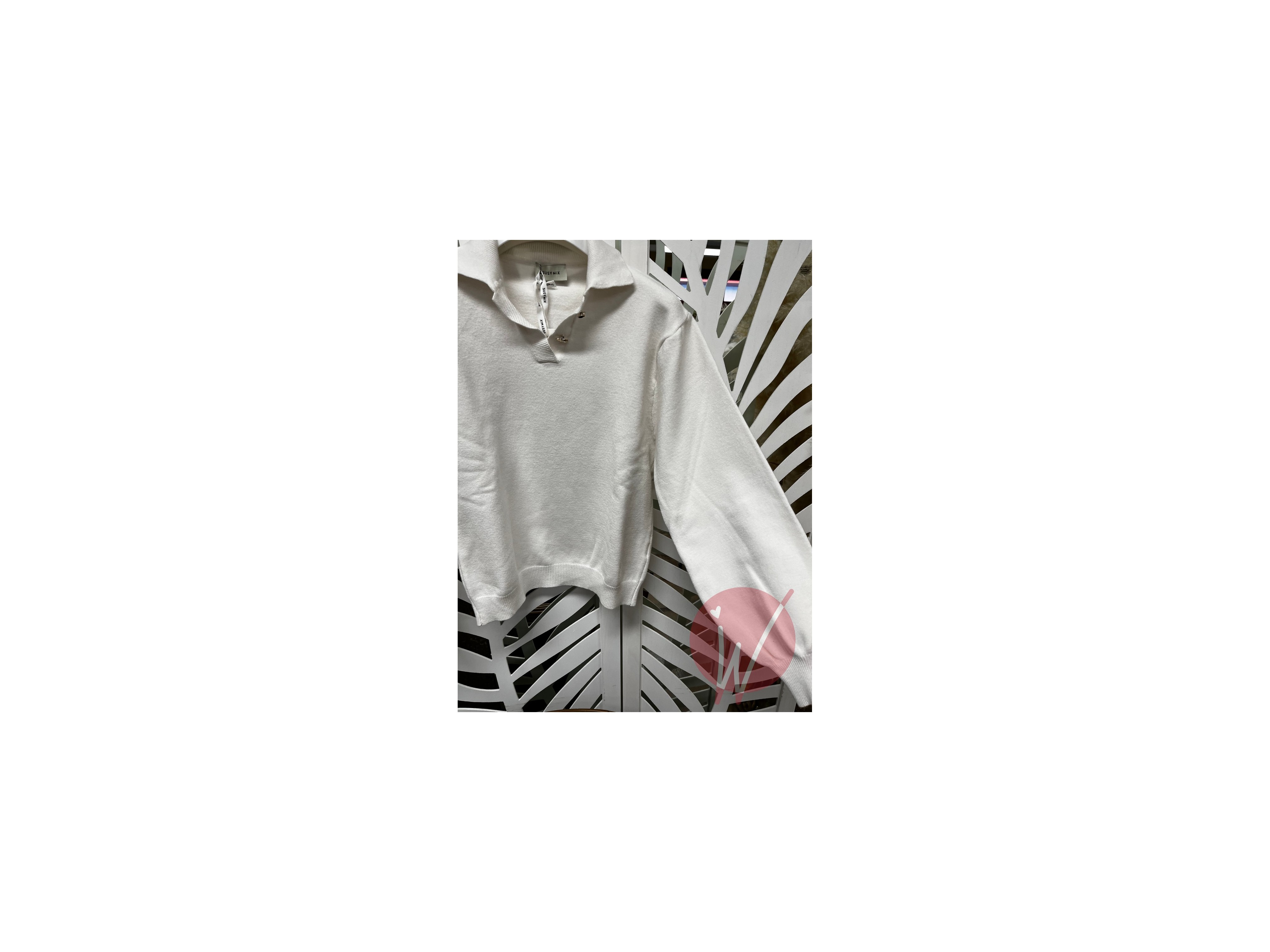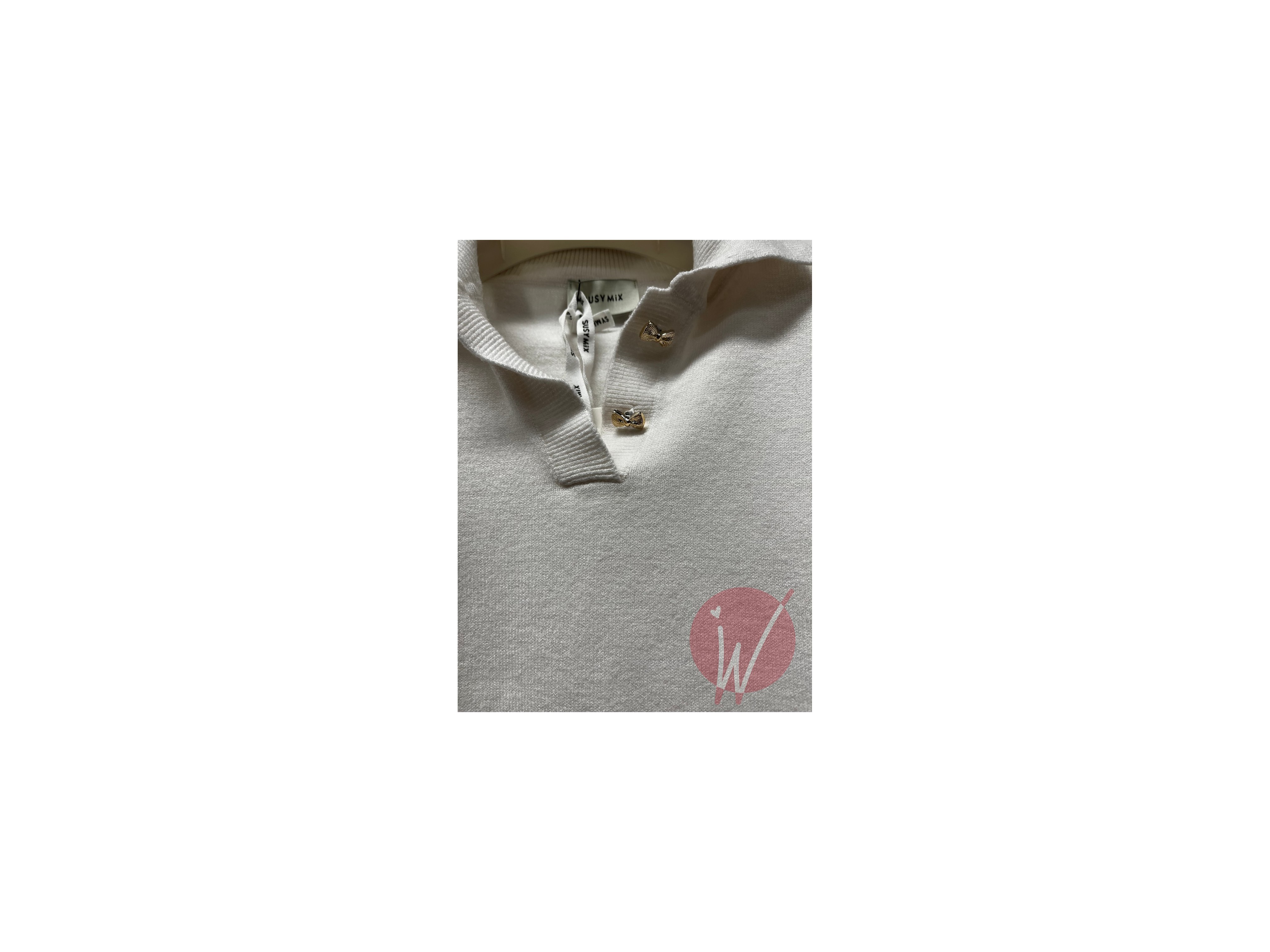 Maglia in viscosa morbida e calda con colletto a polo, bottoncini a fiocchetto come dettaglio, maniche a palloncino.