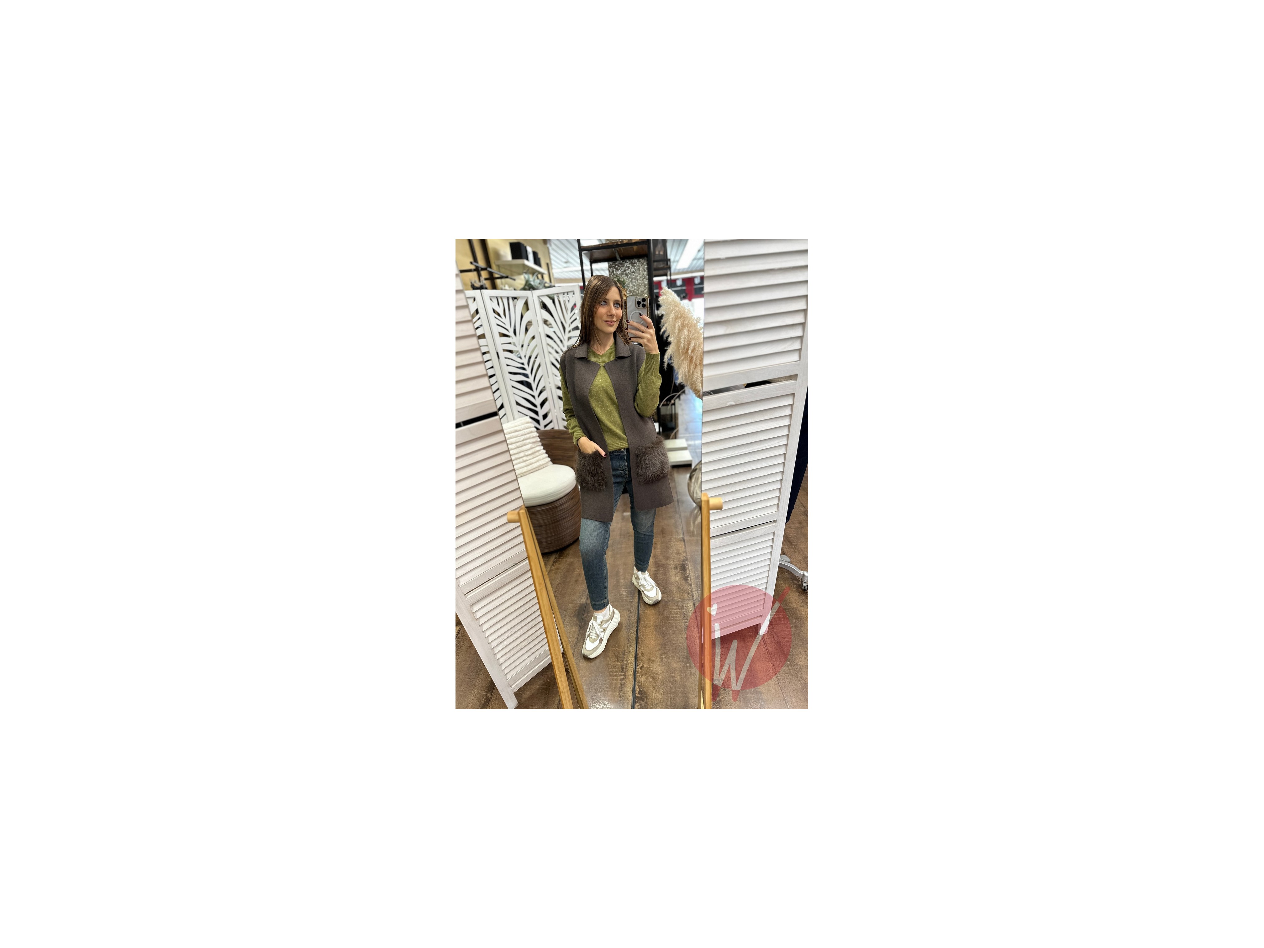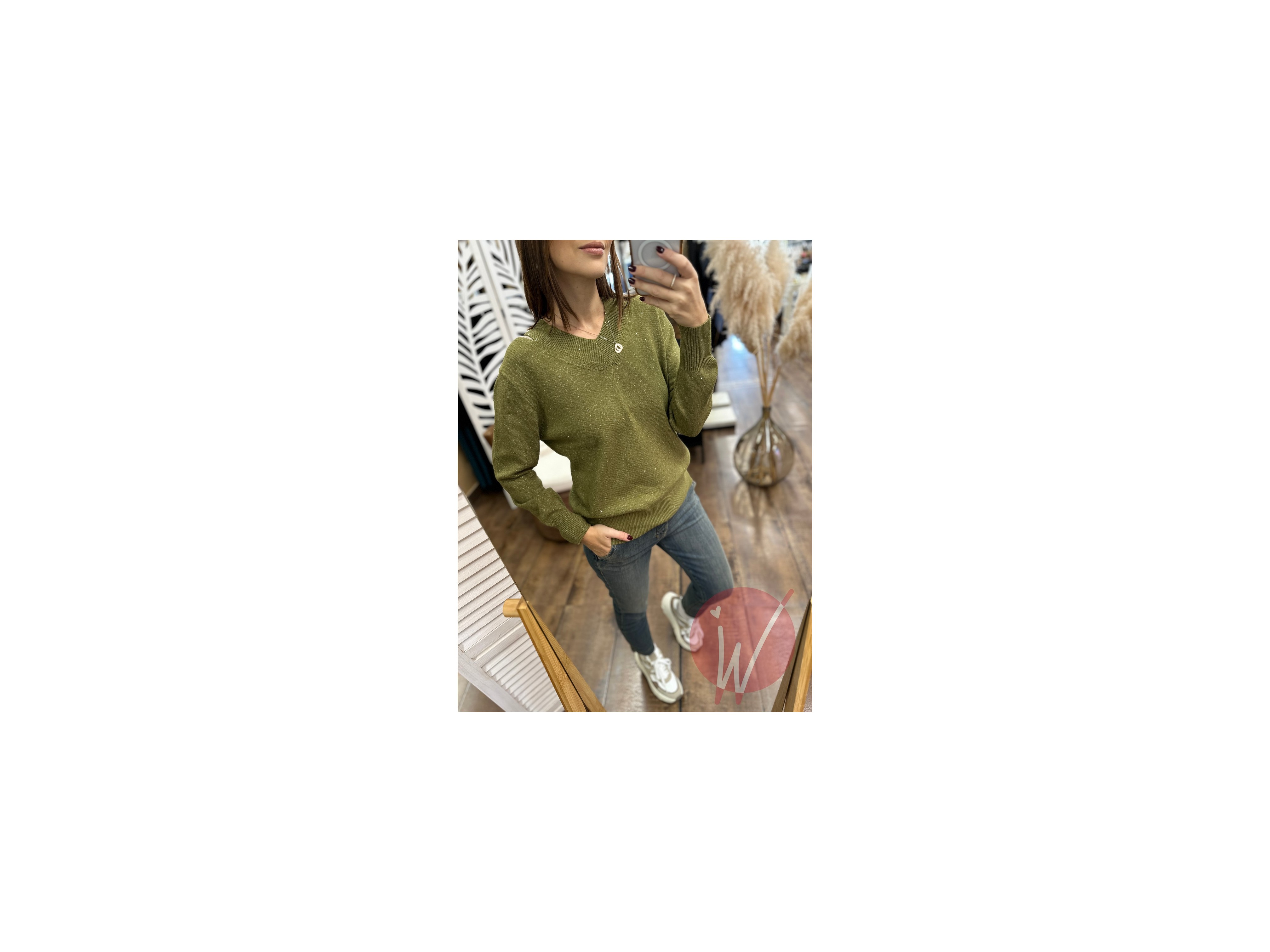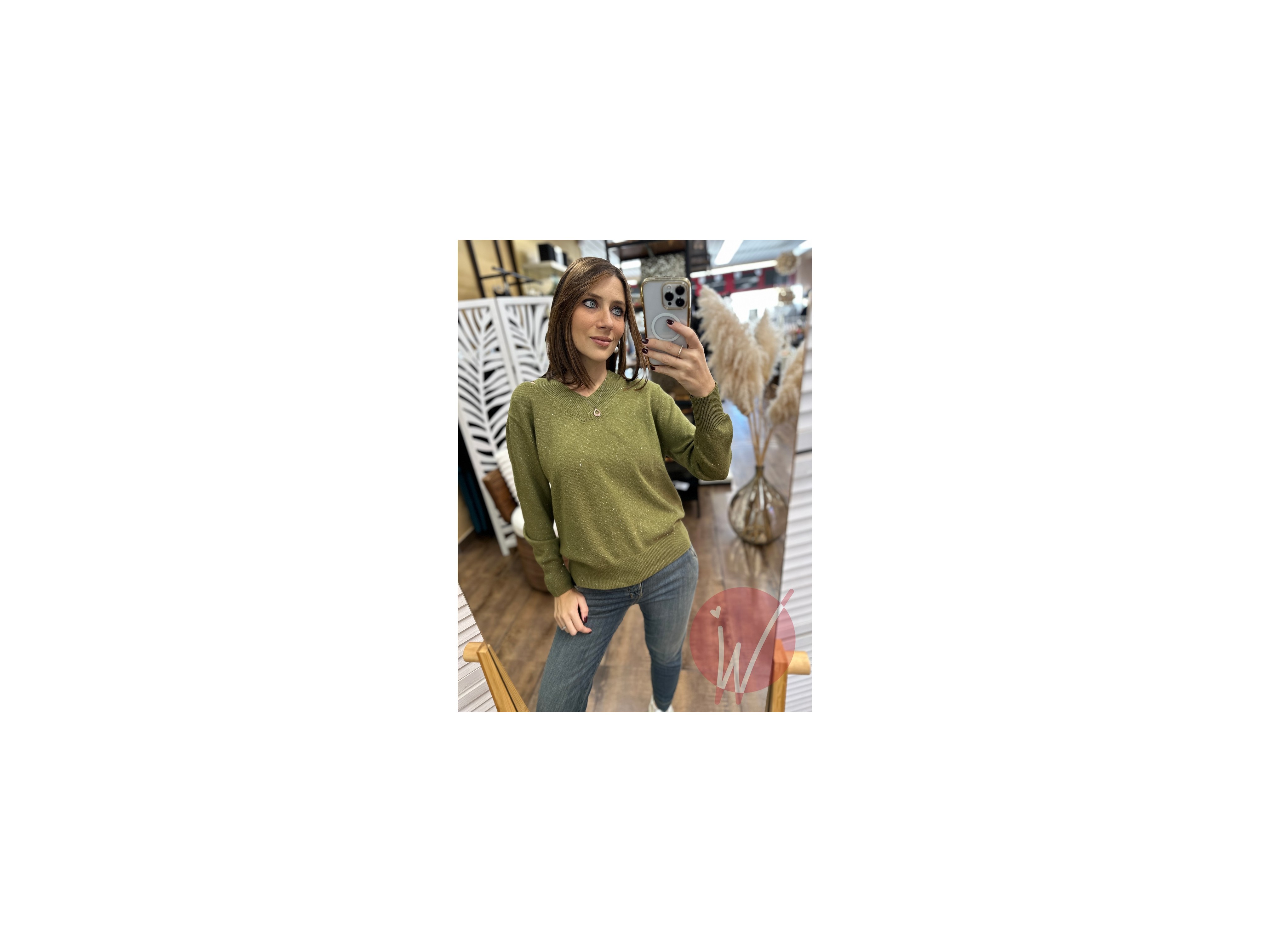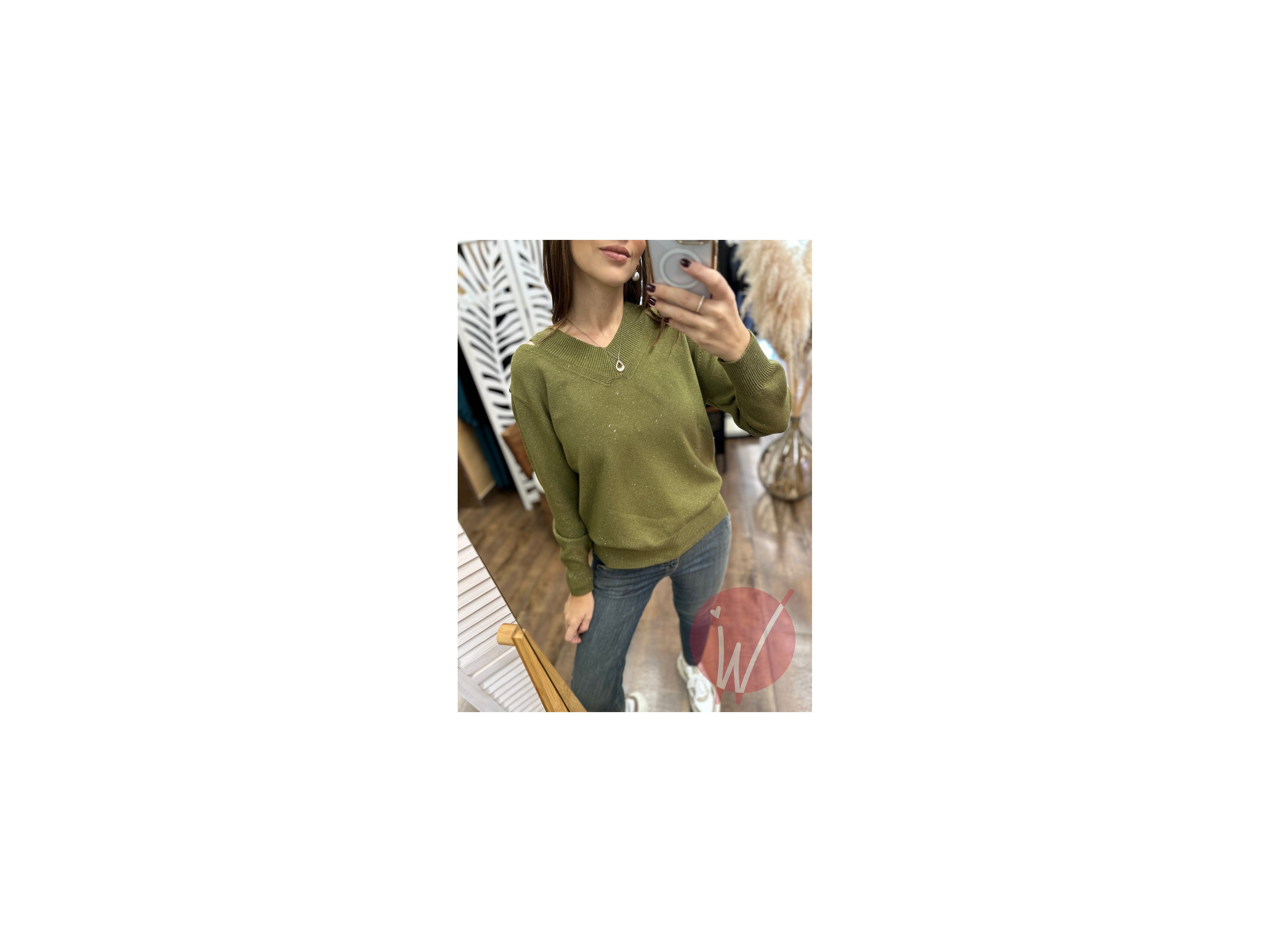 Maglia in viscosa morbida con micropaillettes e filo di lurex all'interno, scollo a V e piccoli spacchi sulle spalle.