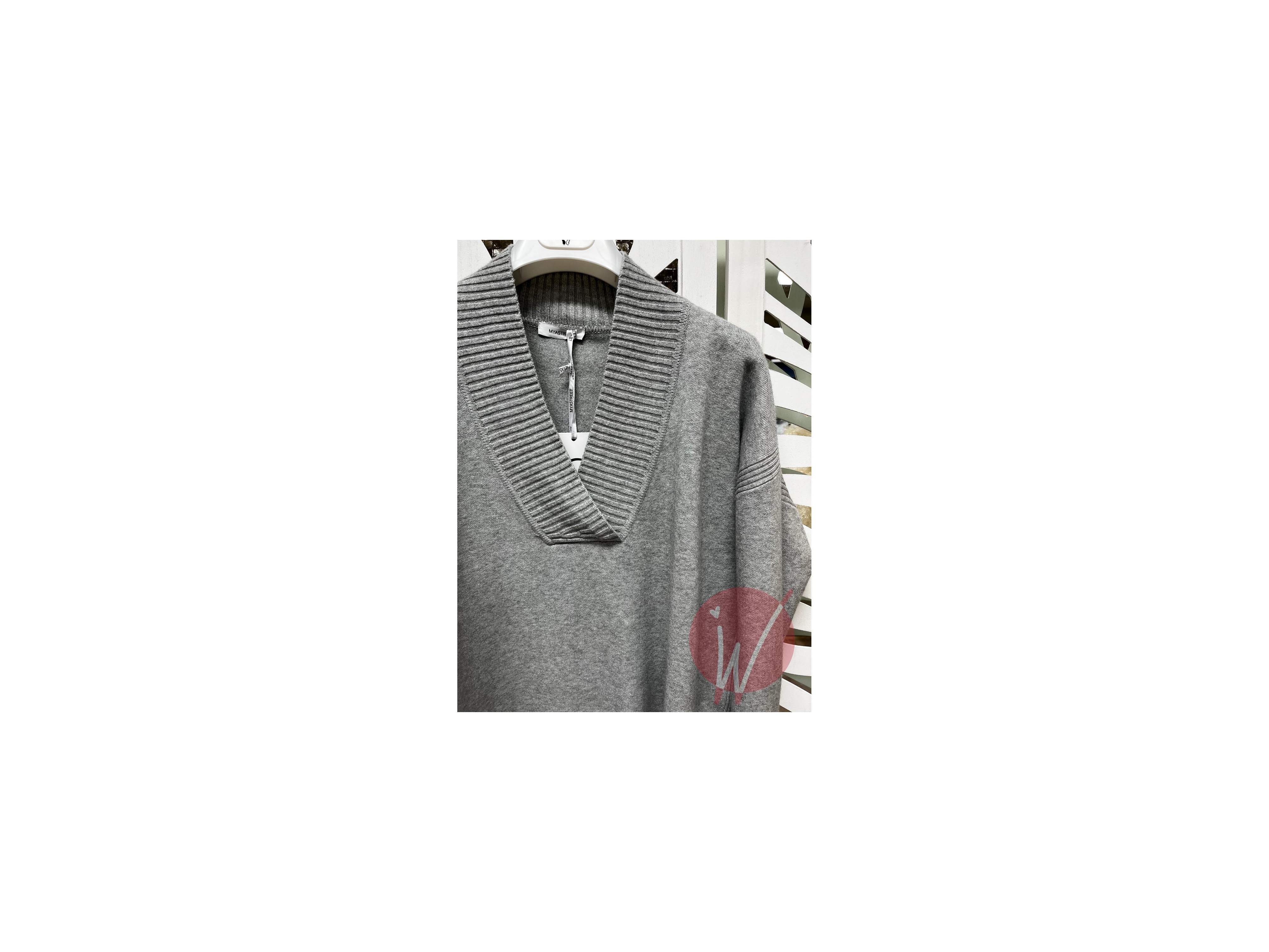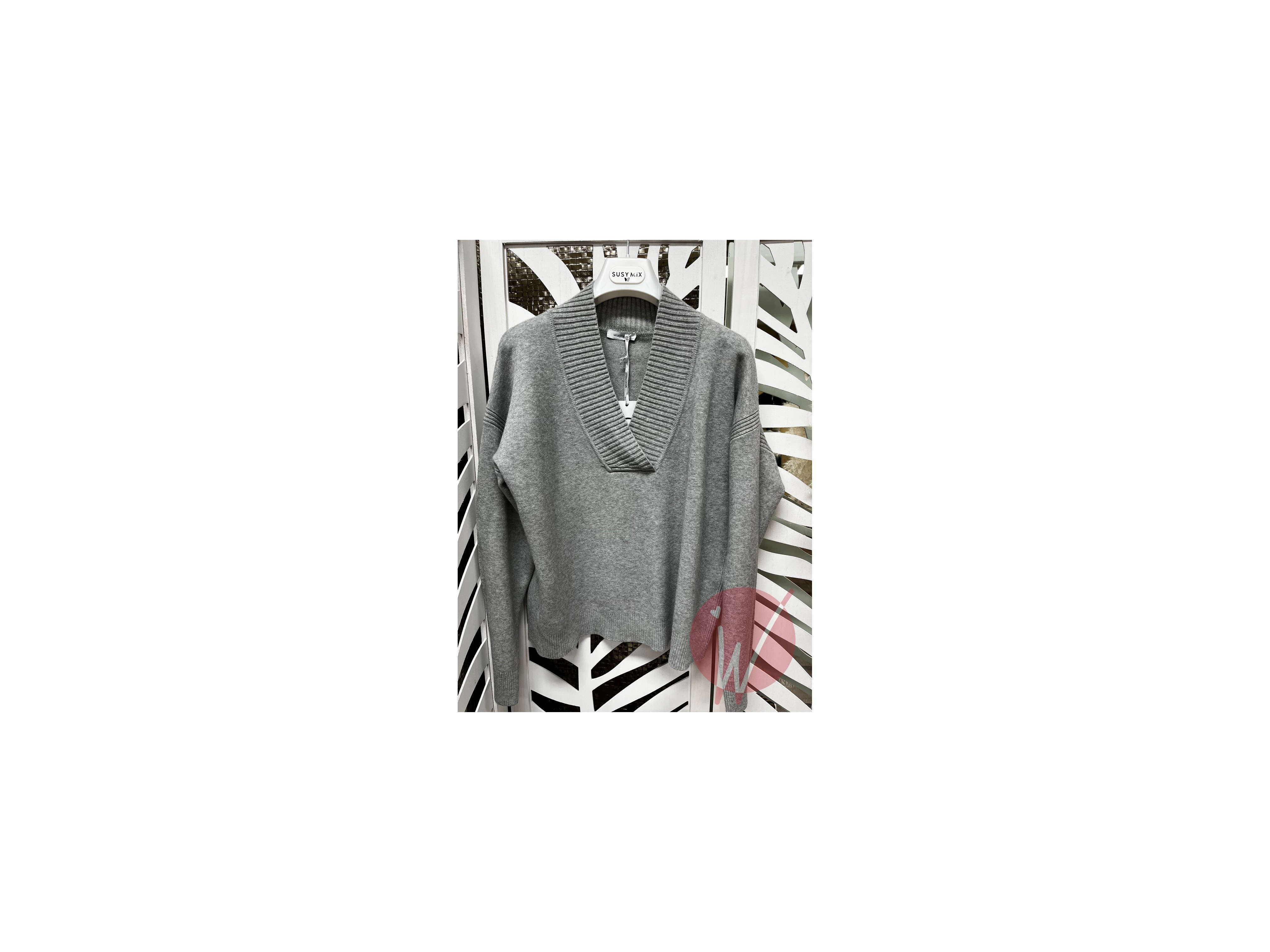 Maglia in viscosa morbida e calda, taglio leggermente over, con scollo a v a costine incrociato, rifinito a costine sul girospalla e sui lati.