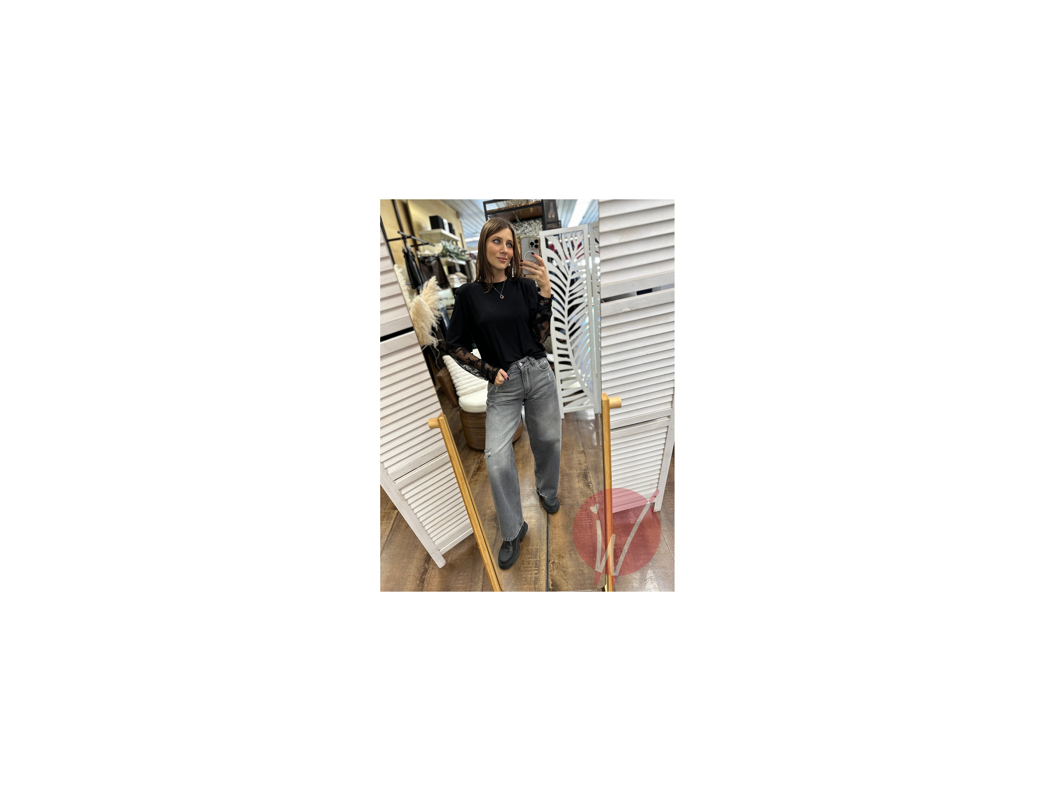 Maglia in viscosa elasticizzata, taglio a scatolina leggermente crop, mezza manica in pizzo morbido, spallina leggermente imbottita.