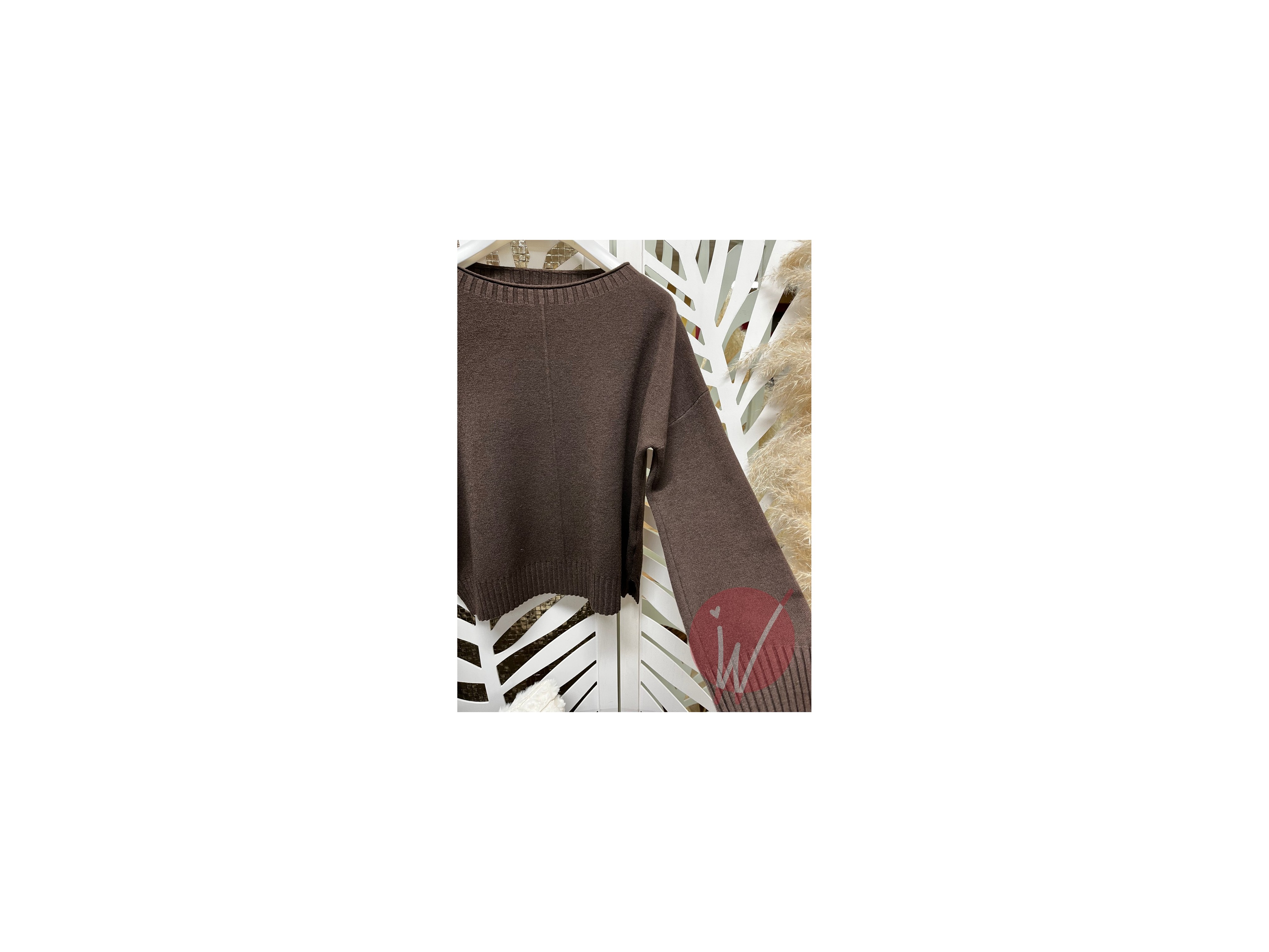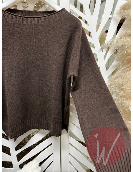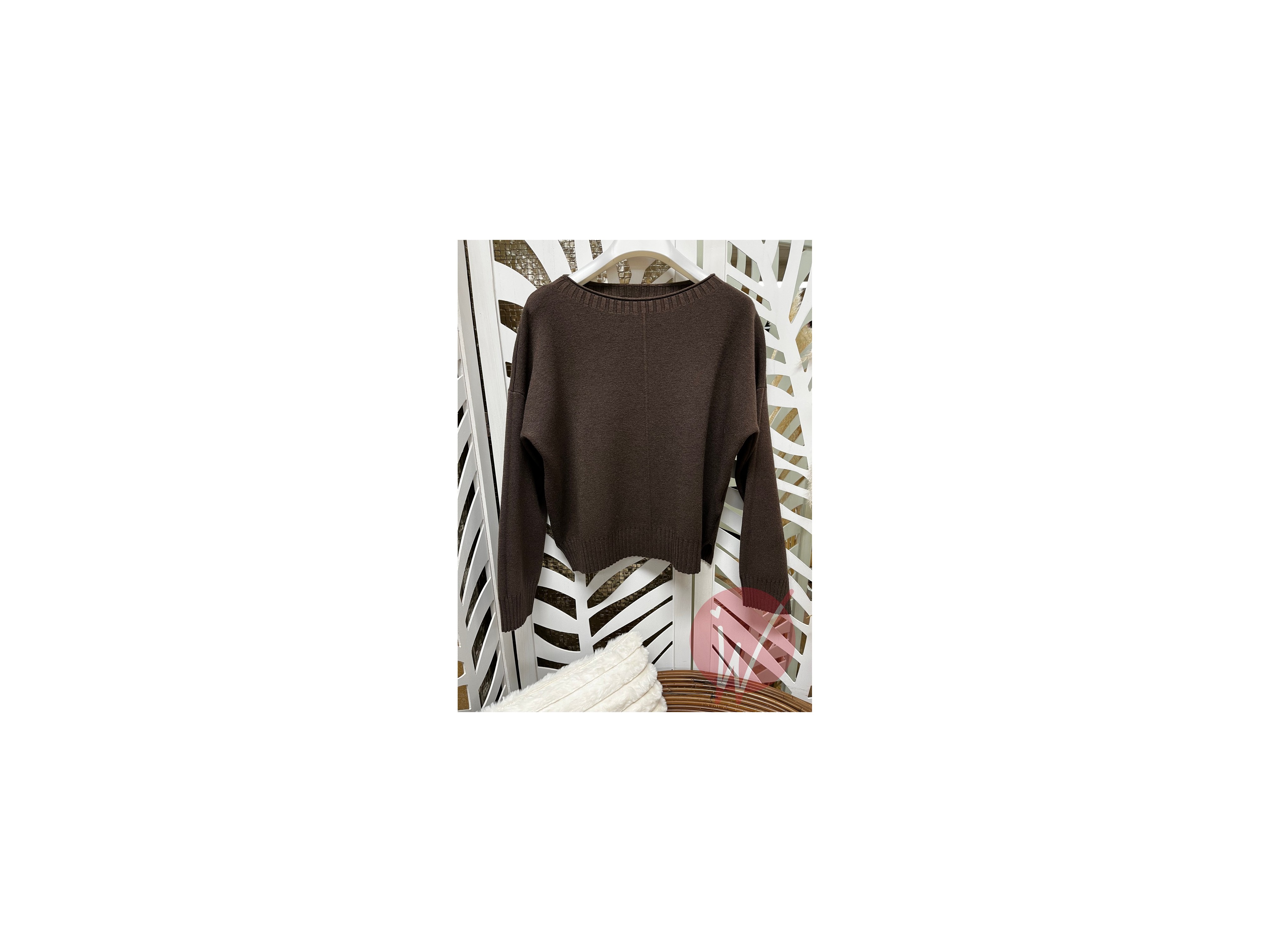 Maglia in viscosa morbida e calda, con collo tondo a costine, taglio dritto con spacchetti ai lati e fascione a costine verticali, profilatura in rilievo centrale davanti.