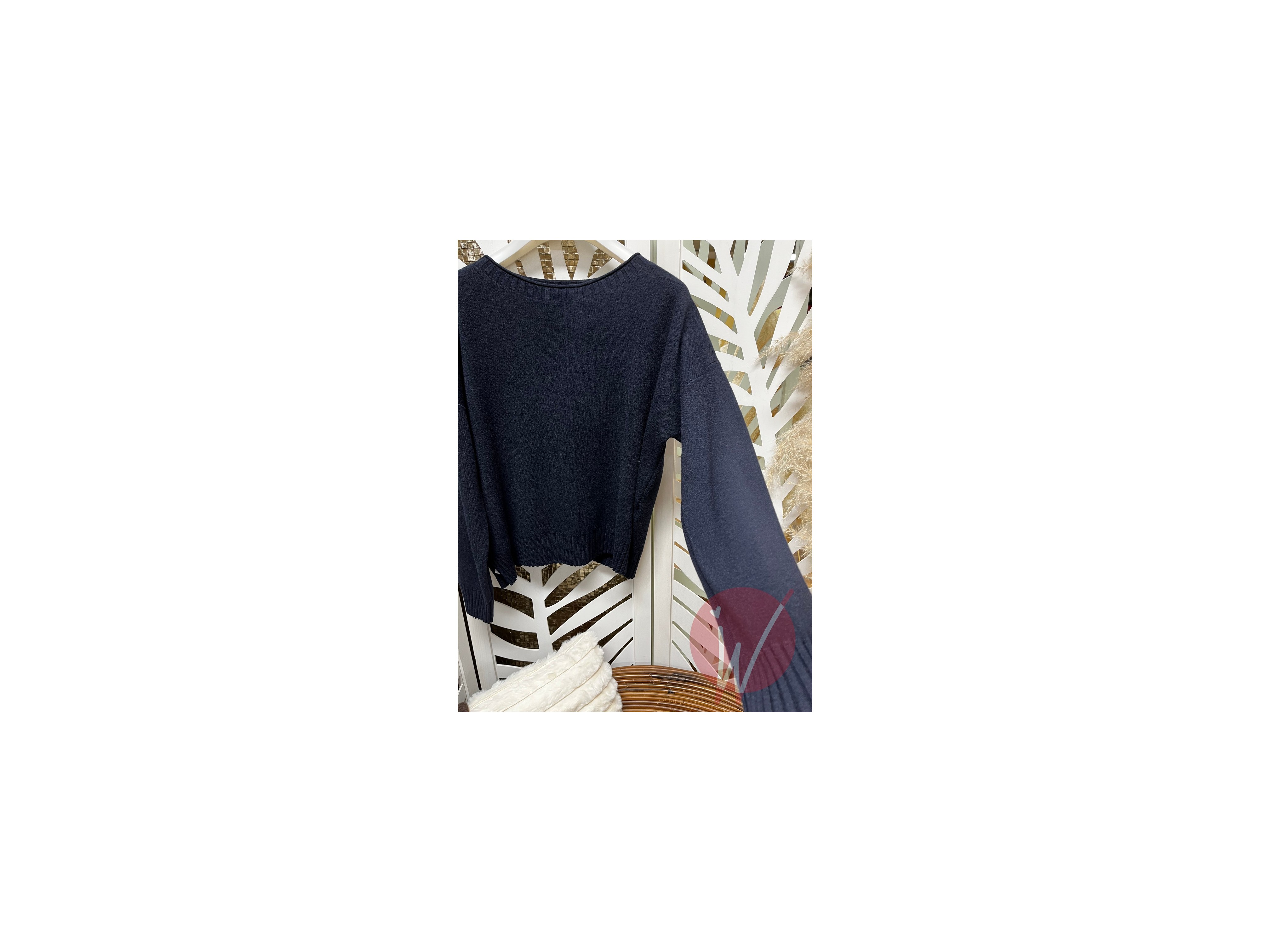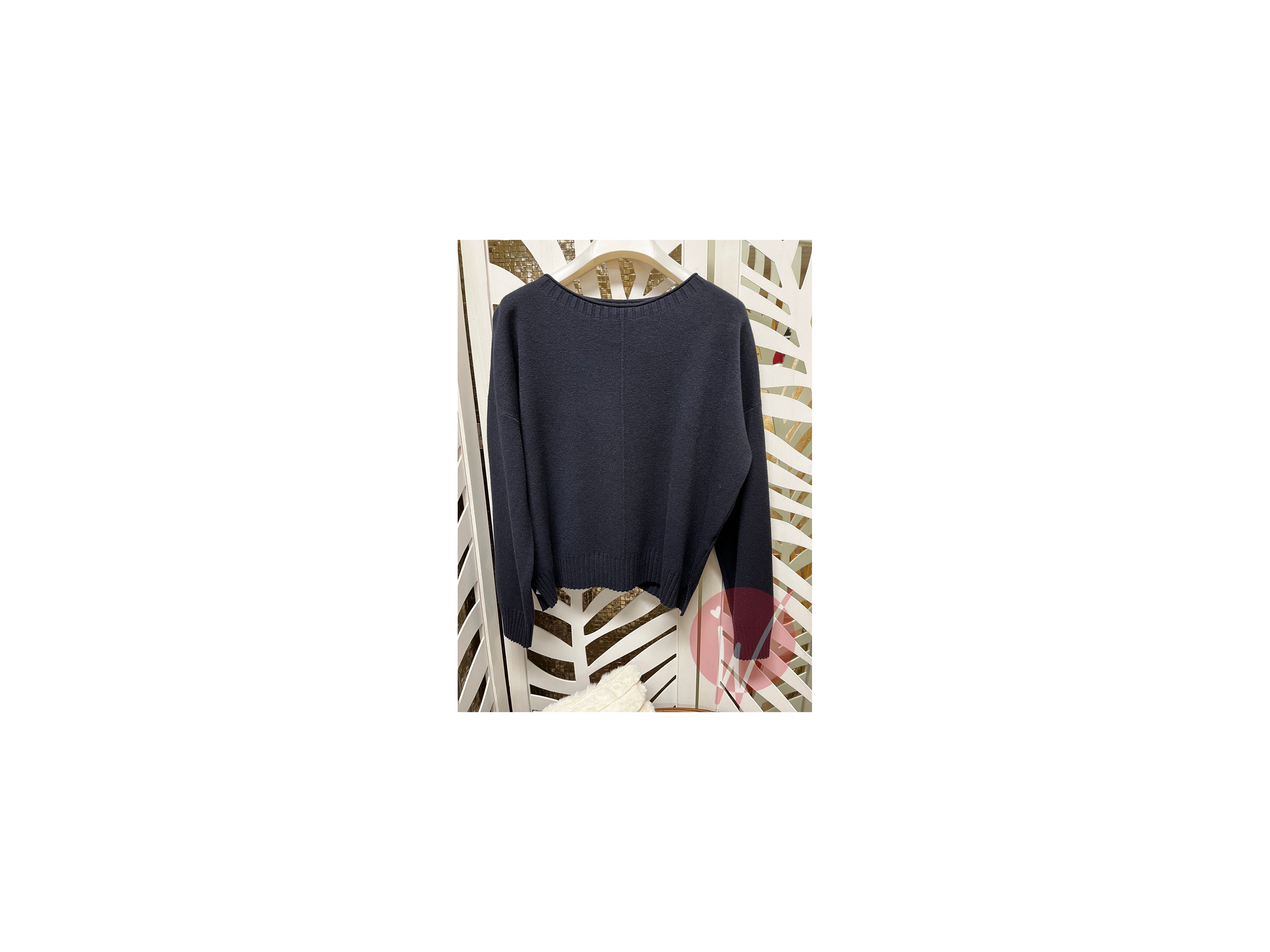 Maglia in viscosa morbida e calda, con collo tondo a costine, taglio dritto con spacchetti ai lati e fascione a costine verticali, profilatura in rilievo centrale davanti.