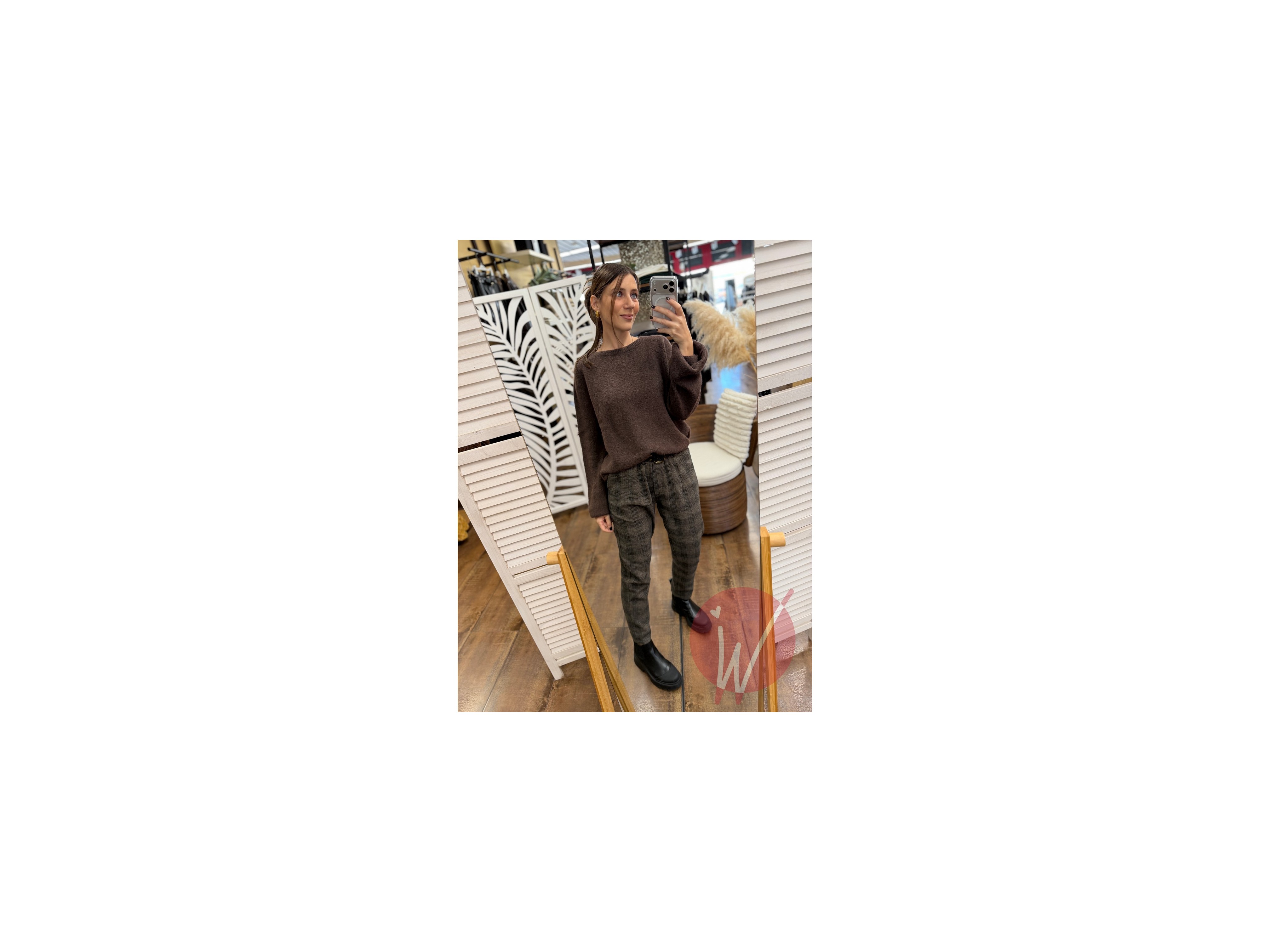 Maglia in tessuto caldo e morbido, scollo a barchetta, maniche a sbuffo, fascione elastico sotto.