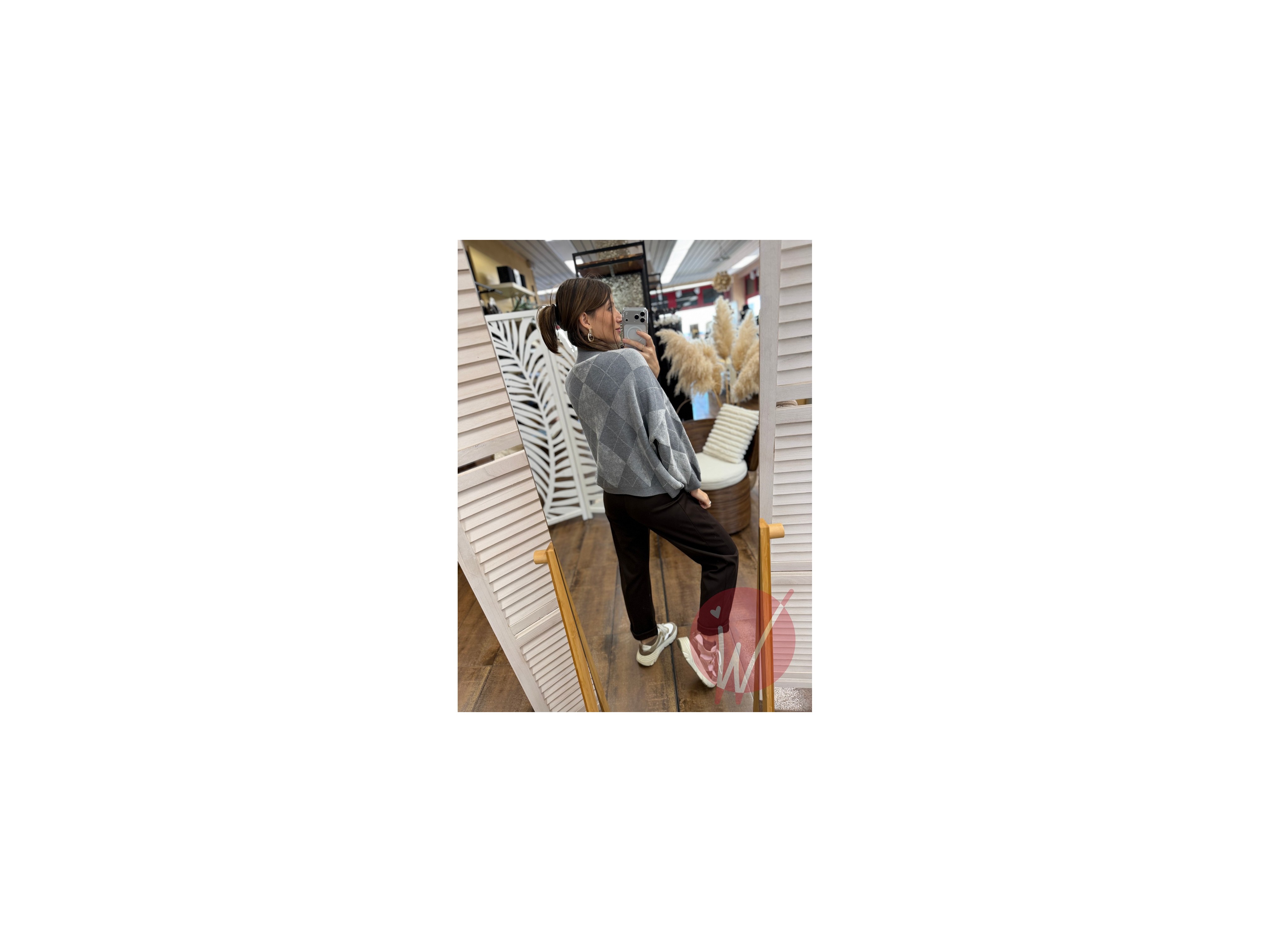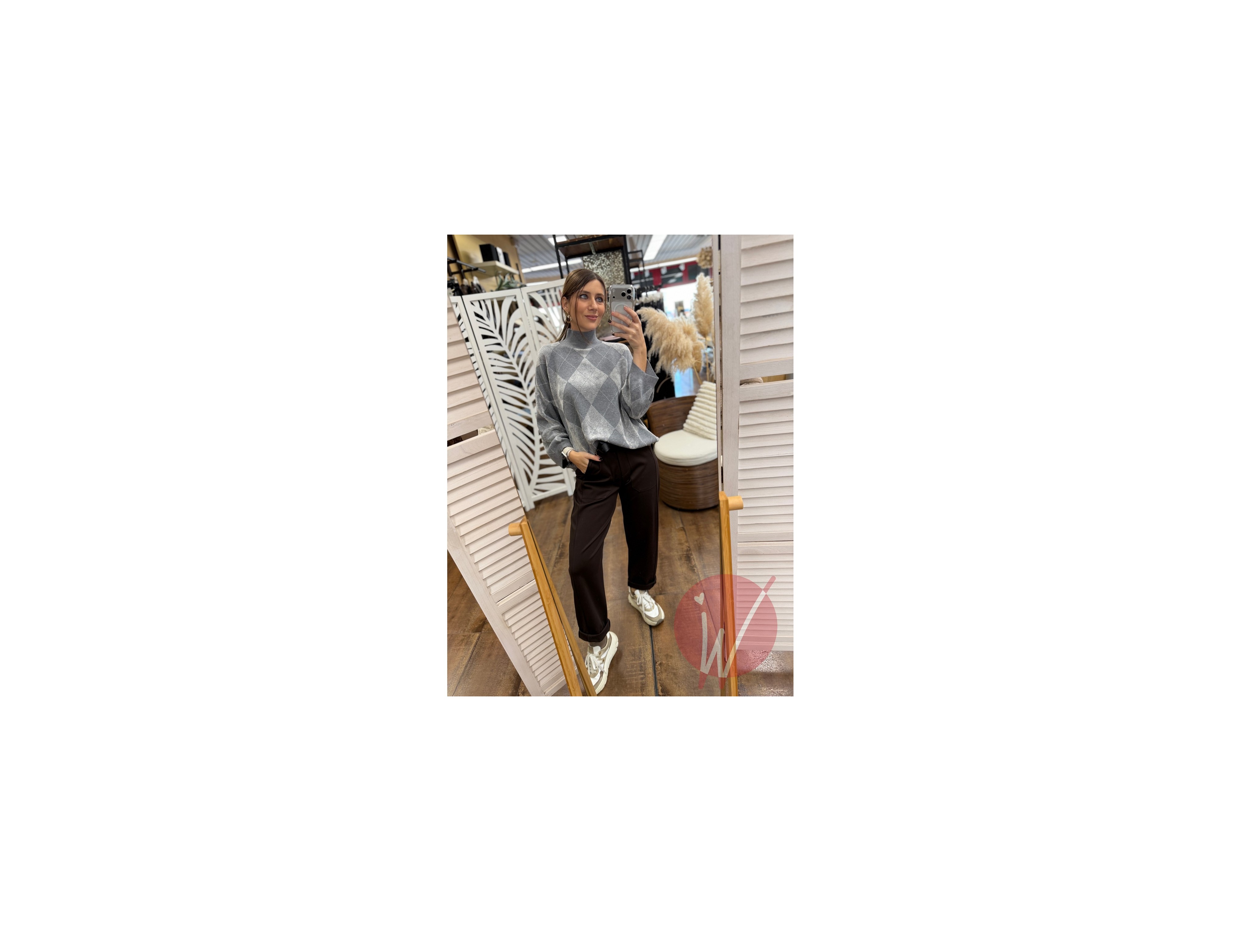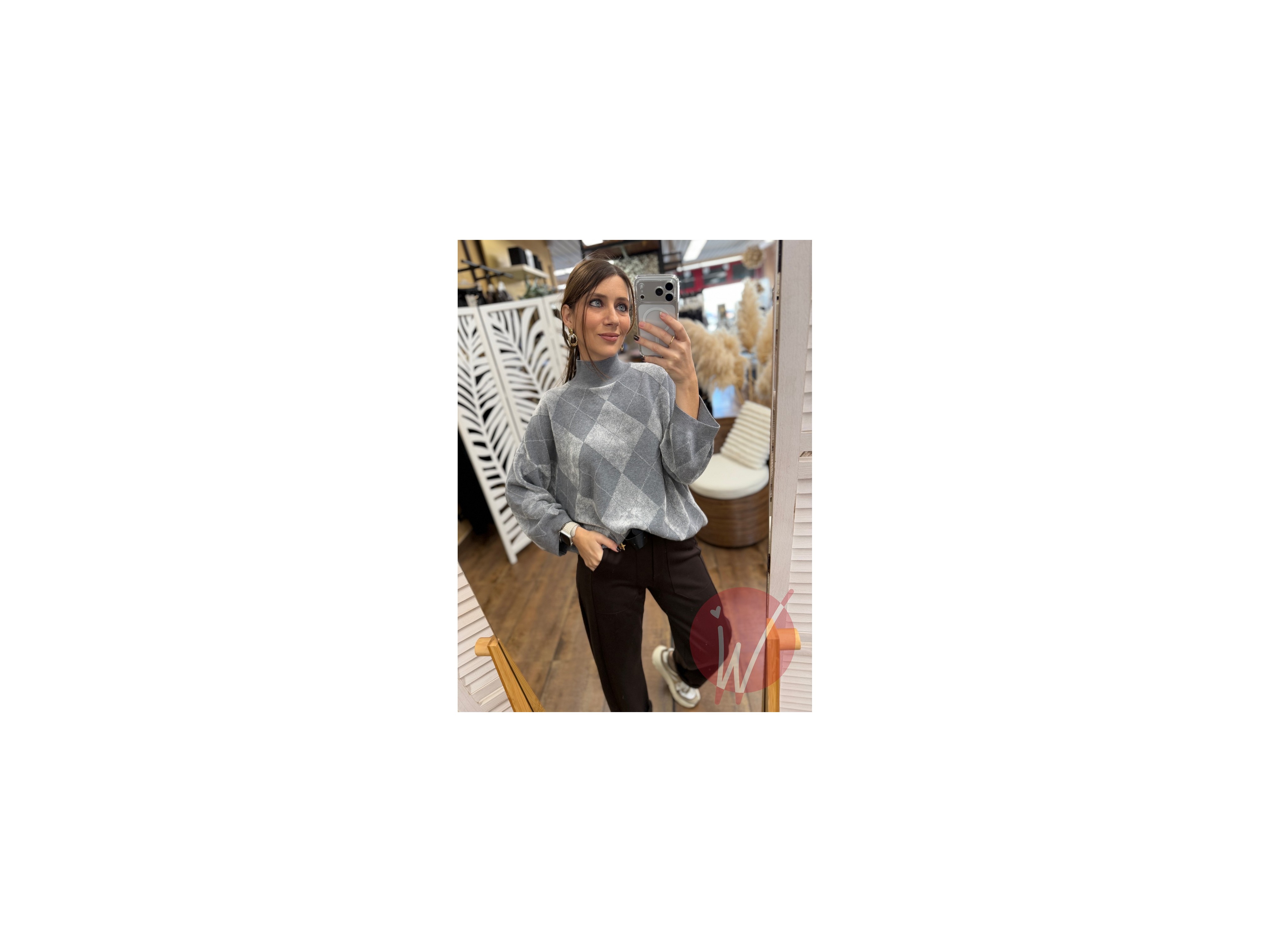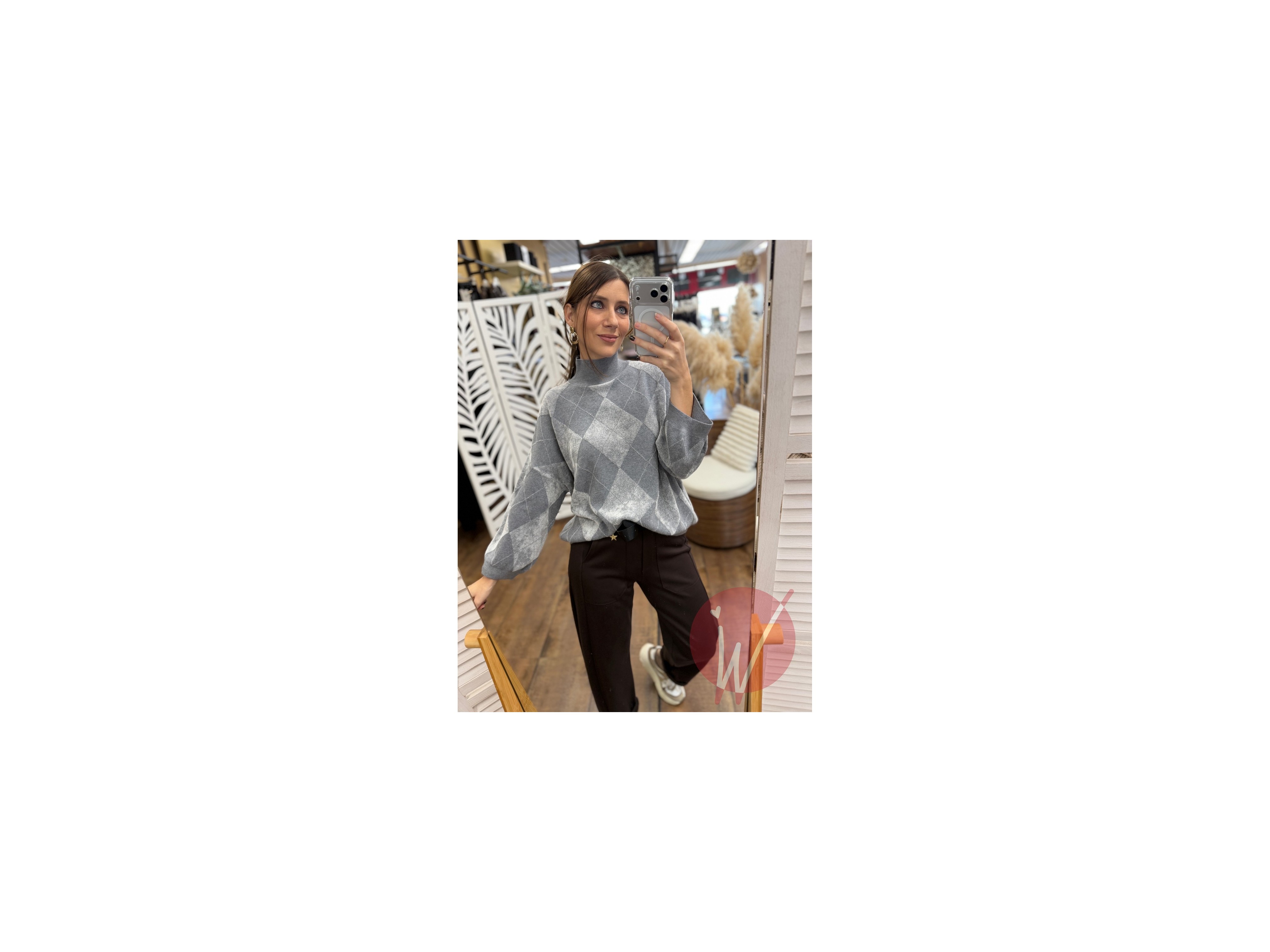 Maglia in viscosa morbida e calda, con collo a lupetto, rombi ad effetto ciniglia, taglio ad ovetto con maniche a palloncino.