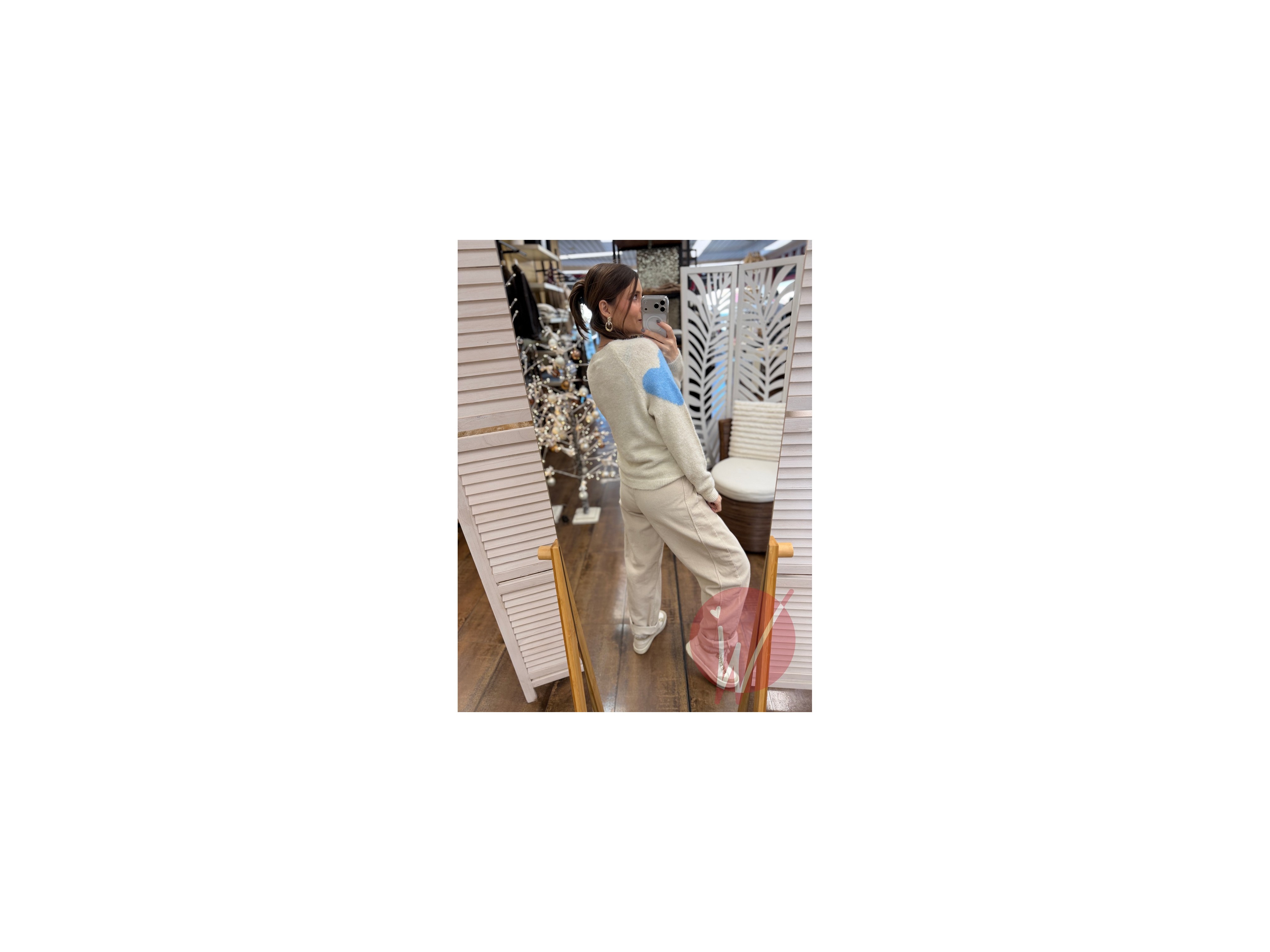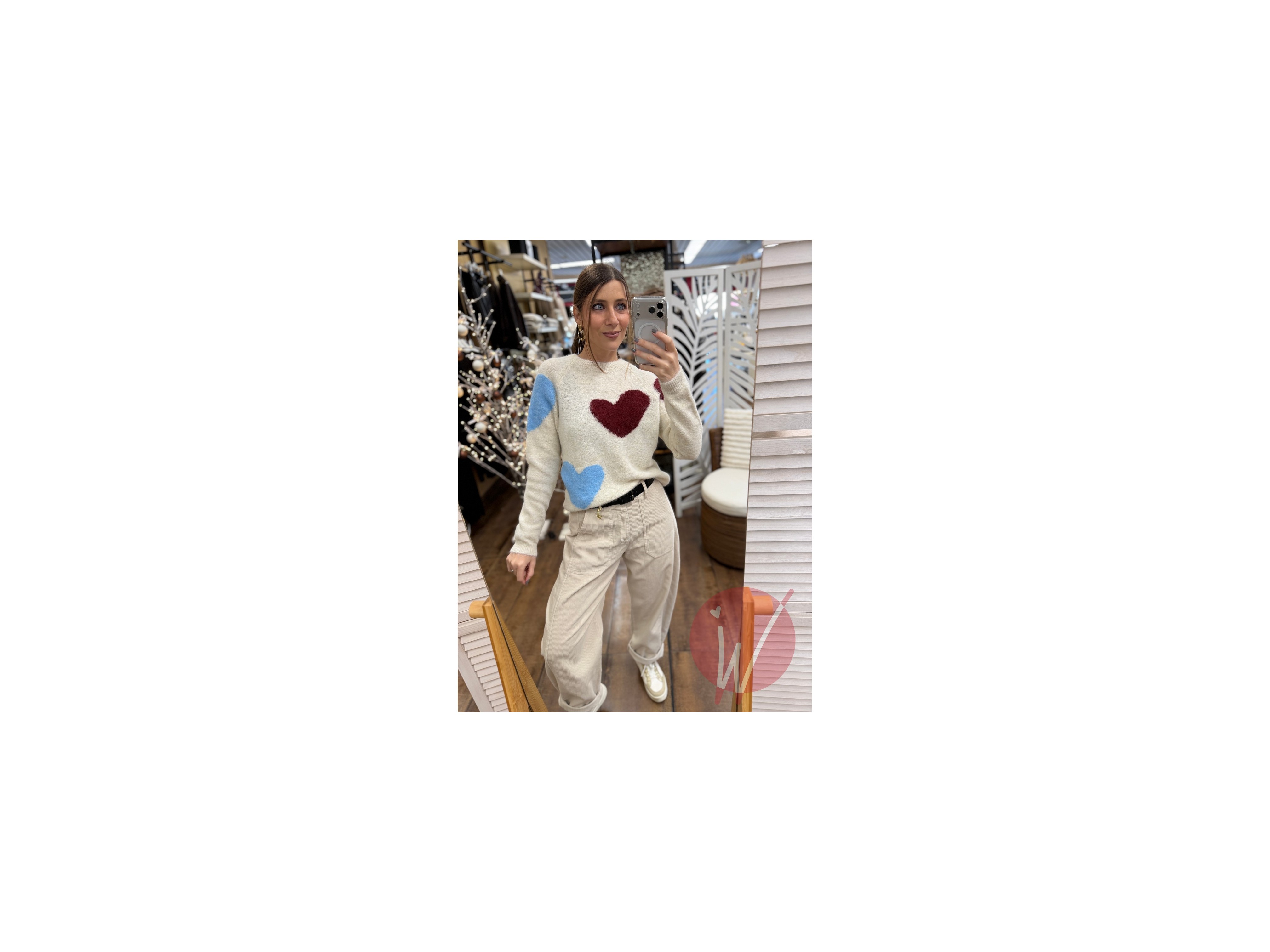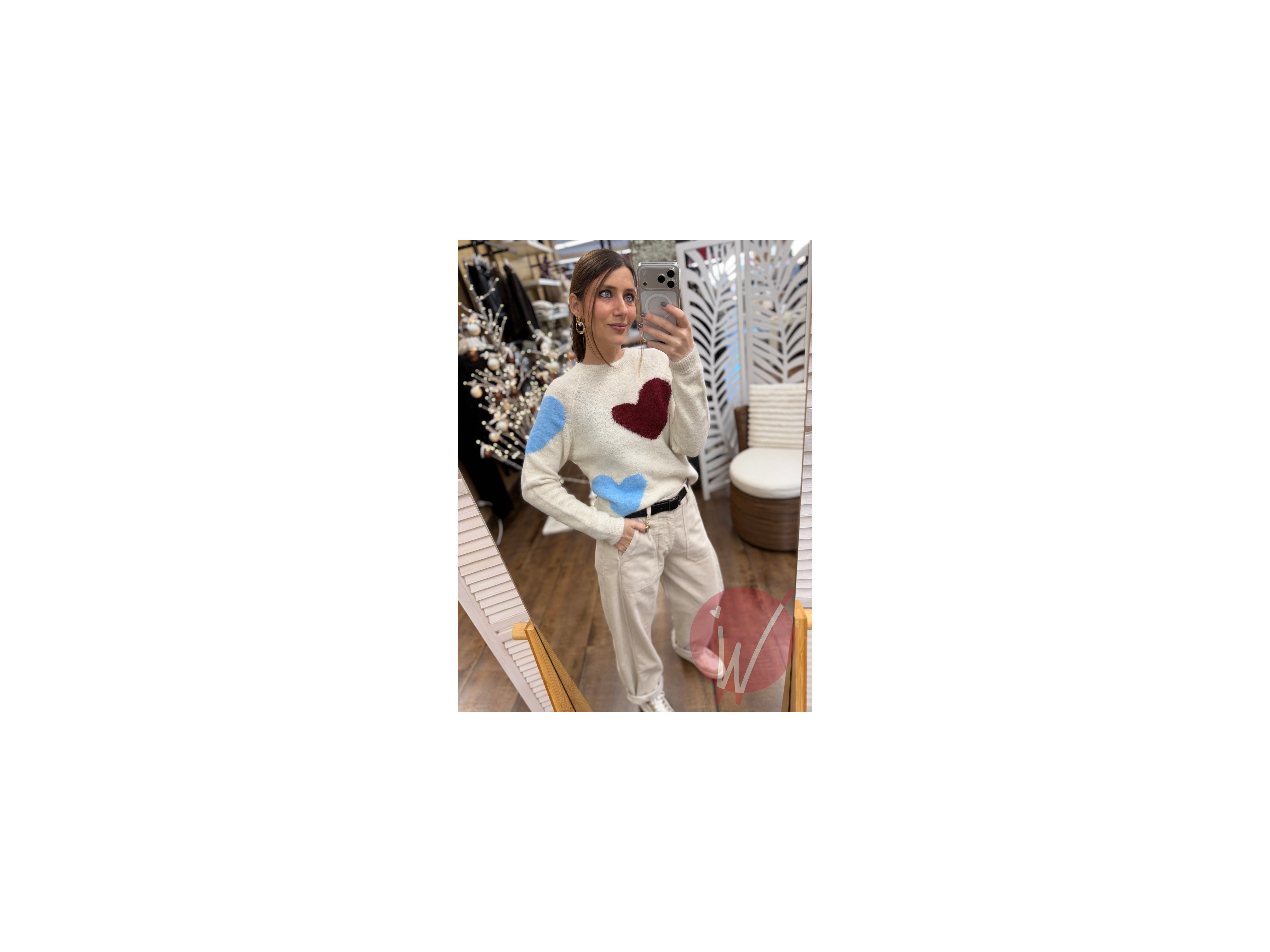 Pull in misto lana, con lavorazione in fantasia a cuori multicolor.