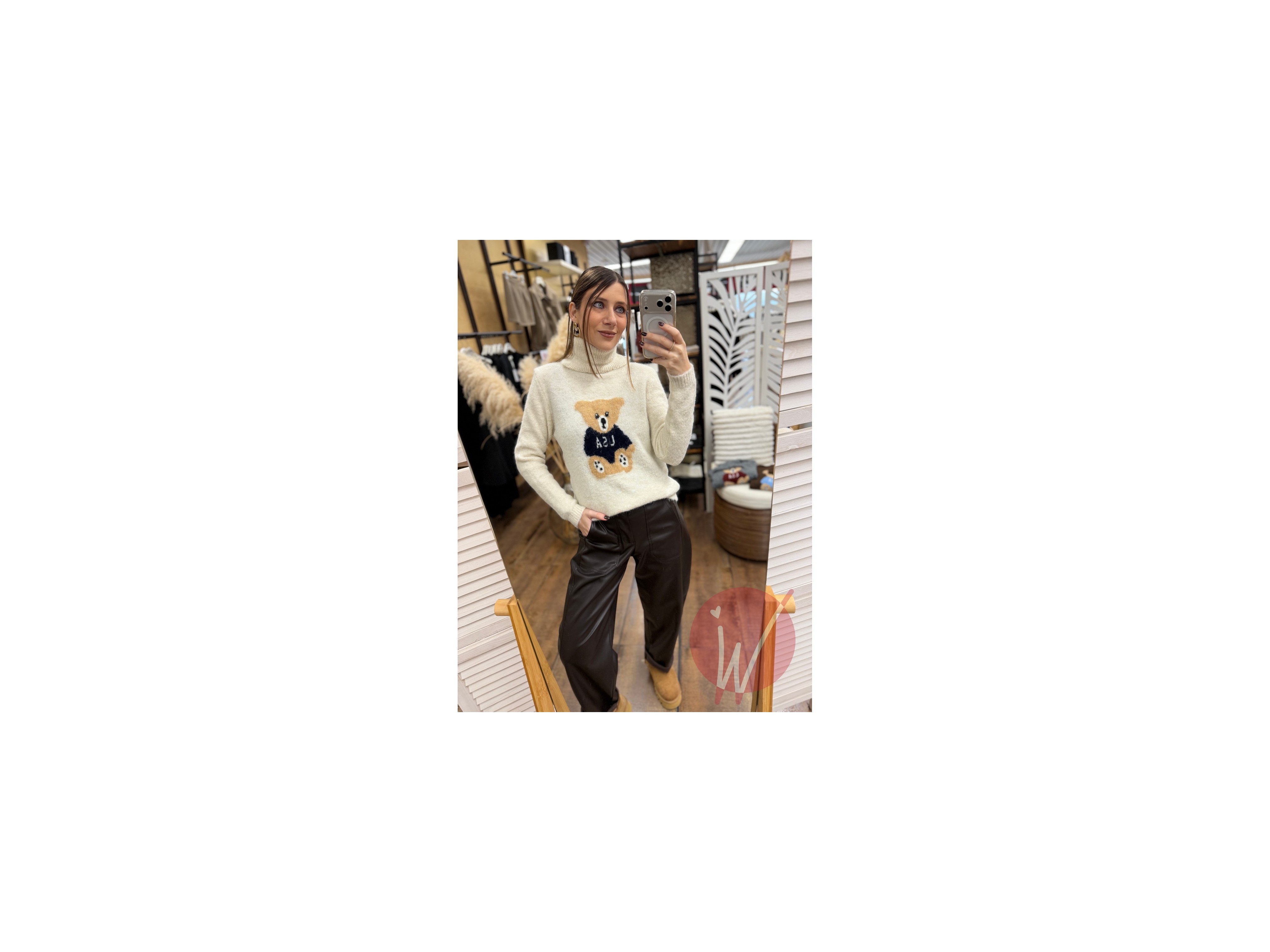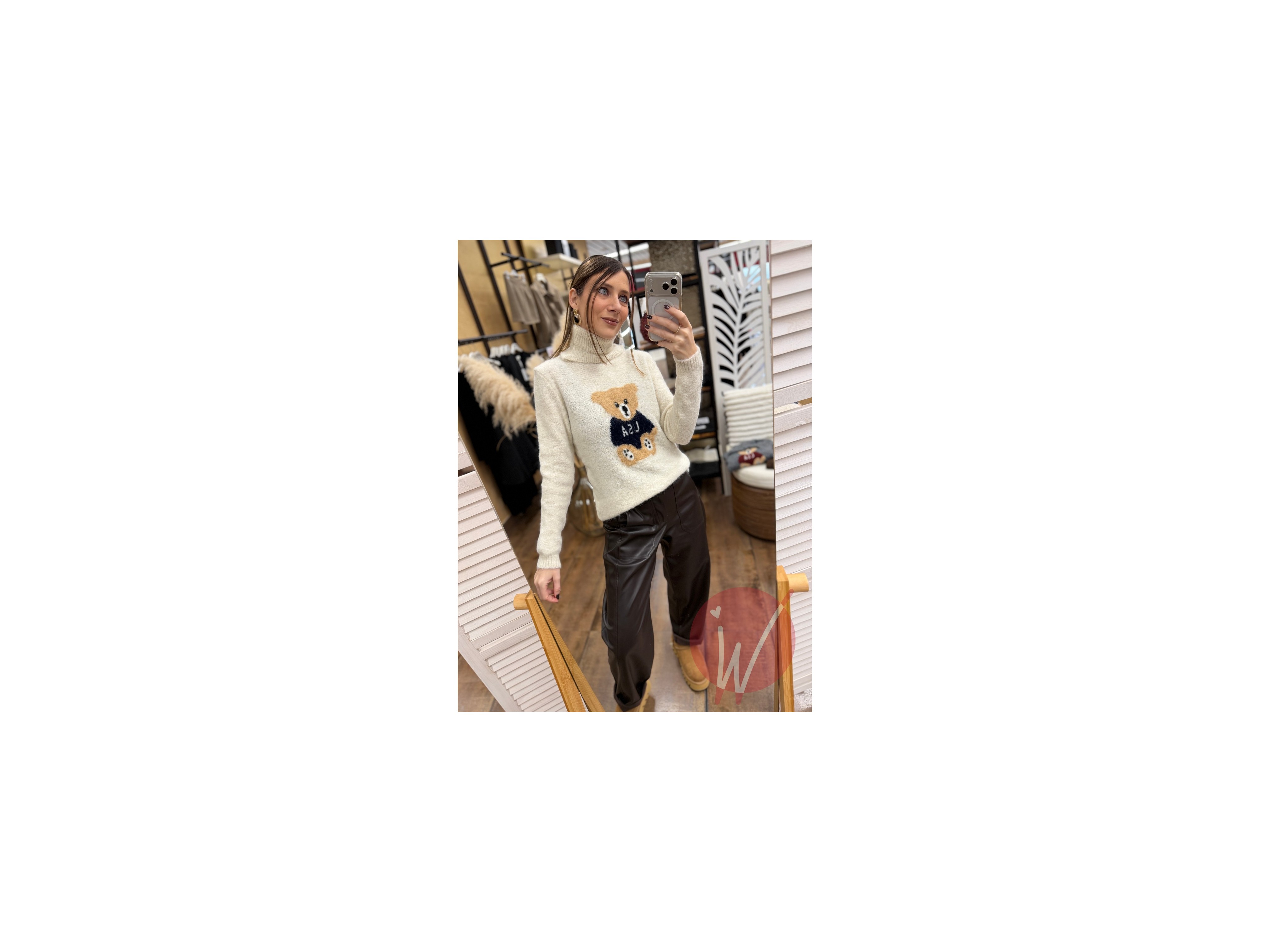 Pull in misto lana, a collo alto, con ricamo teddy davanti, caldo ed elasticizzato.