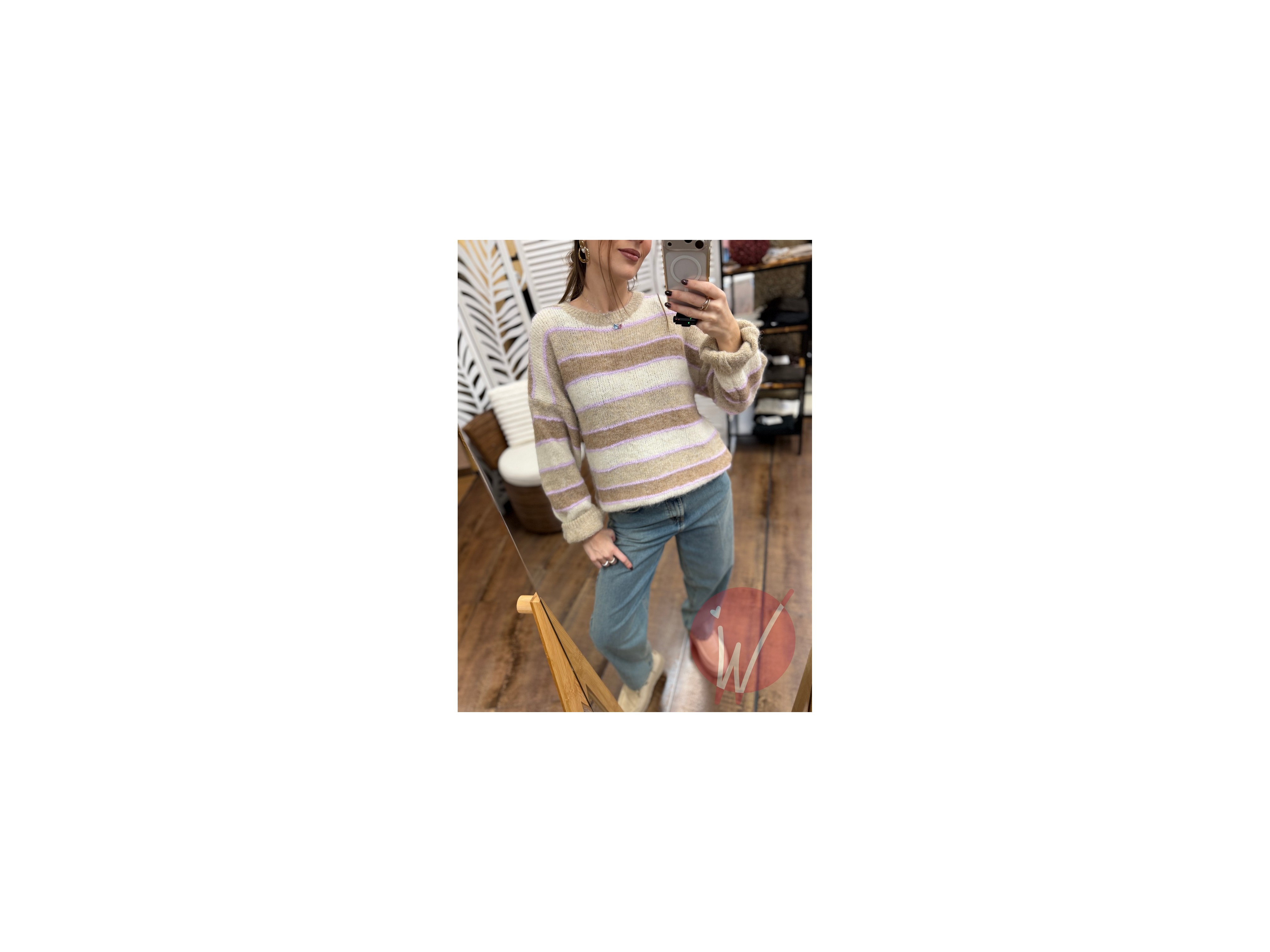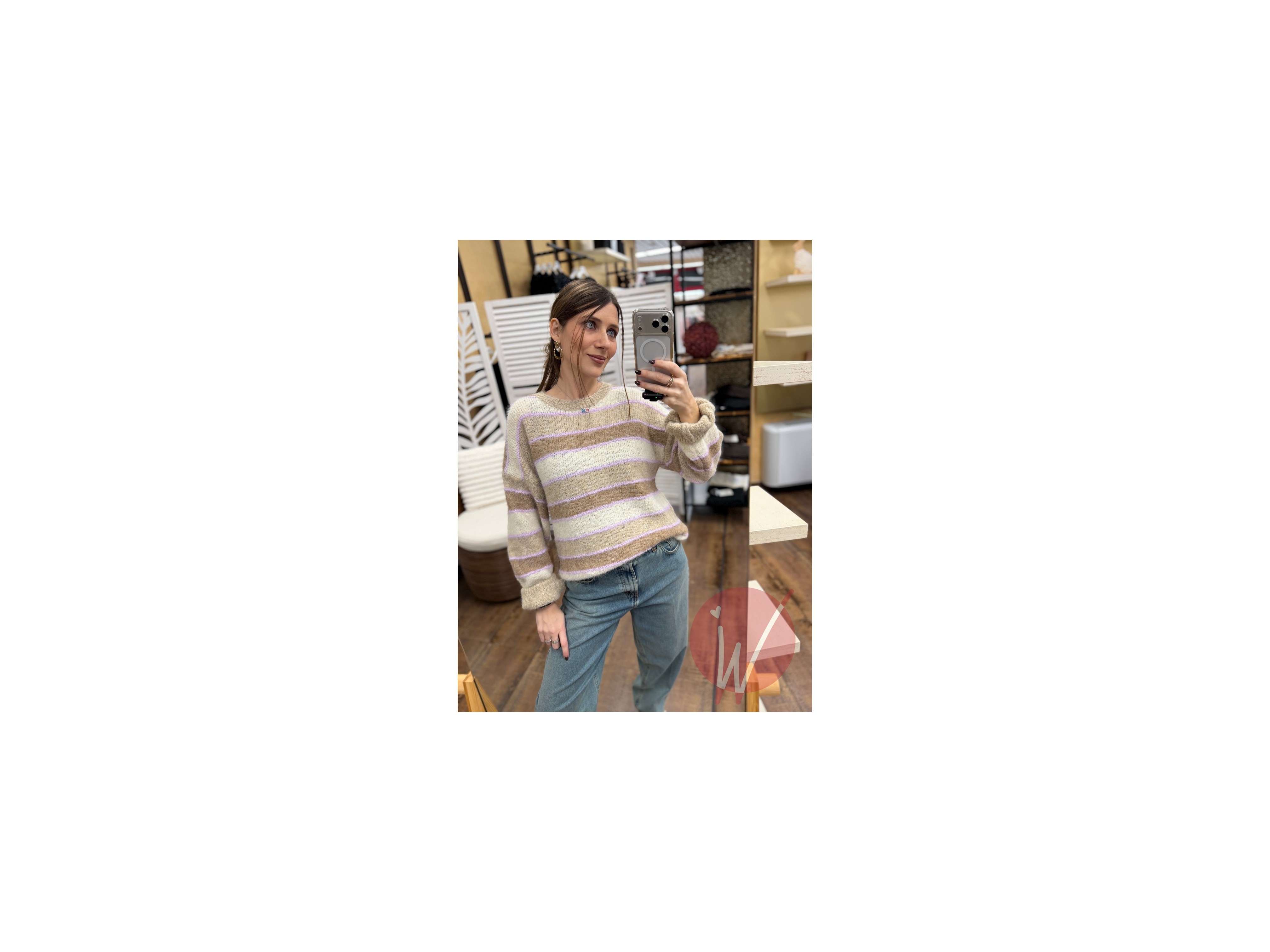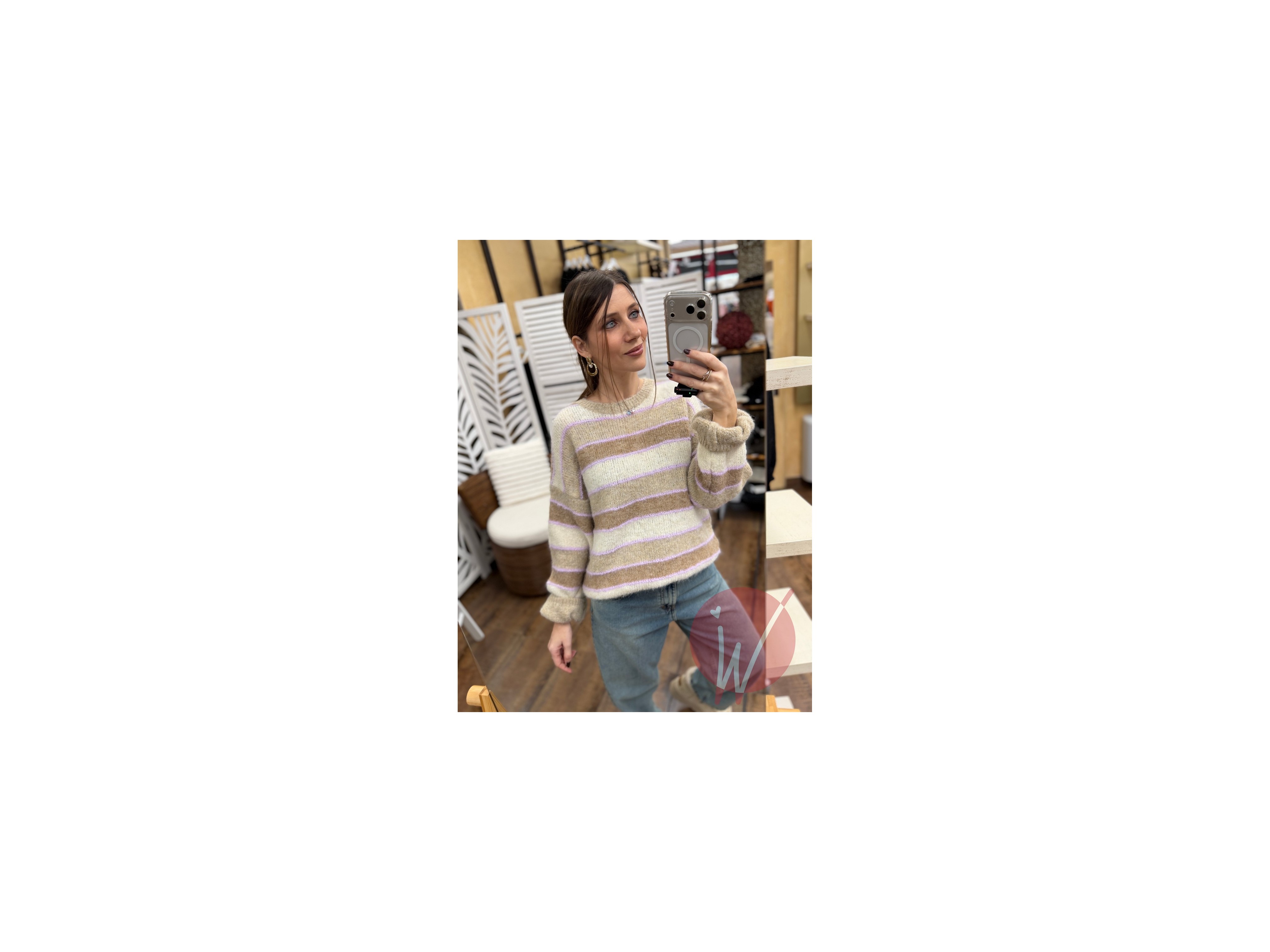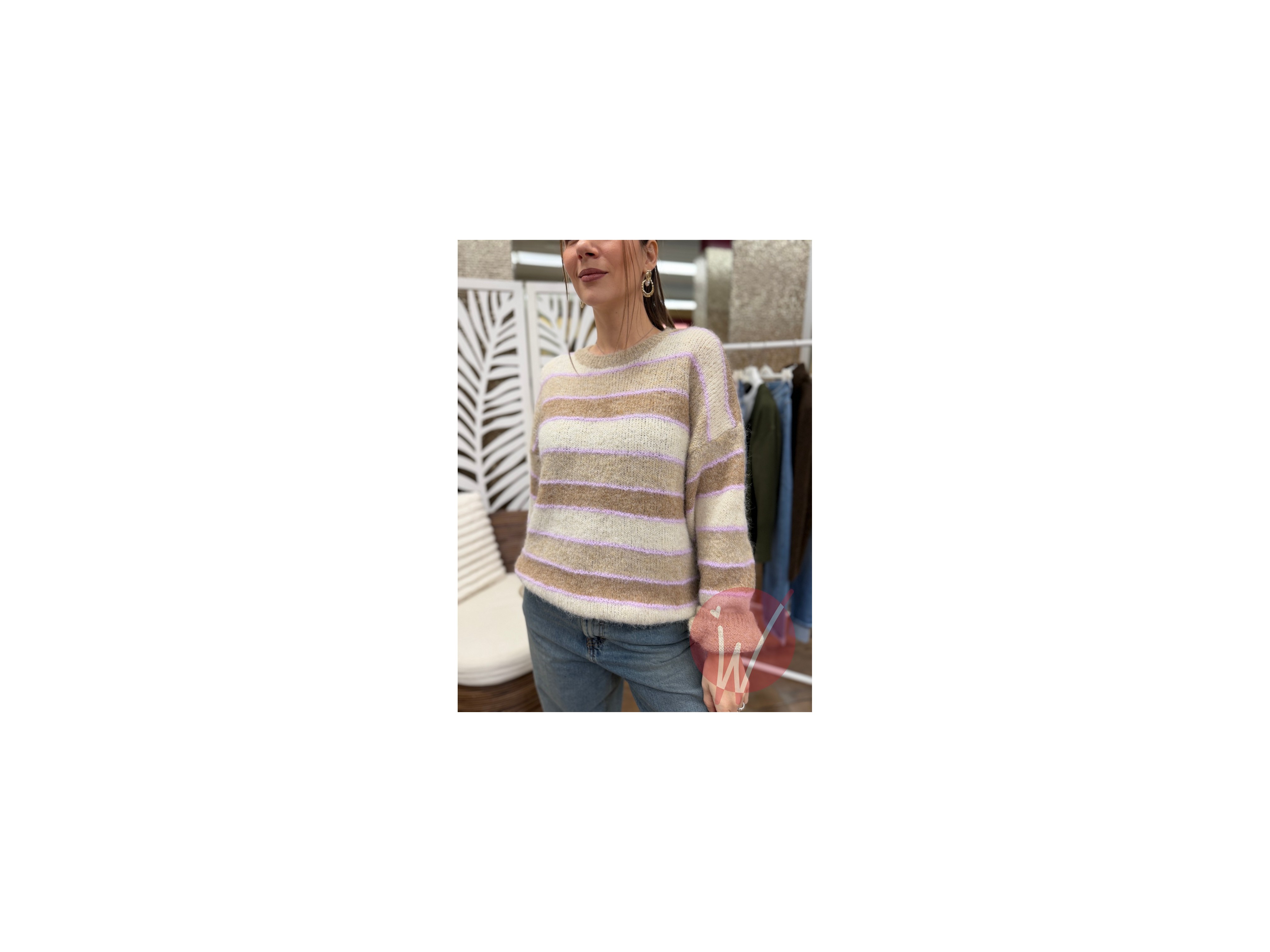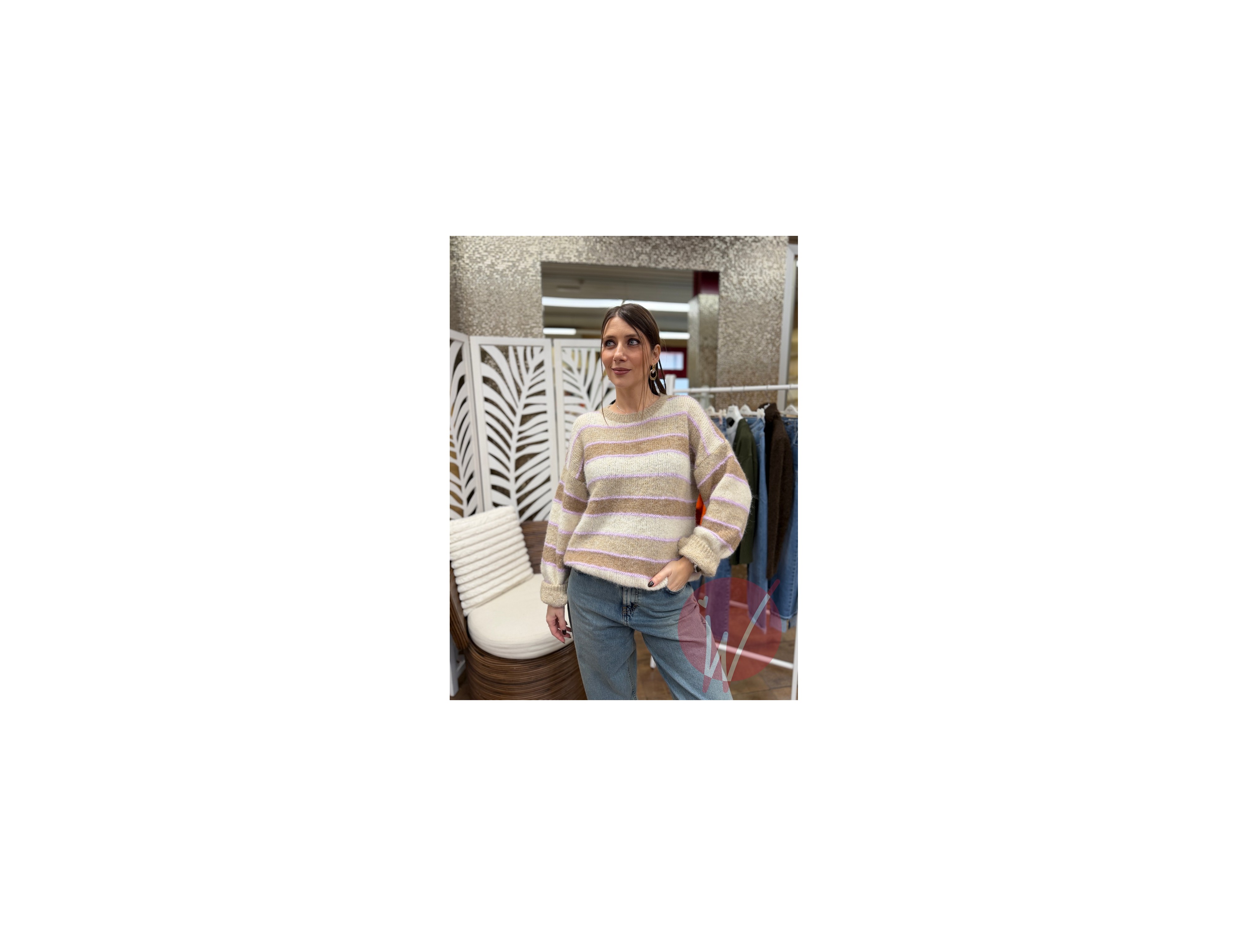 Pull soffice e caldo, a righe multicolore, girocollo, vestibilità morbida, manica a palloncino.