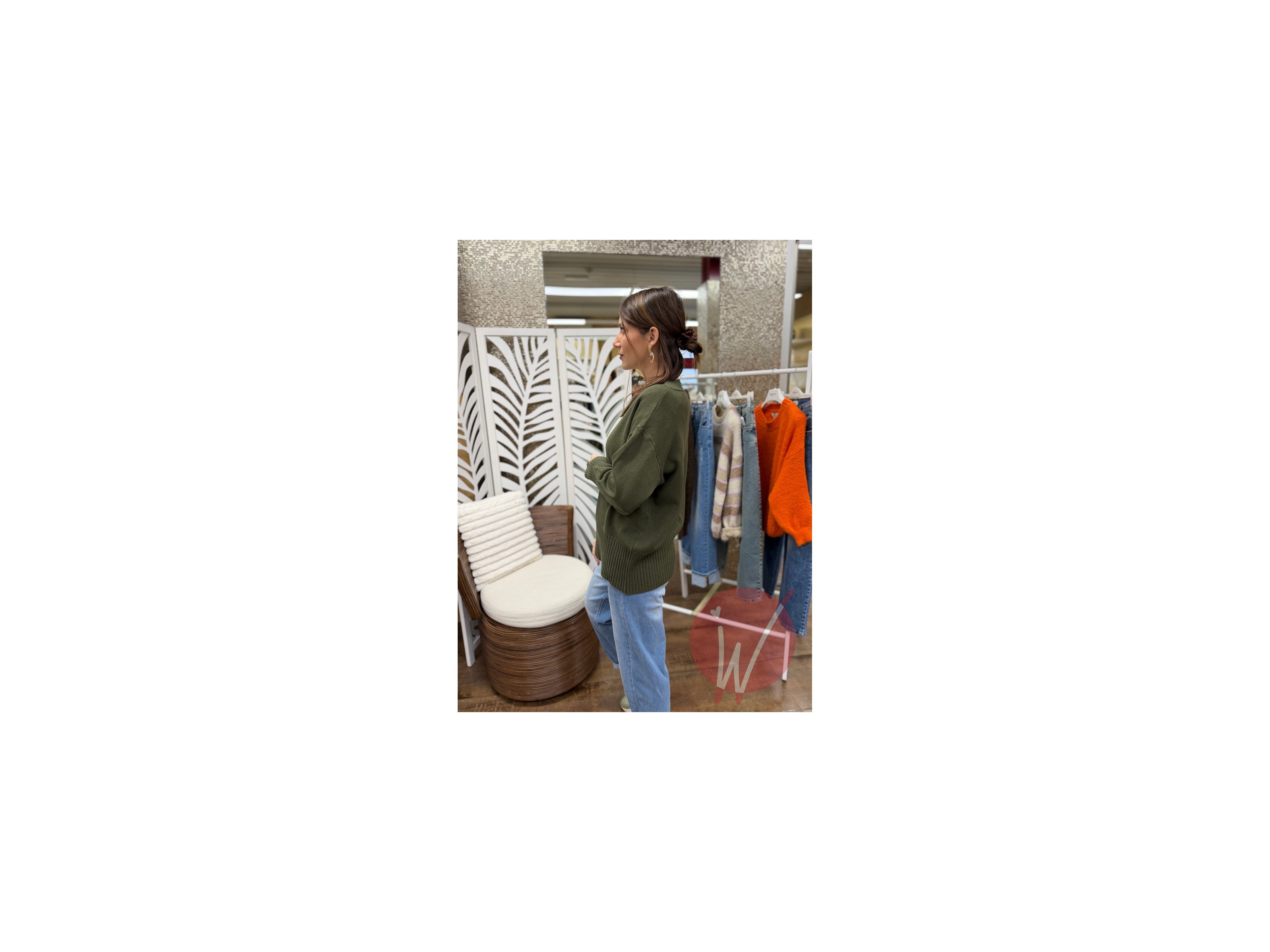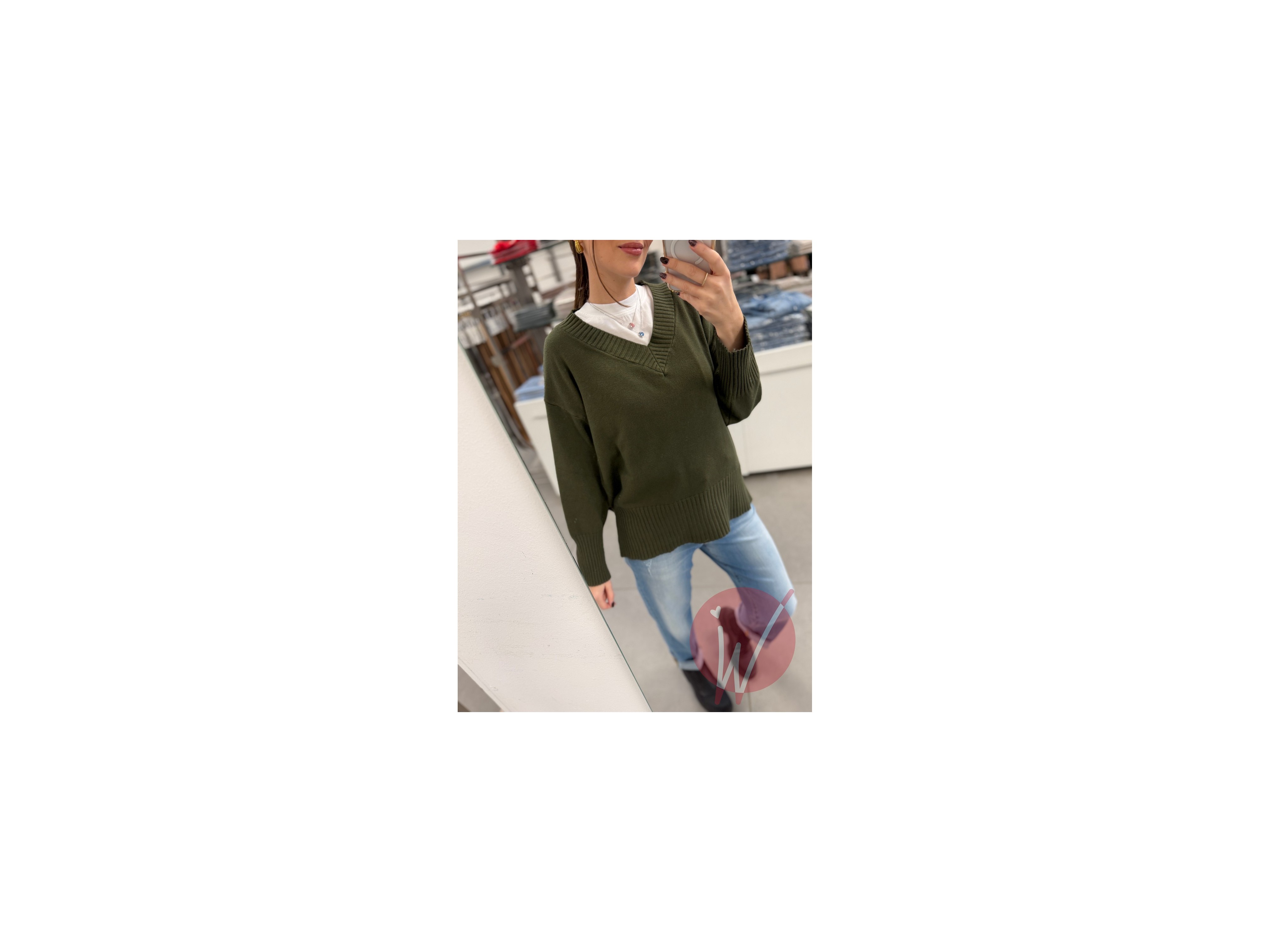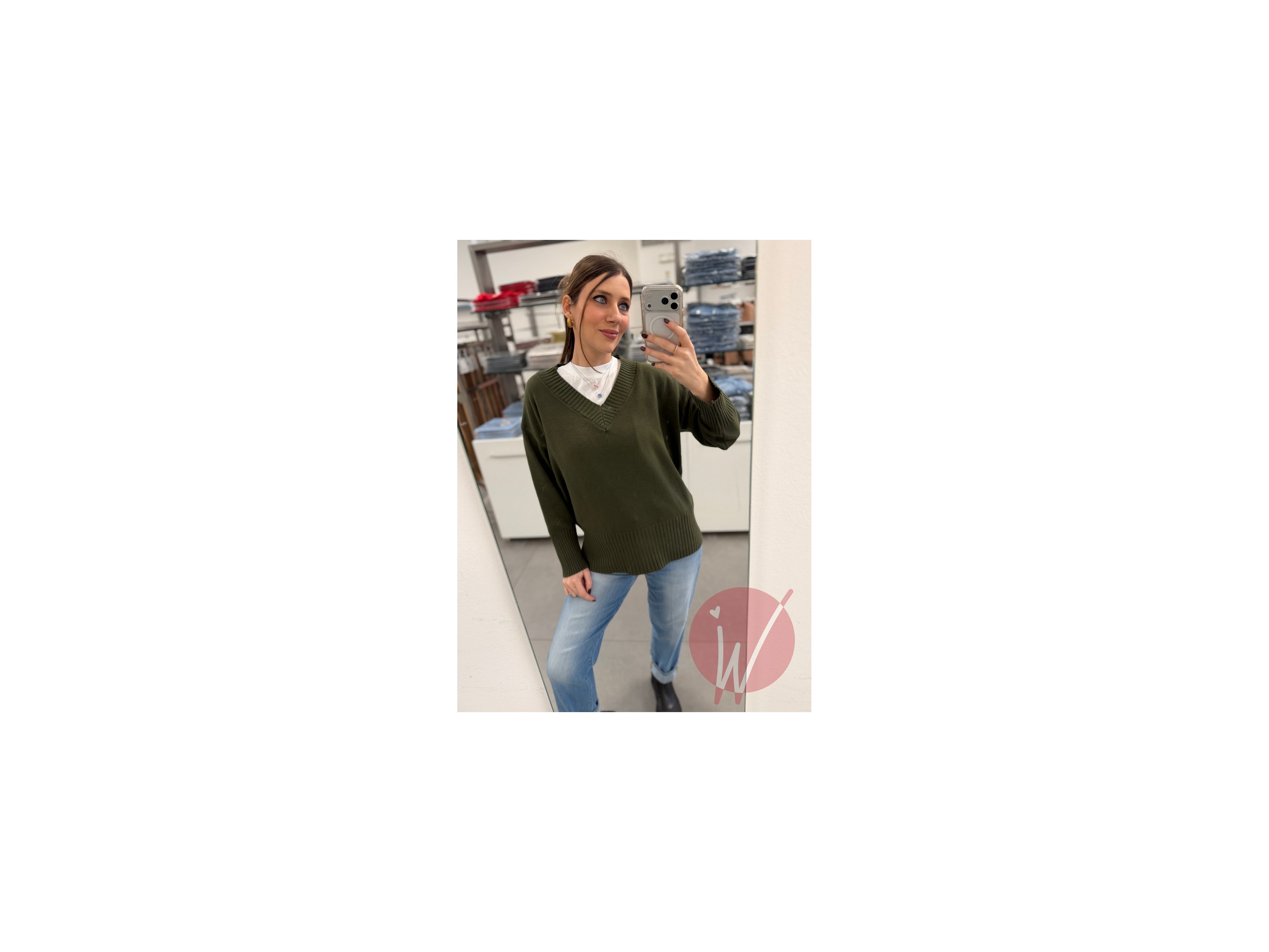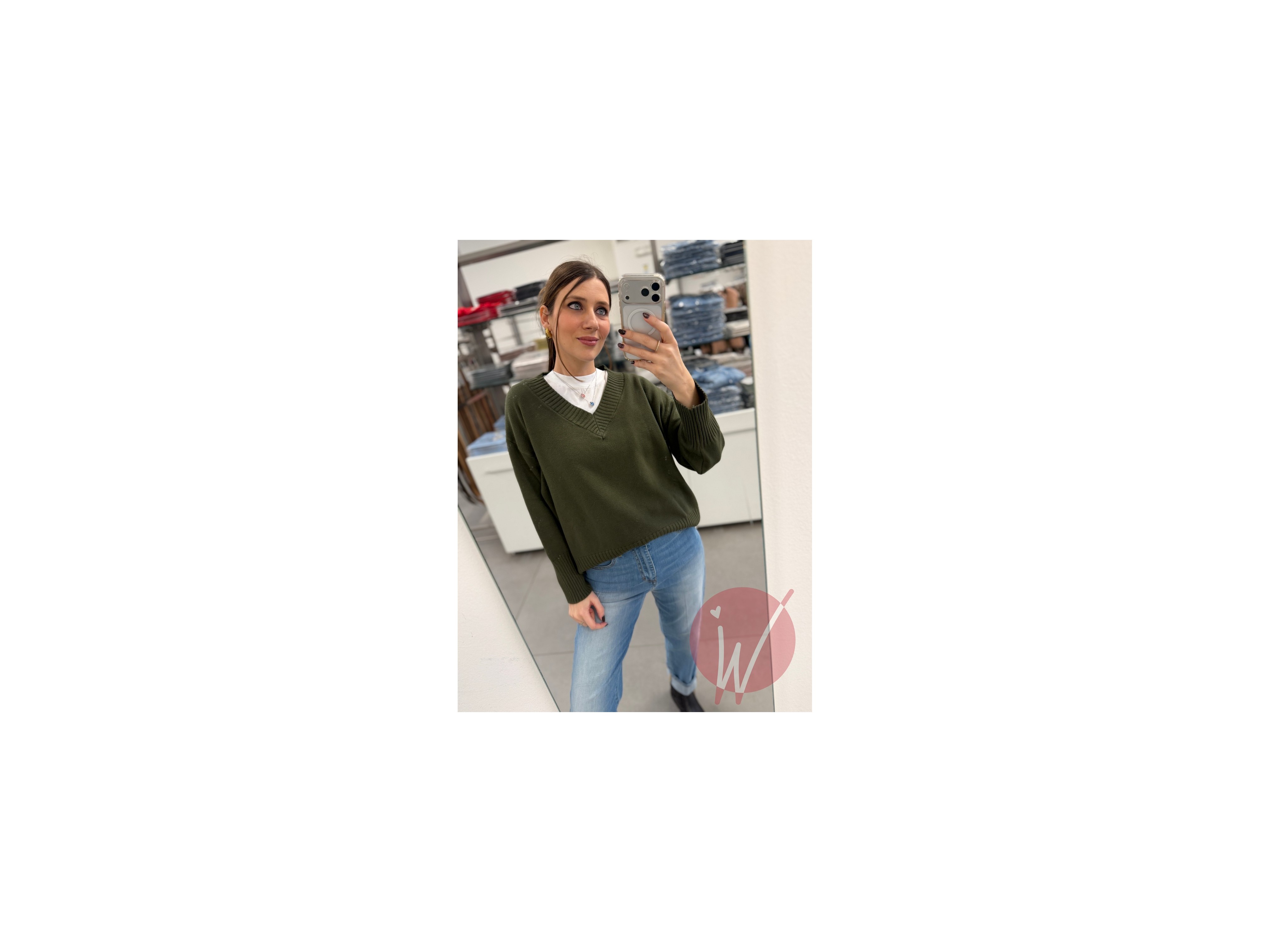 Maglia in viscosa morbida e calda, con scollo a V, taglio dritto, fascia alta a coste sul fondo e sui polsini.