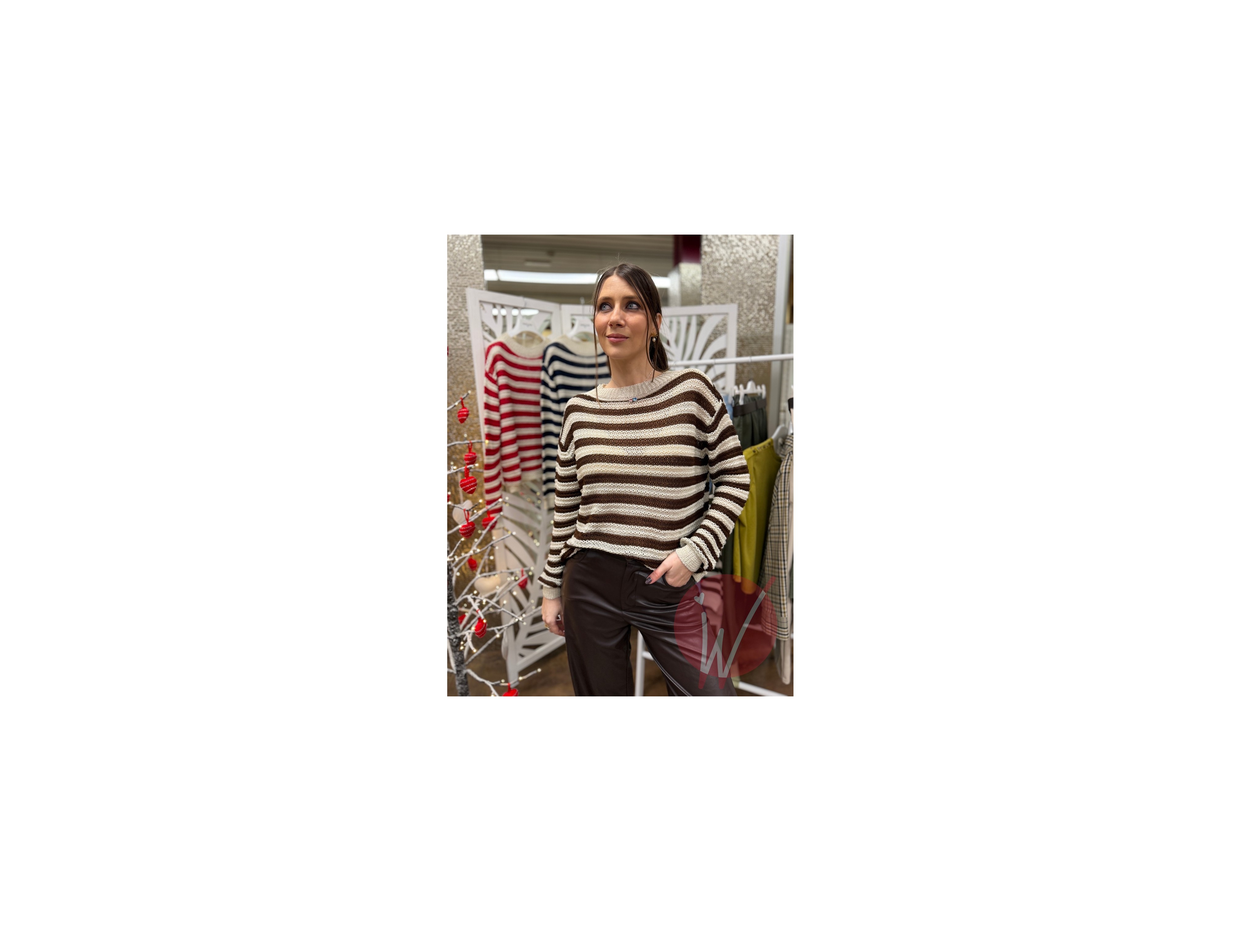 Maglia a righe girocollo con lavorazione all'uncinetto, morbida ed elasticizzata.