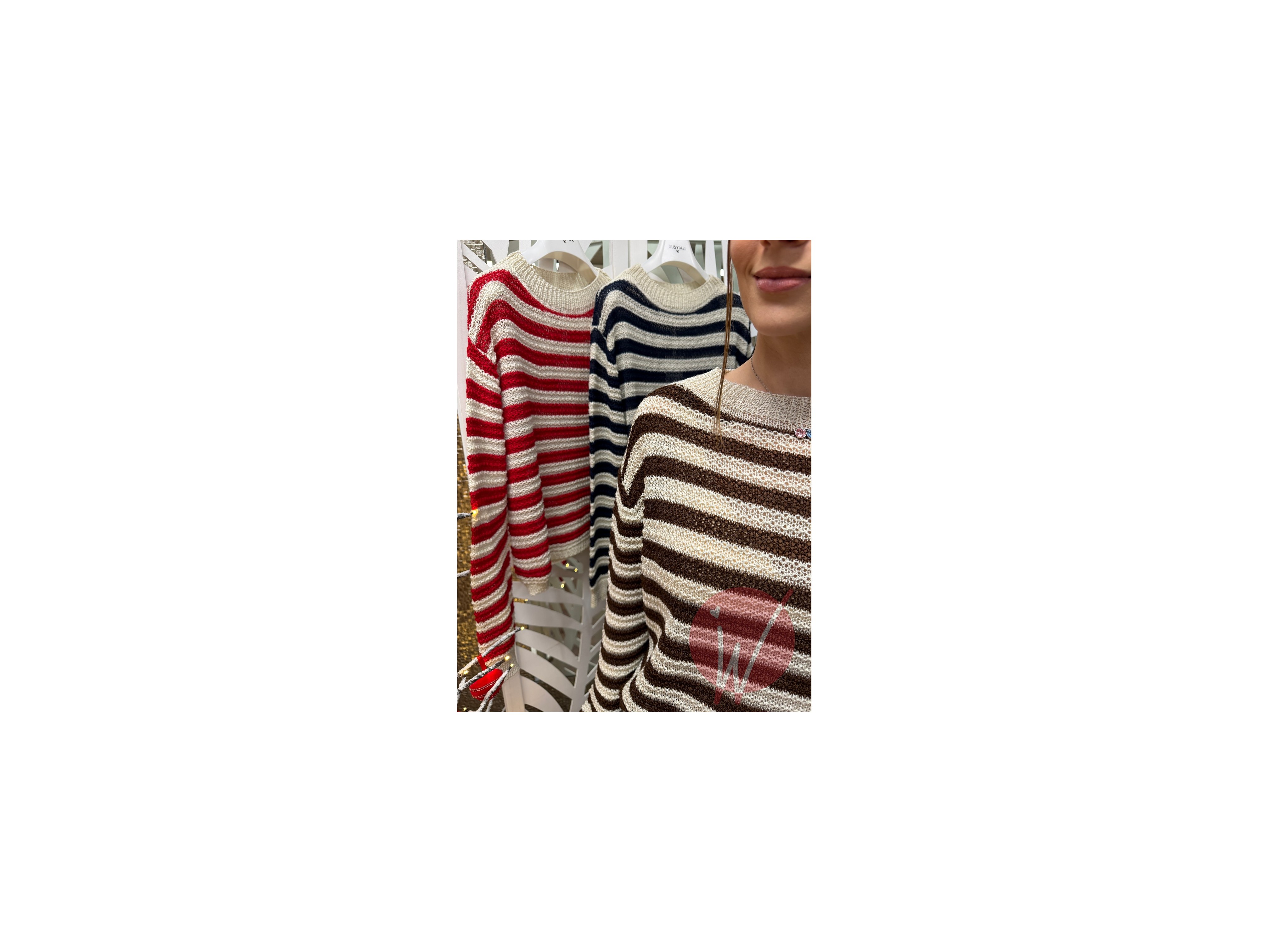Maglia a righe girocollo con lavorazione all'uncinetto, morbida ed elasticizzata.