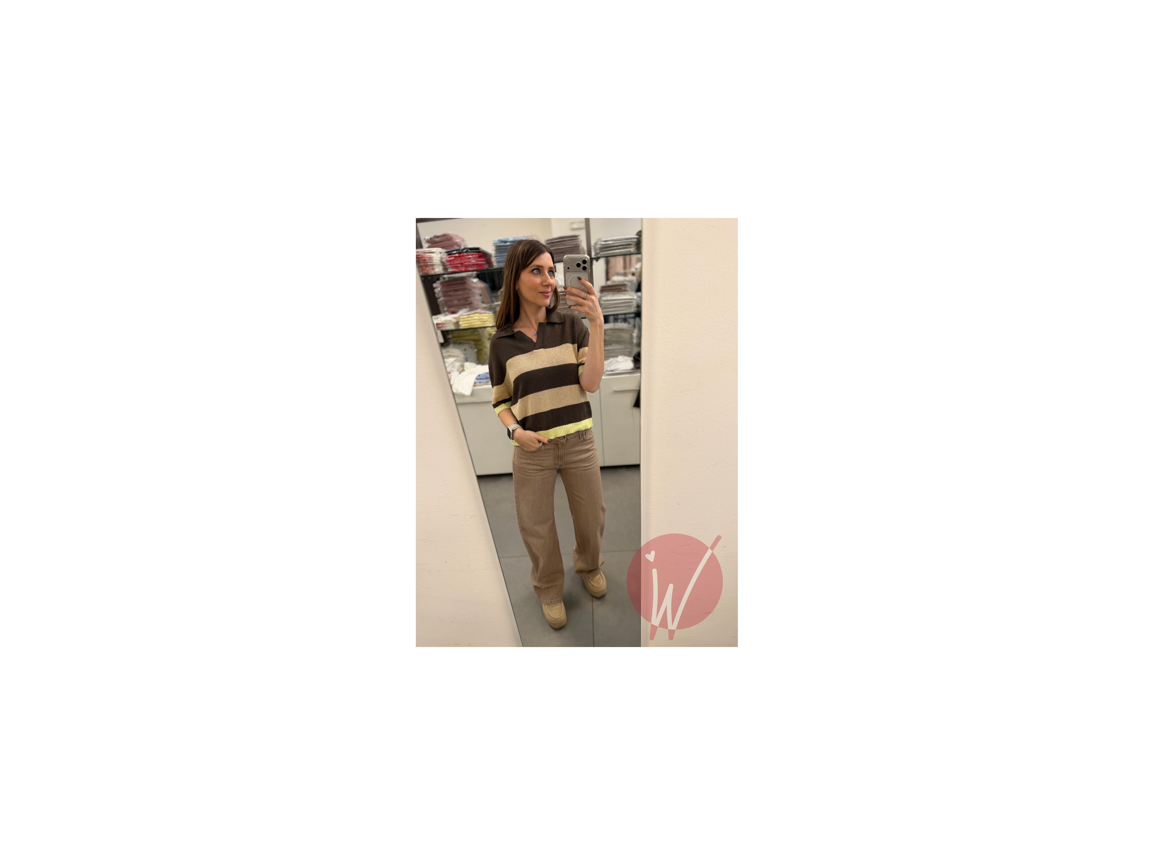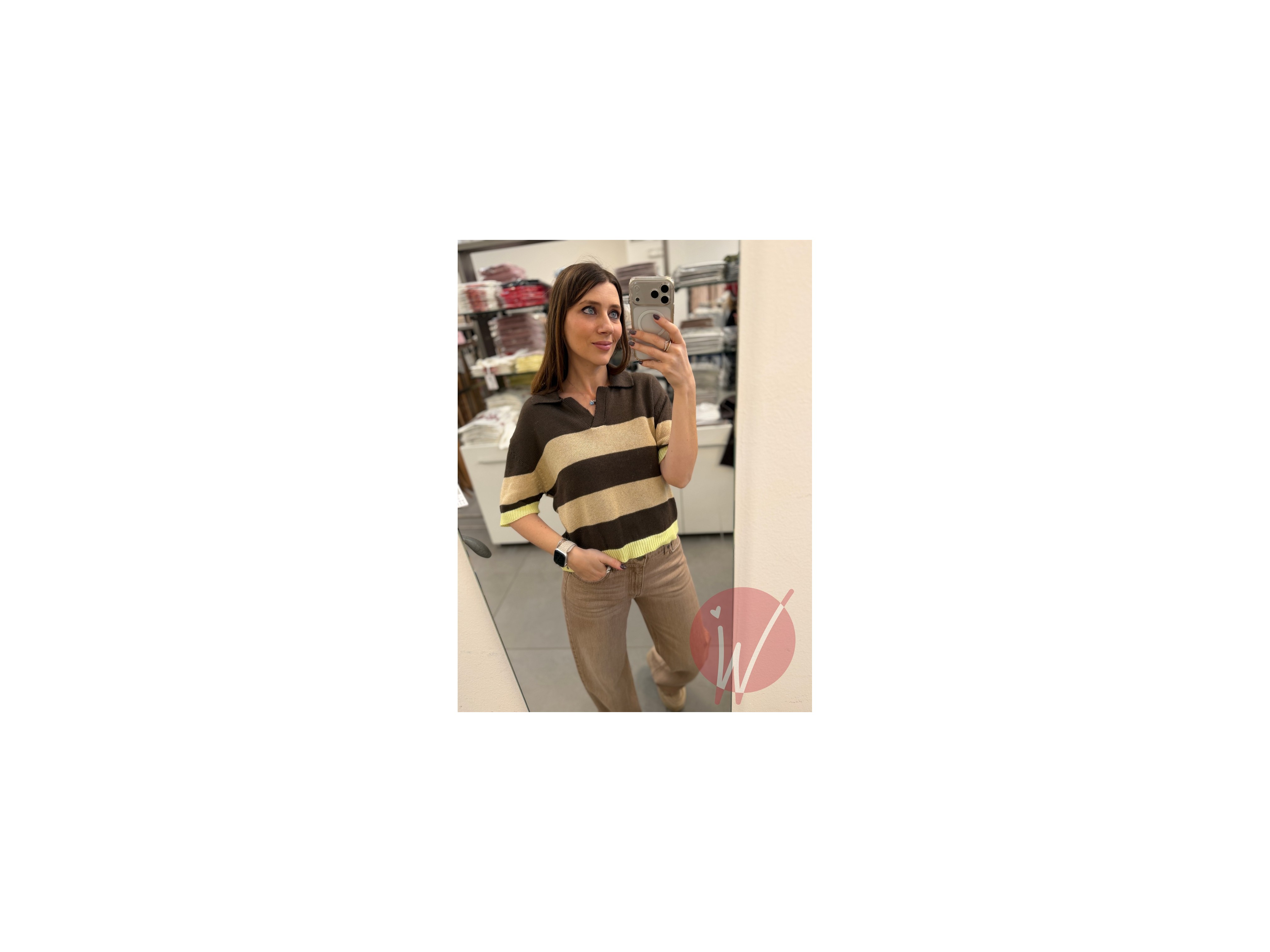 Maglia a maniche corte, modello a polo, taglio a scatolina con bordi a contrasto, fantasia a righe.