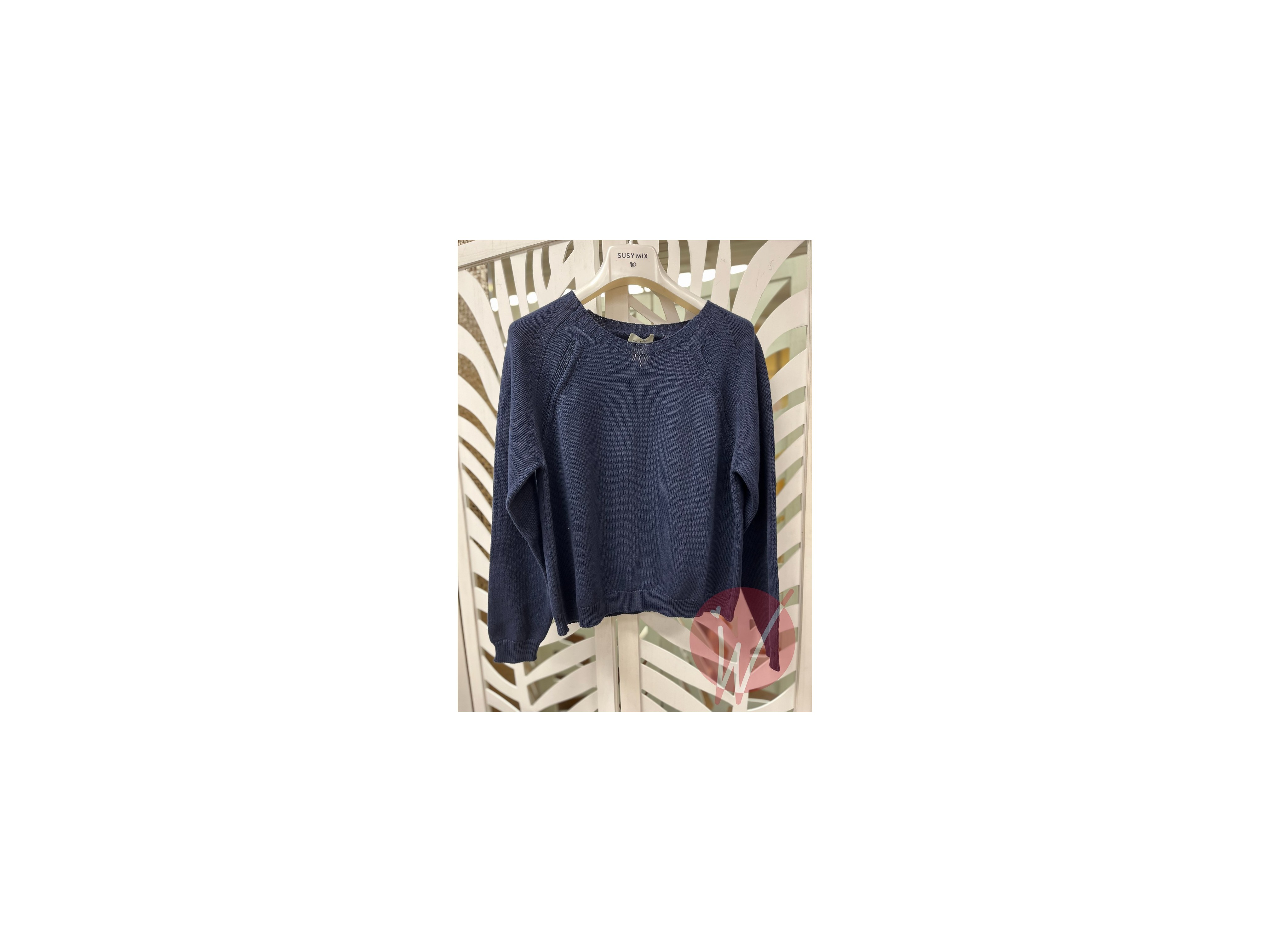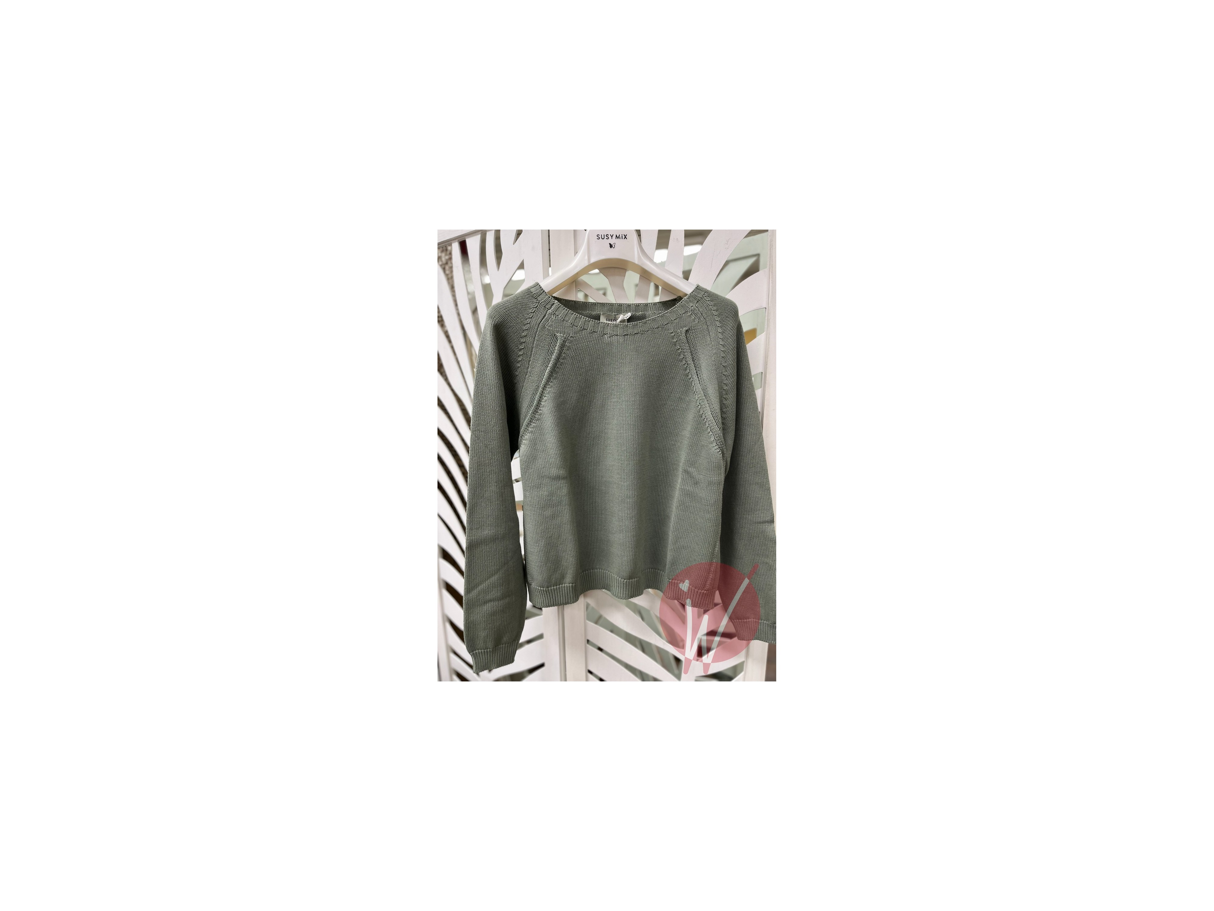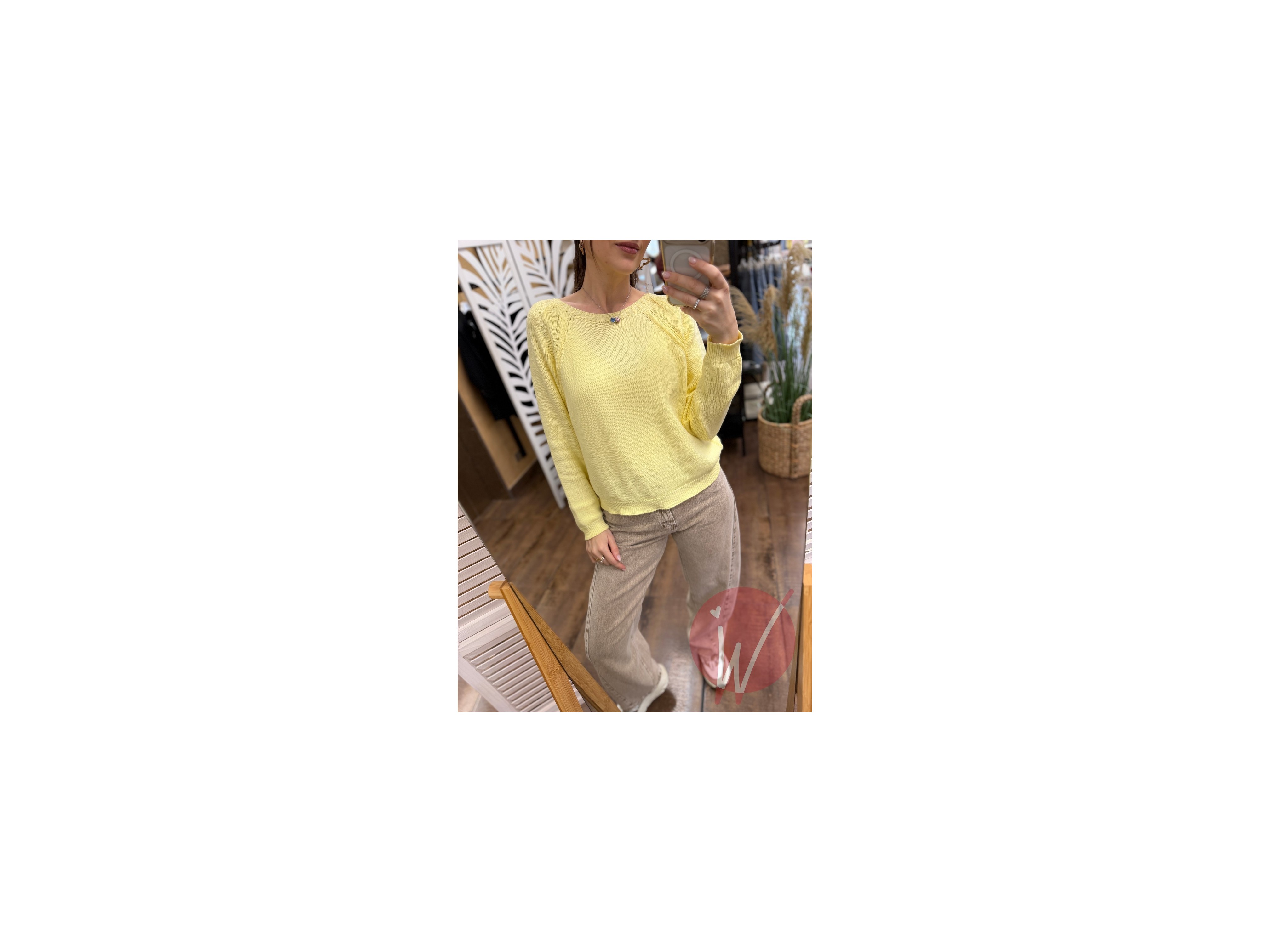 Maglia in cotone di qualità con manica raglan e profili in rilievo, con scollo ampio rifinito a costine.