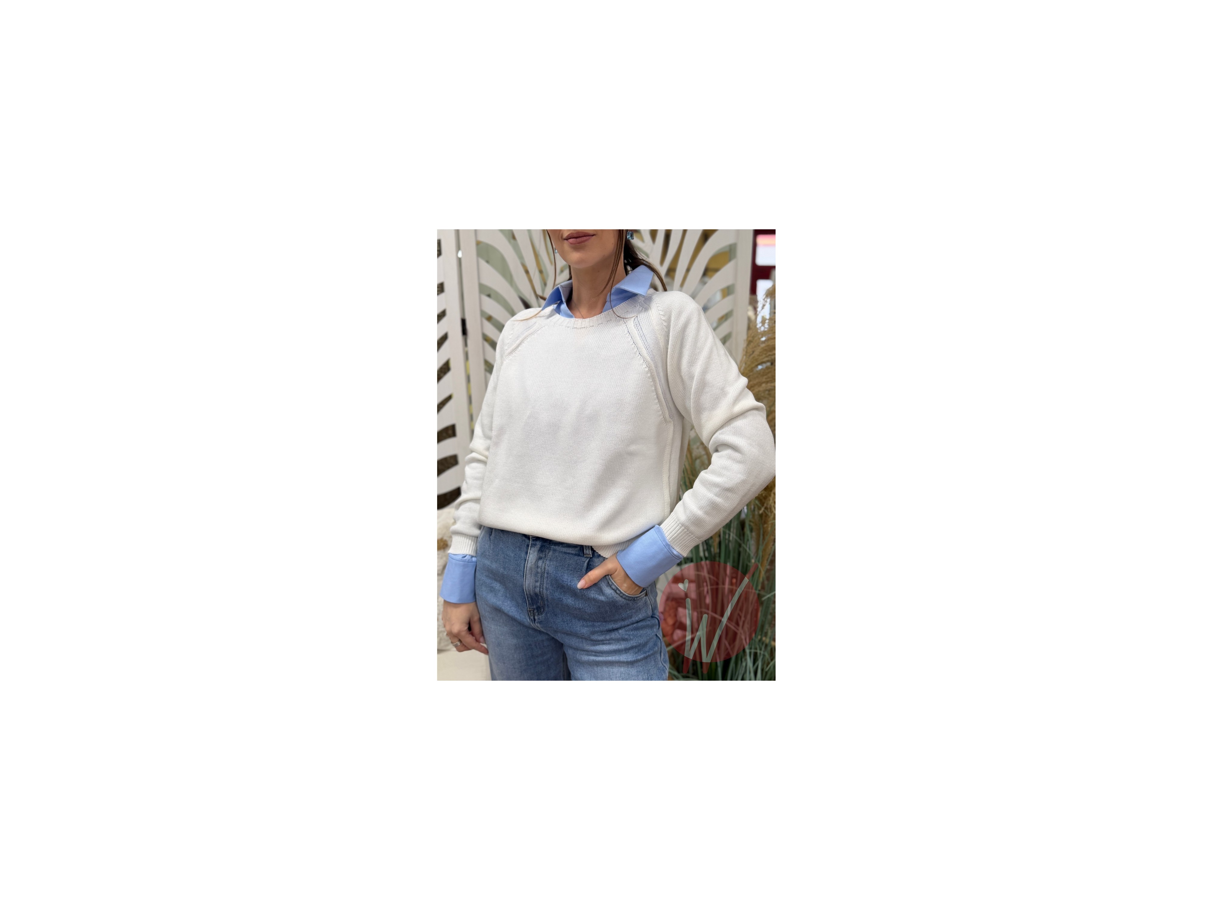 Maglia in cotone di qualità con manica raglan e profili in rilievo, con scollo ampio rifinito a costine.