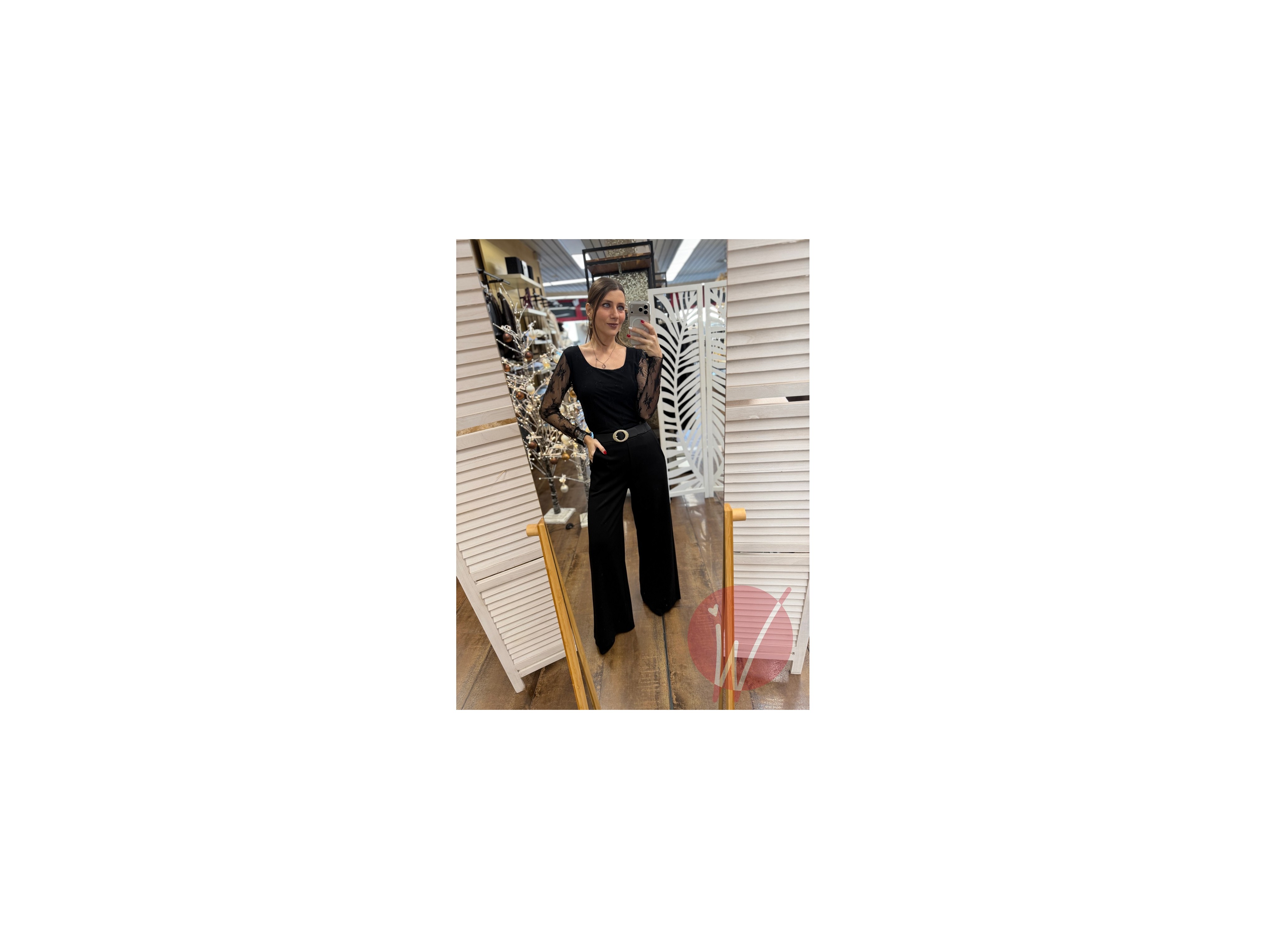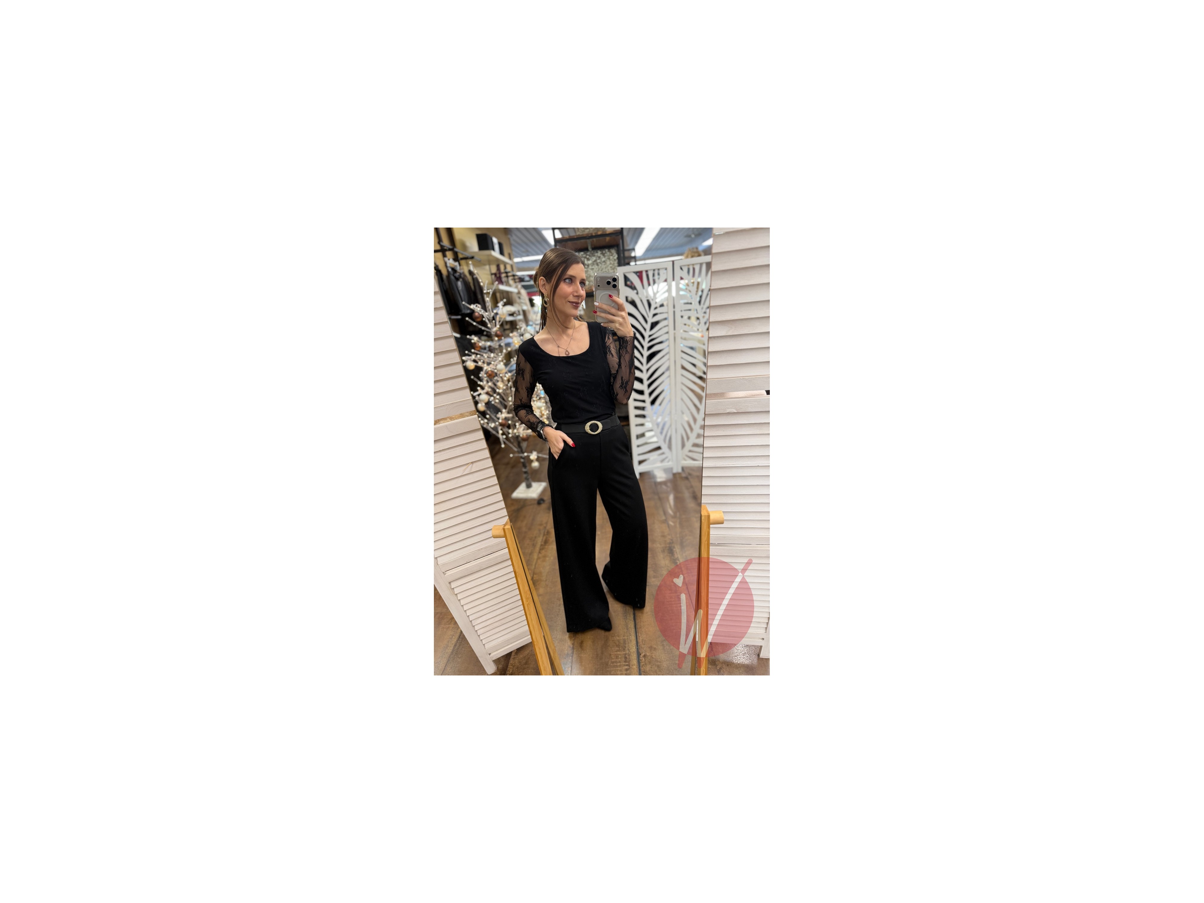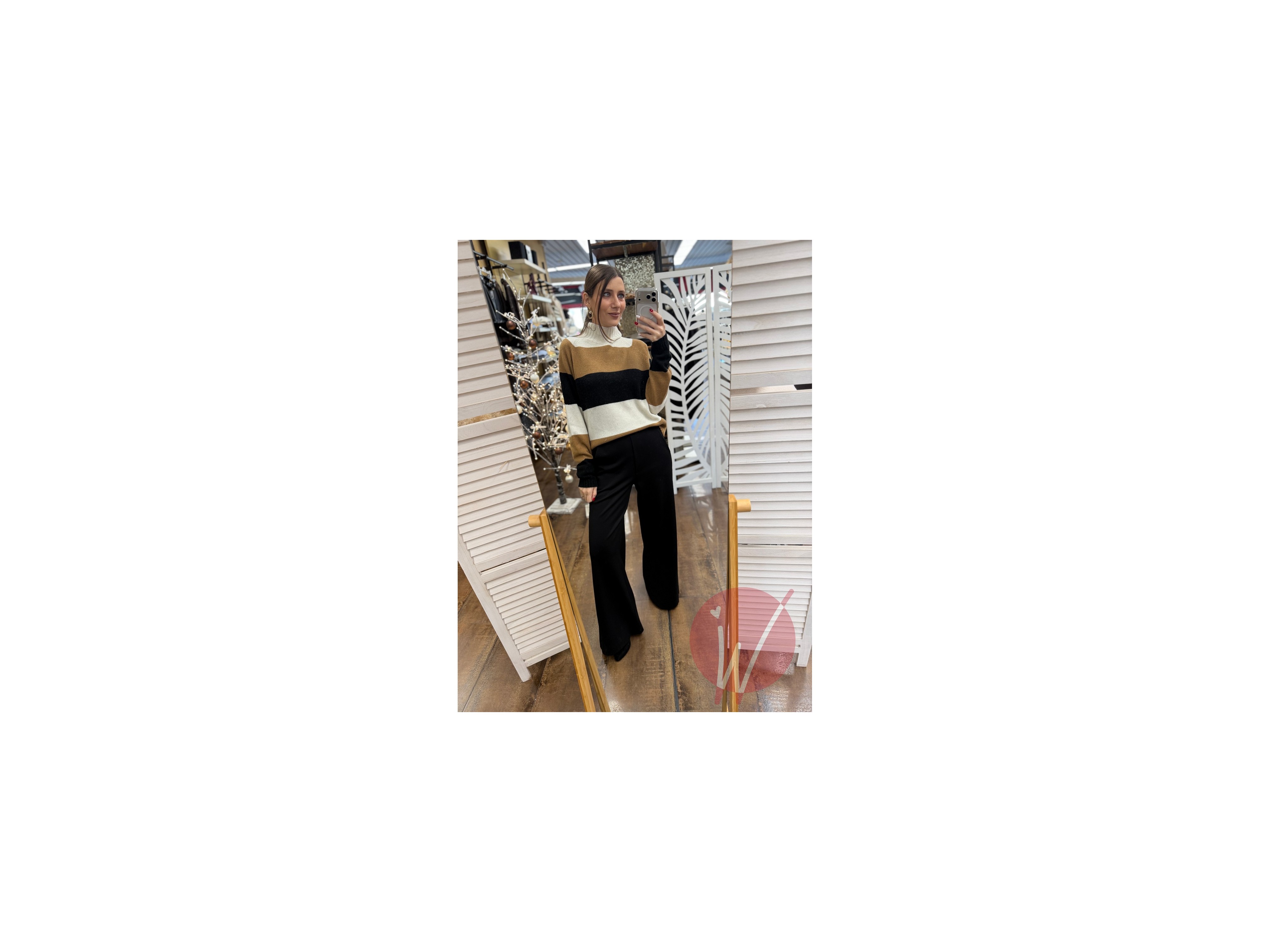 Pantalone a palazzo in viscosa, lavorazione in punto milano, con tasche laterali in piedi, elastico in vita.