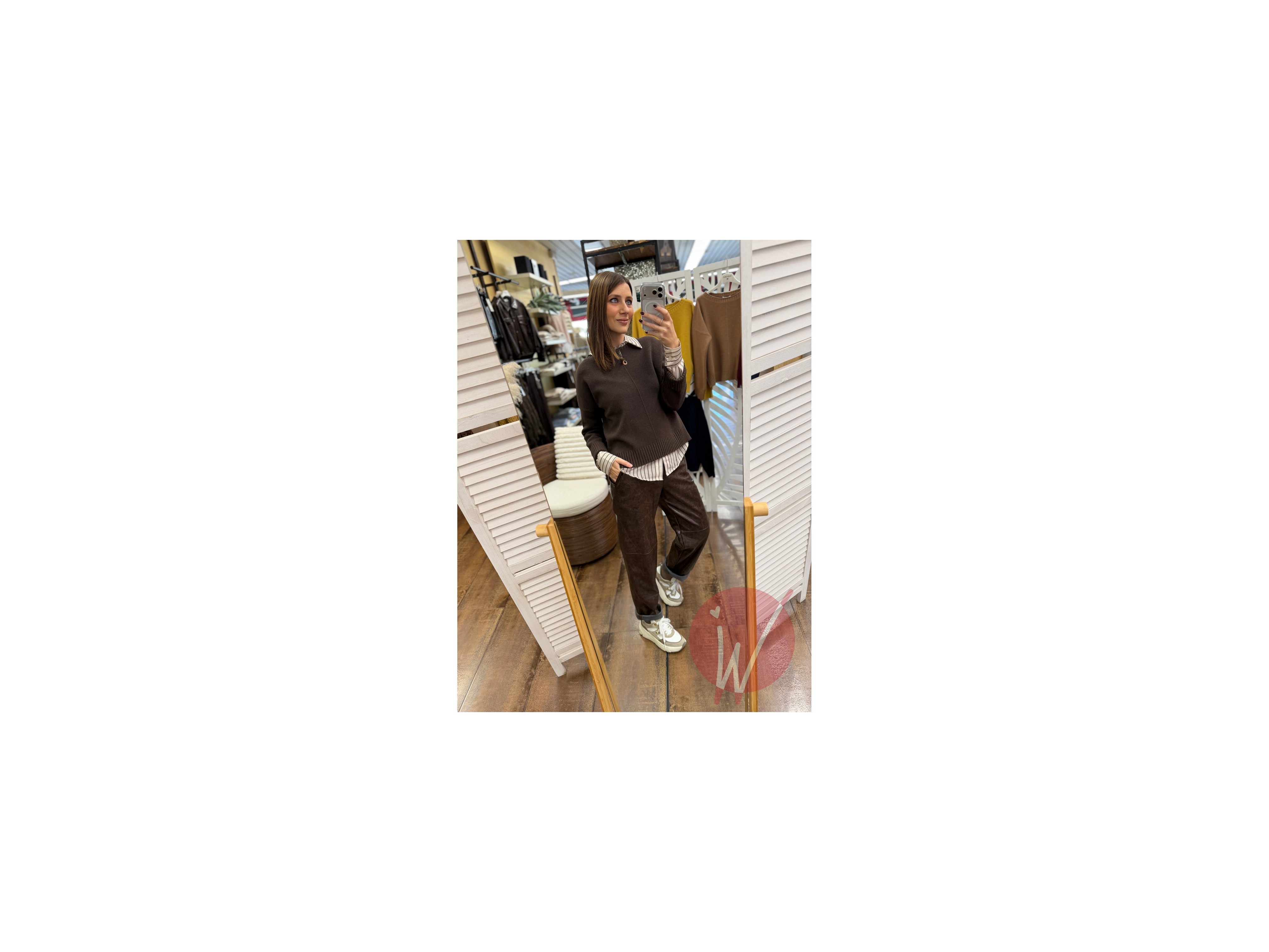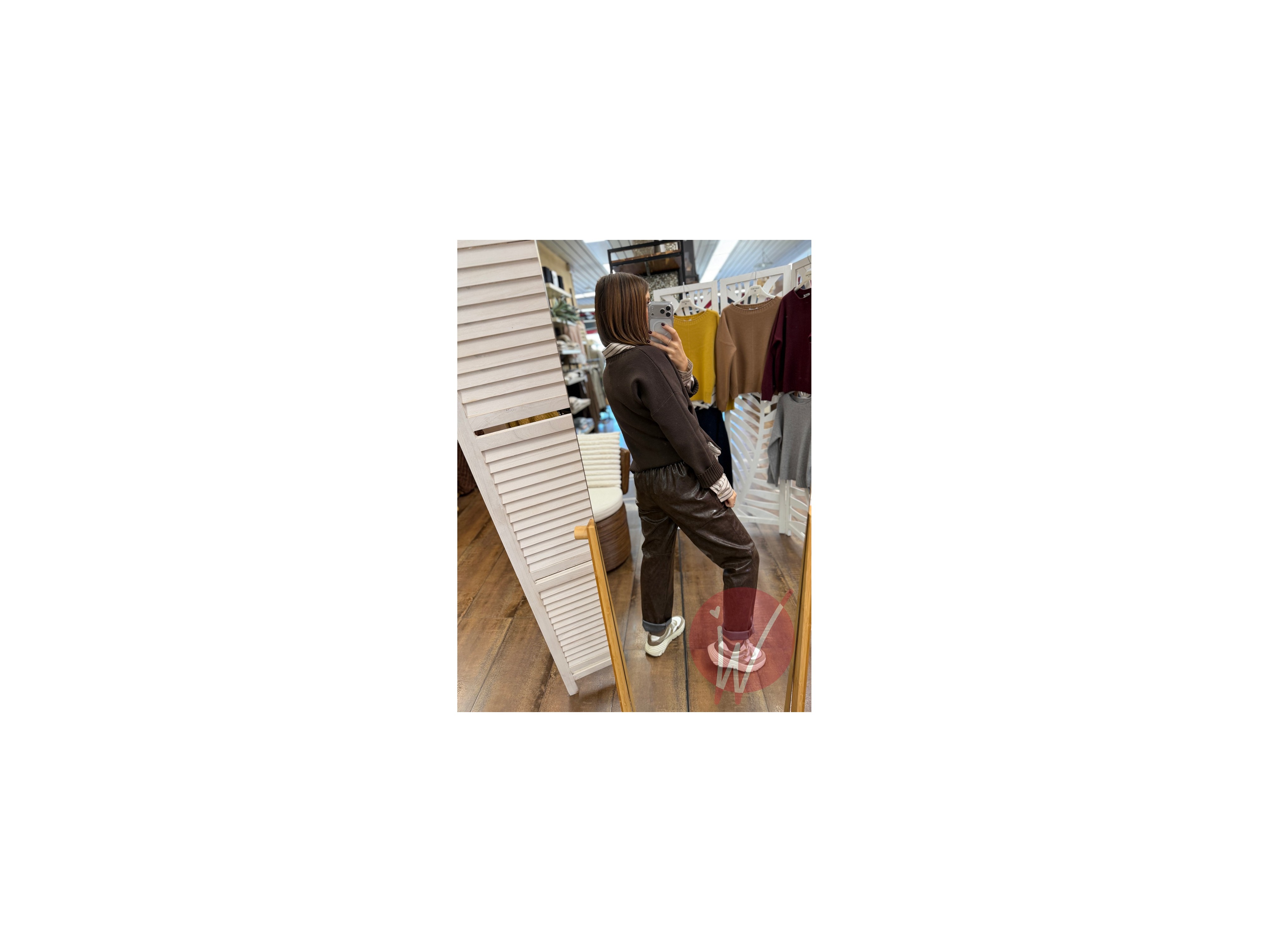 Pantalone ad ovetto in ecopelle spalmata effetto marmorizzato, con elastico in vita sul retro, tasche in piedi laterali, profilo in rilievo al ginocchio, tessuto scamosciato all'interno.
