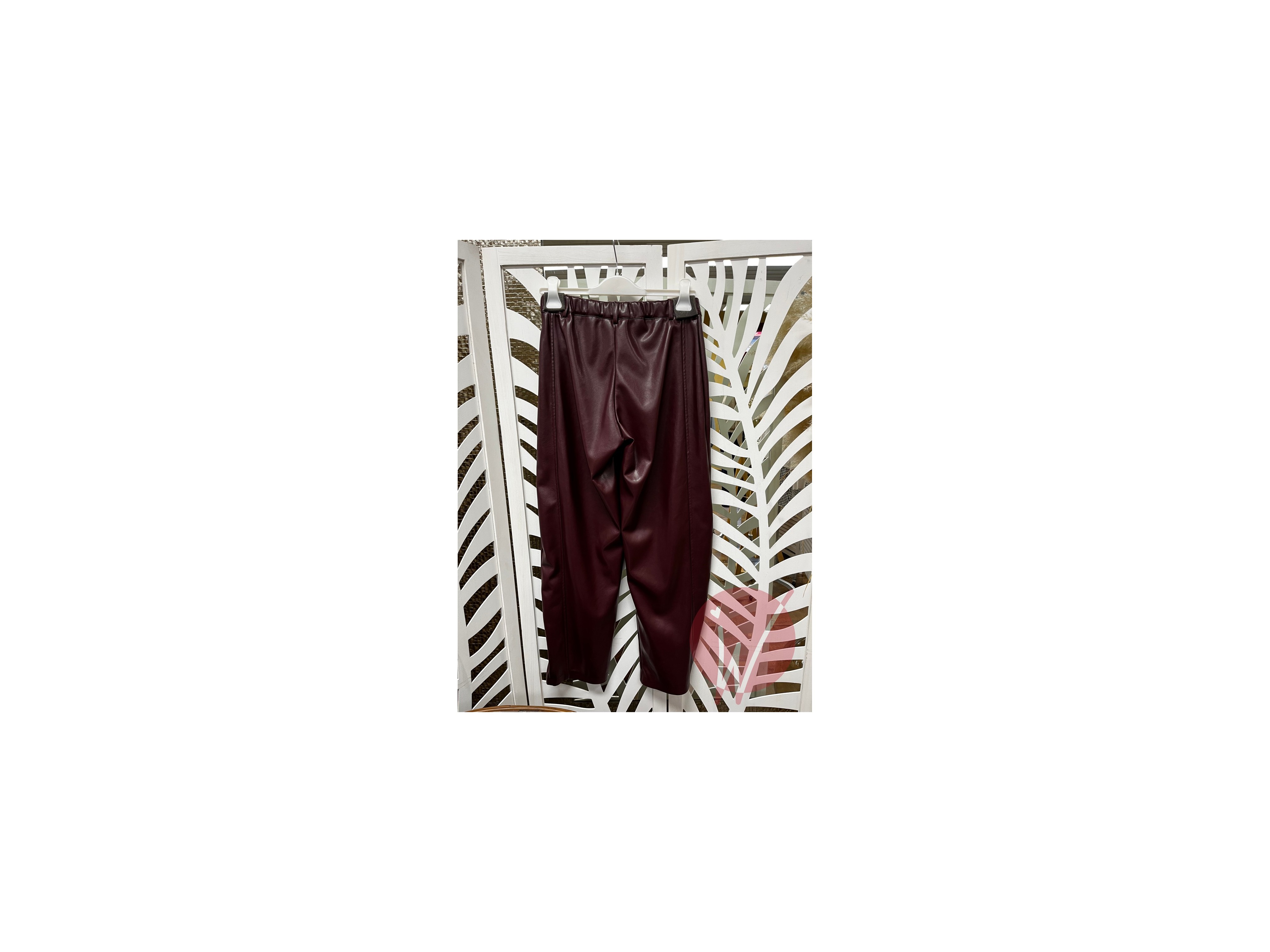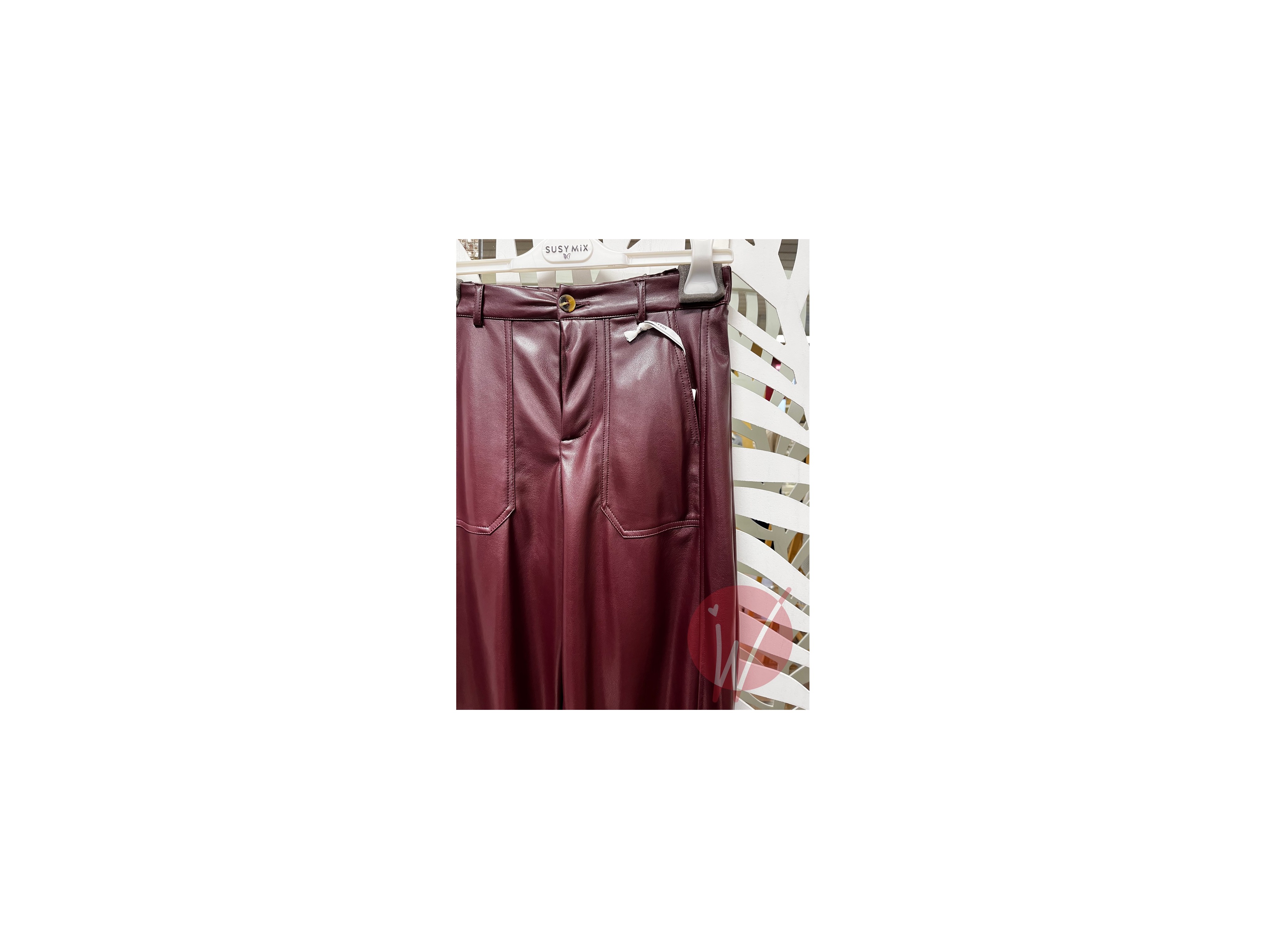 Pantalone in ecopelle, modello baggy, scamosciato caldo all'interno, con elastico in vita sul retro, chiusura con bottone e zip, tasche ampie davanti.