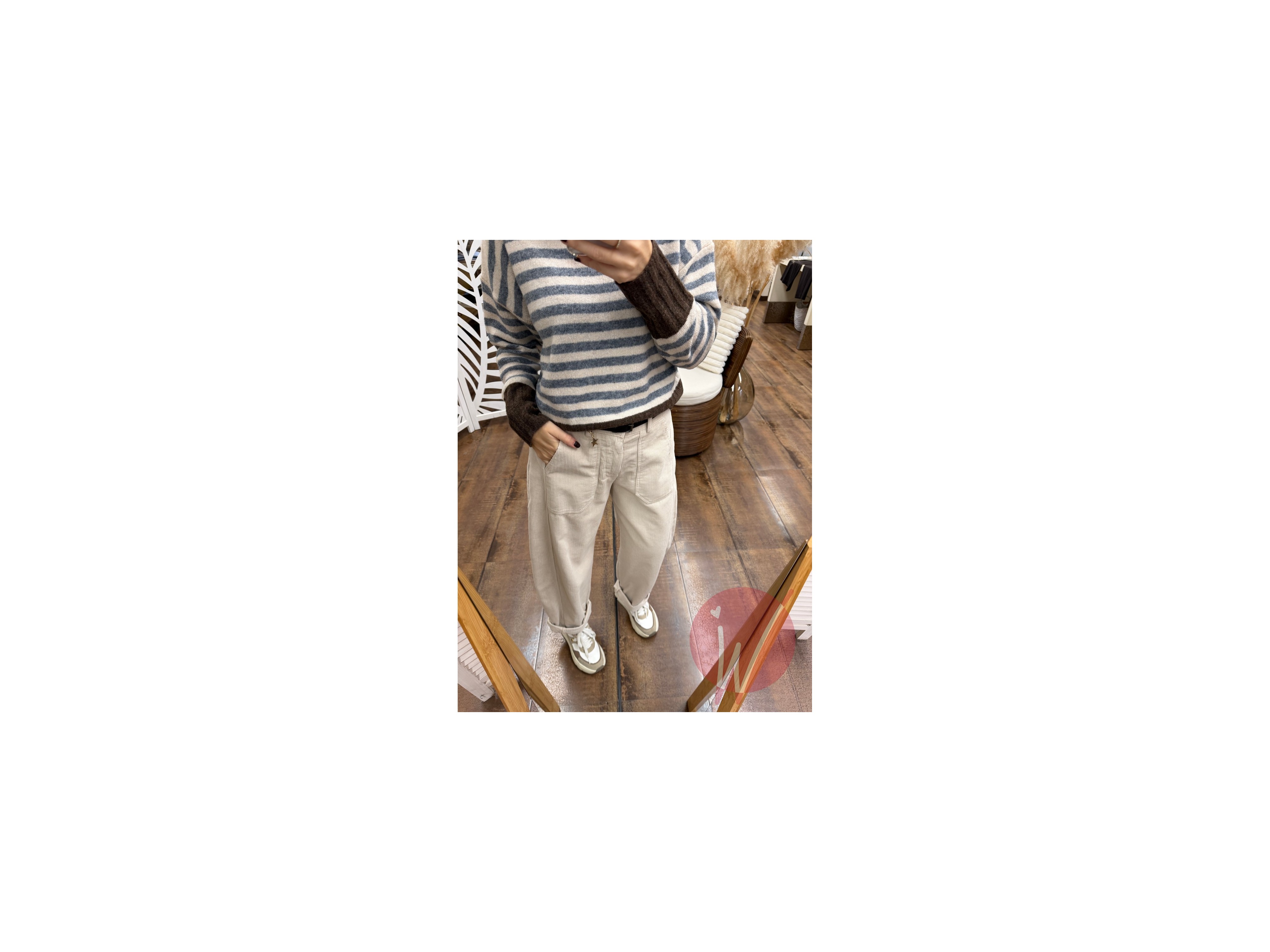 Pantalone modello baggy ad ovetto, in velluto millerighe, con tasche squadrate davanti, elastico in vita sul retro, chiusura con zip e bottone.